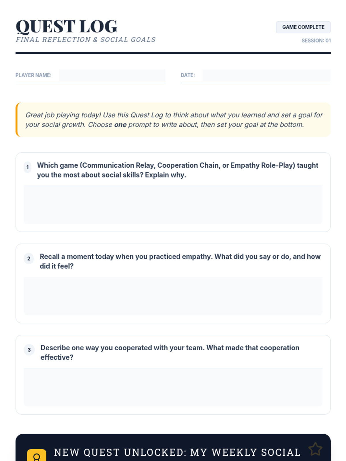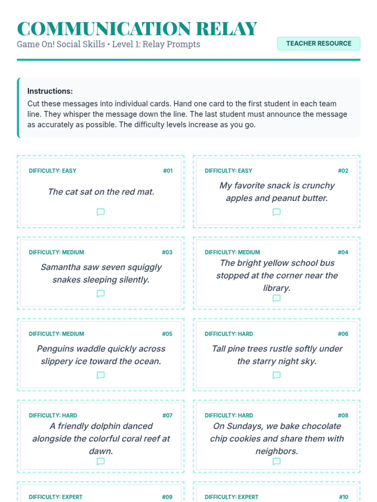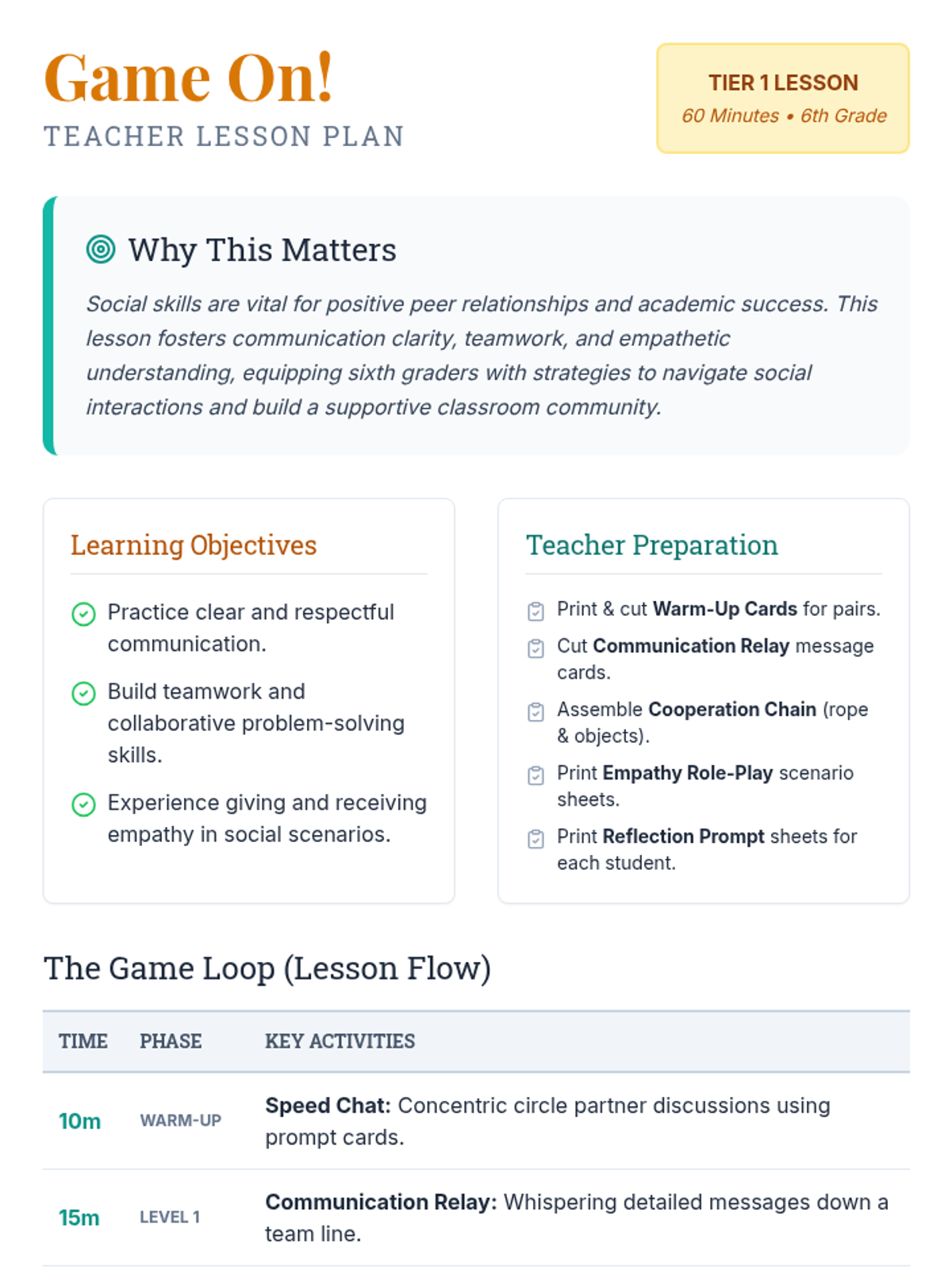 A 60-minute interactive lesson for 6th graders to practice communication, cooperation, and empathy through engaging classroom games. Students move through a series of 'levels' that build social-emotional skills in a fun, active environment.