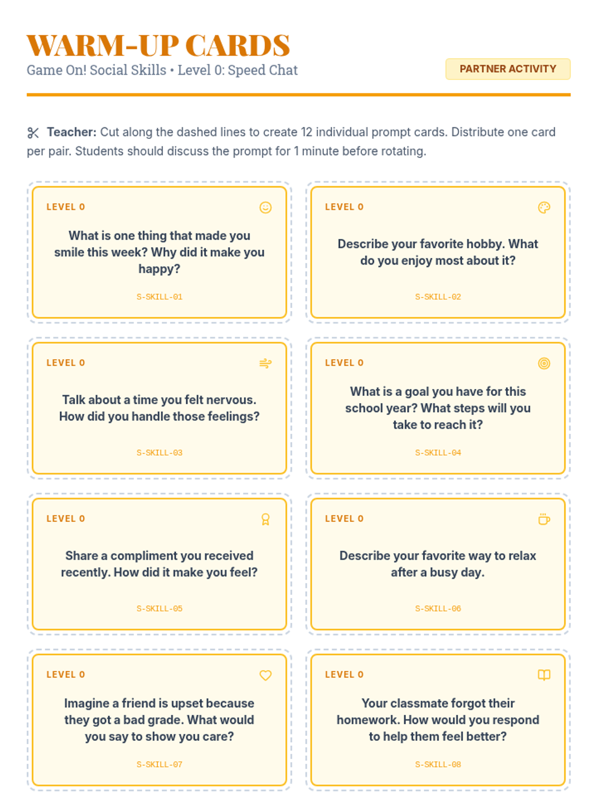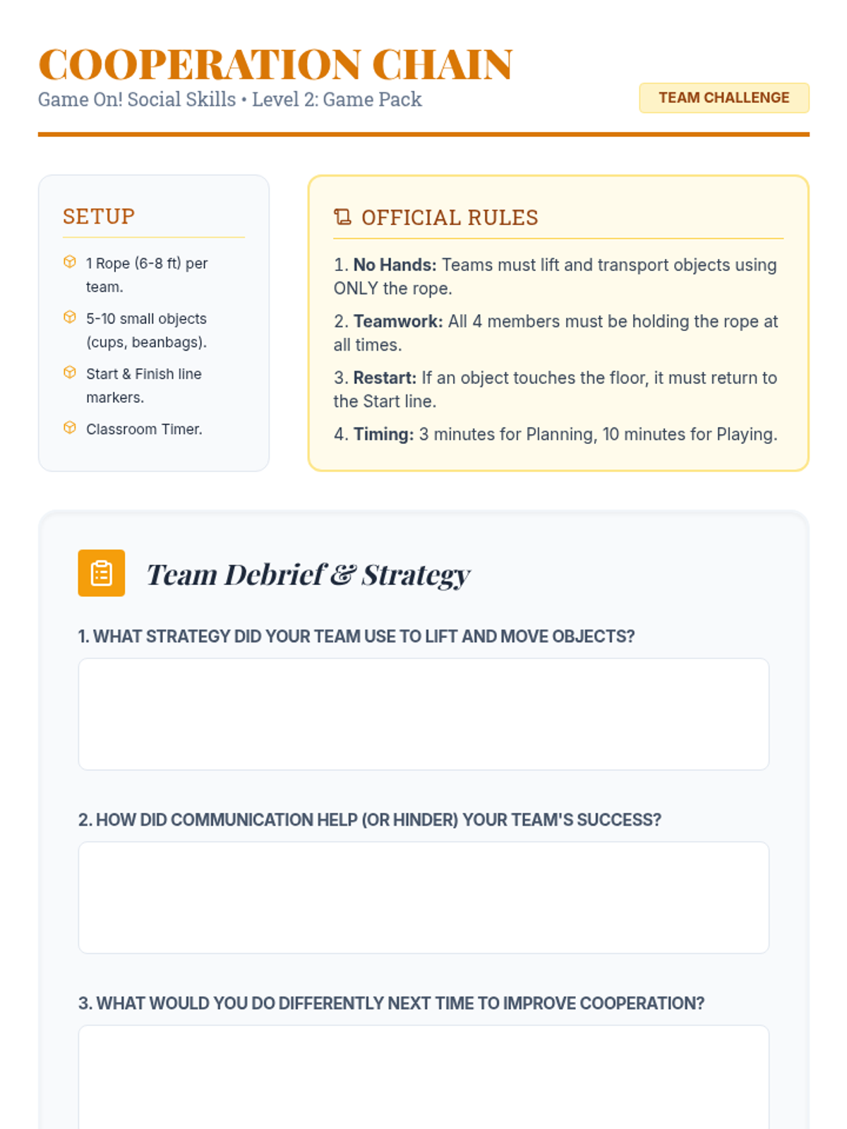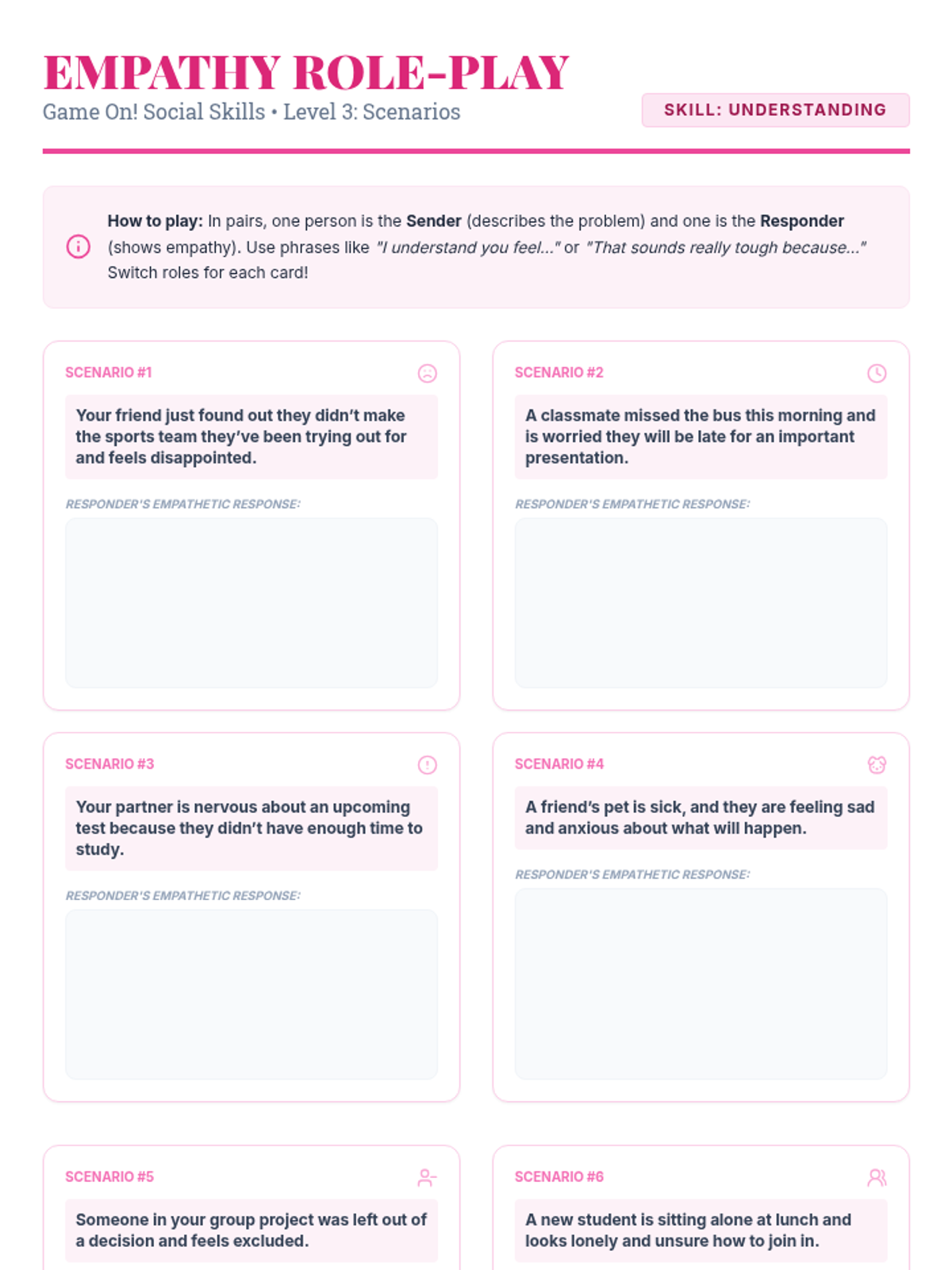 A 60-minute interactive lesson for 6th graders to practice communication, cooperation, and empathy through engaging classroom games. Students move through a series of 'levels' that build social-emotional skills in a fun, active environment.