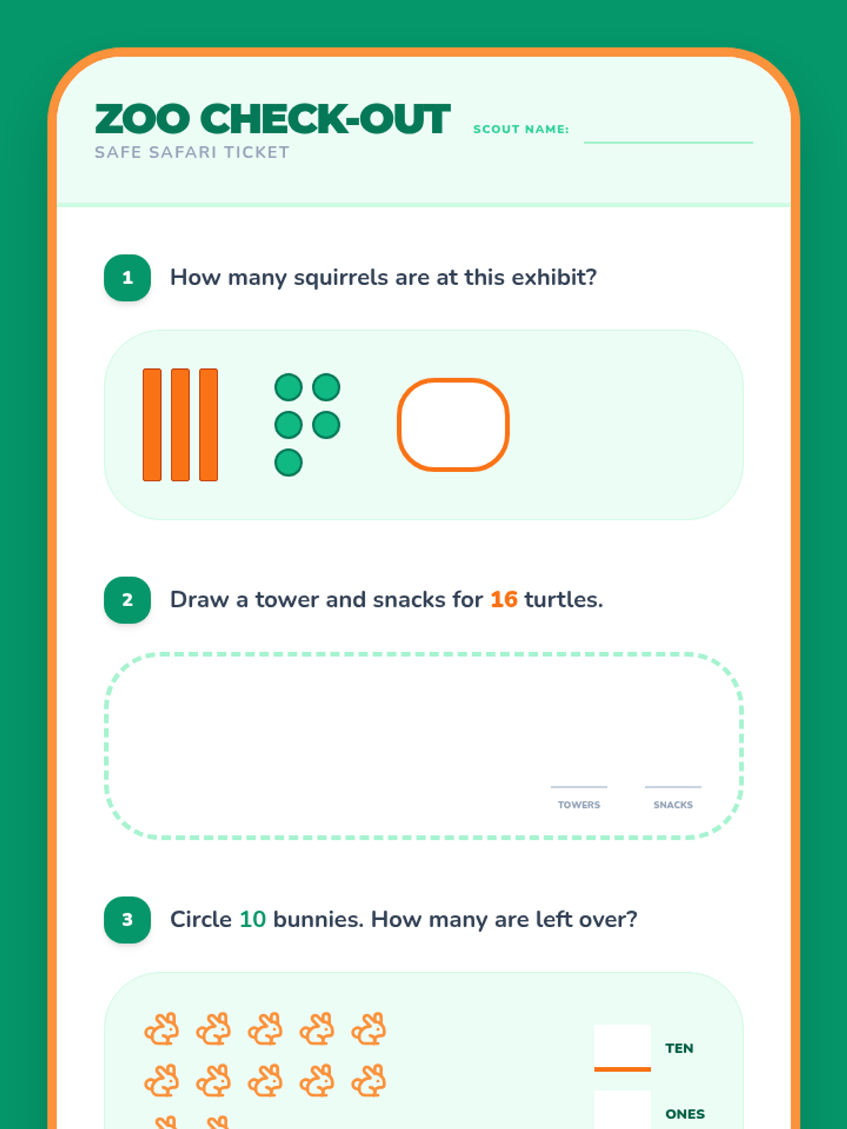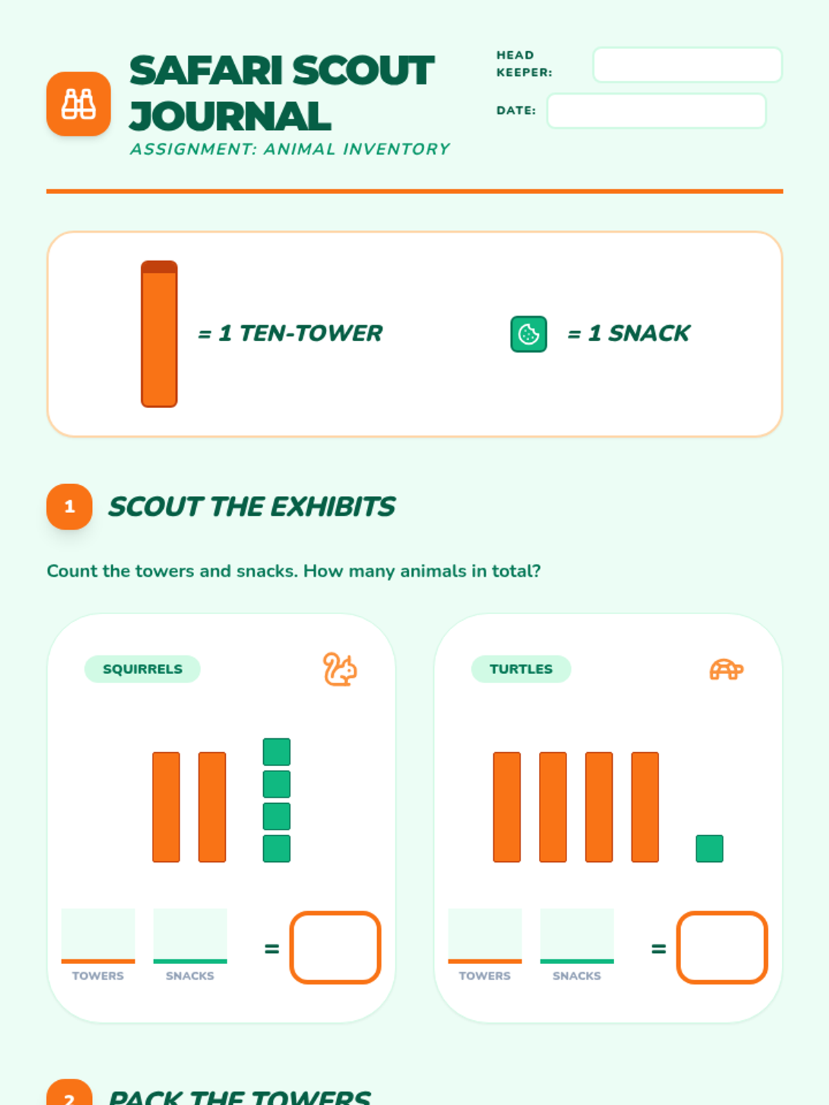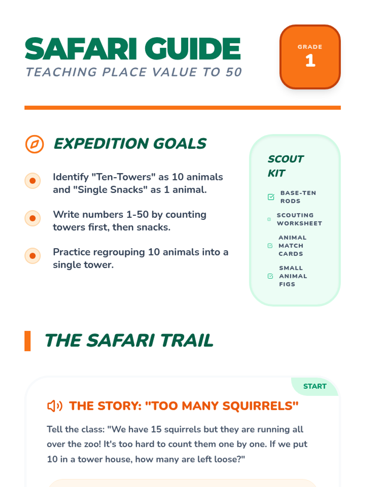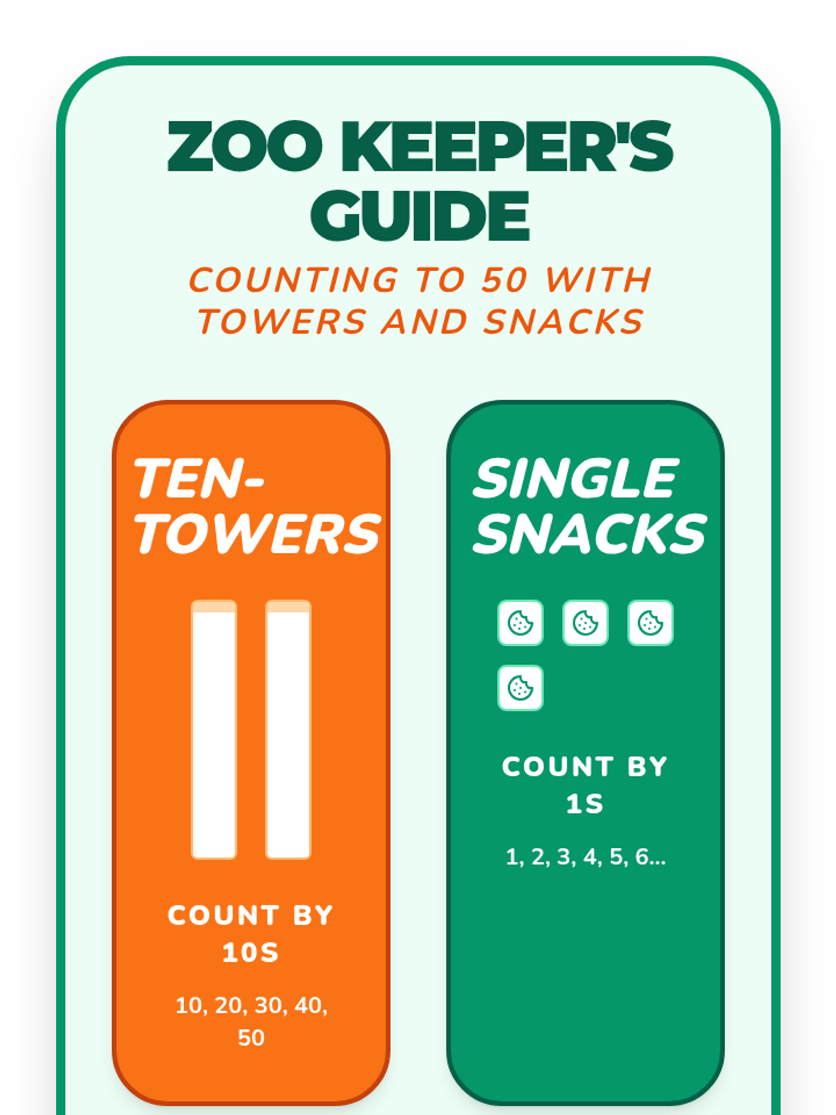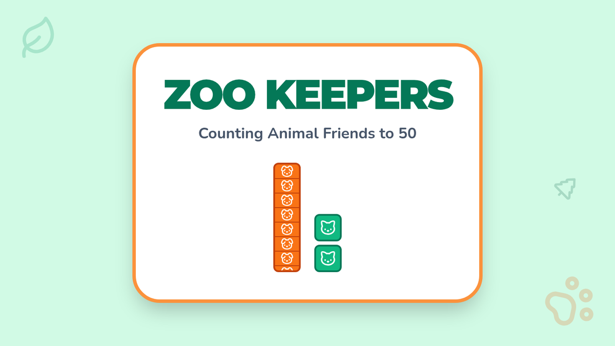 An animal-themed foundational lesson on place value up to 50. Students help zoo keepers count their animals by grouping them into "Ten-Towers" and "Single Snacks," making place value concrete and engaging for young learners.