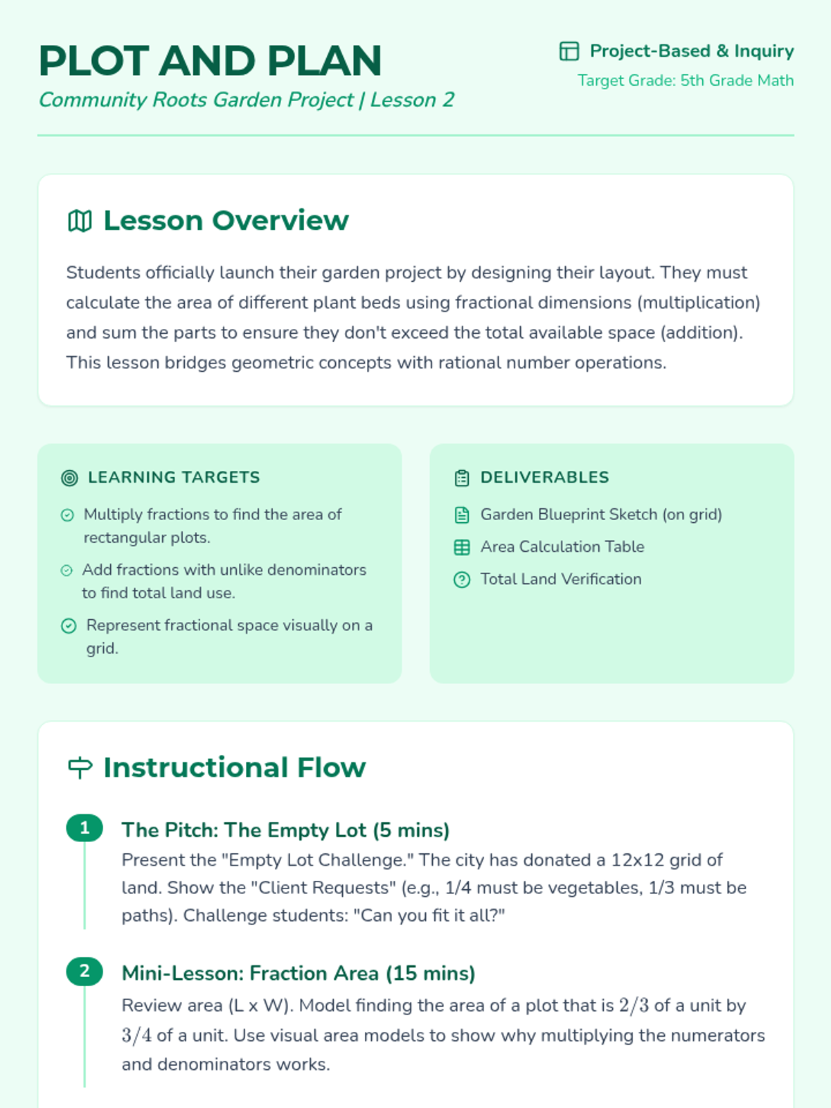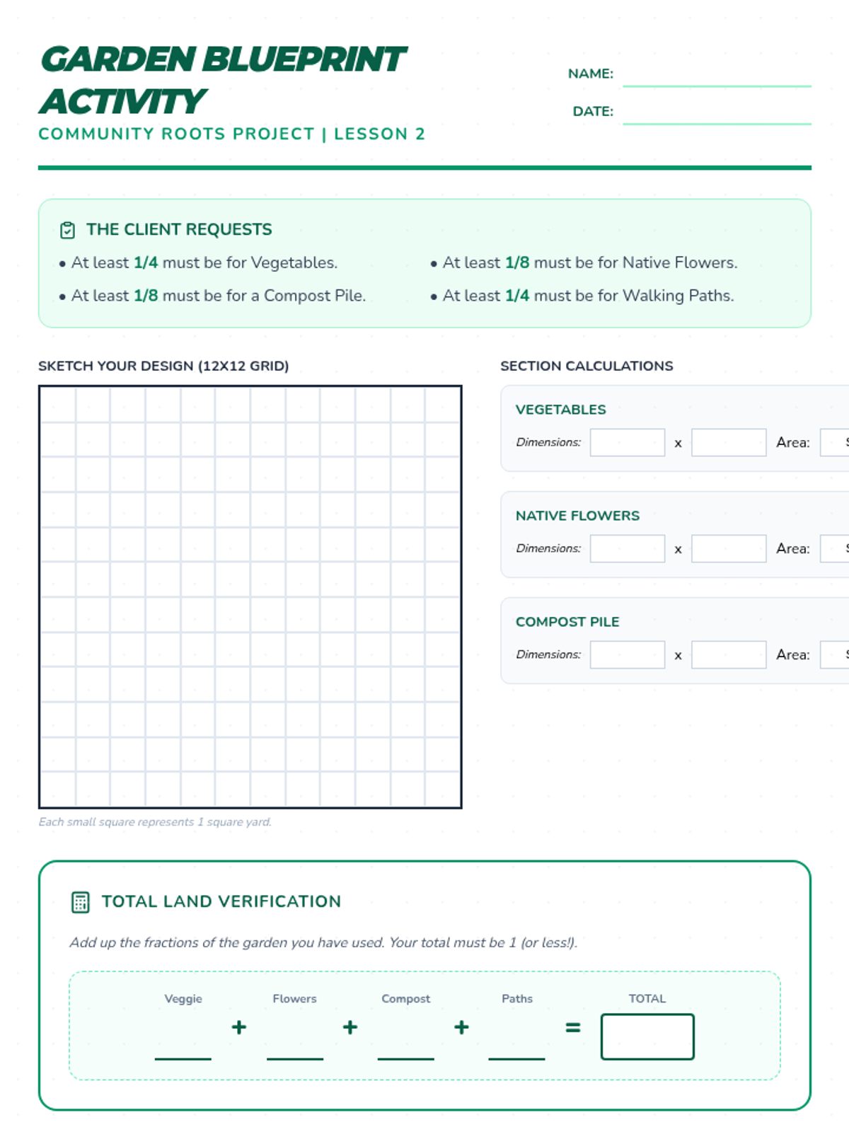 Students begin their garden project by calculating areas and ensuring fractional land use fits the available plot.
