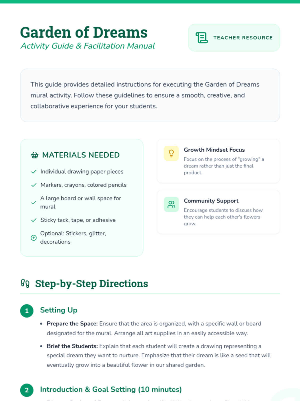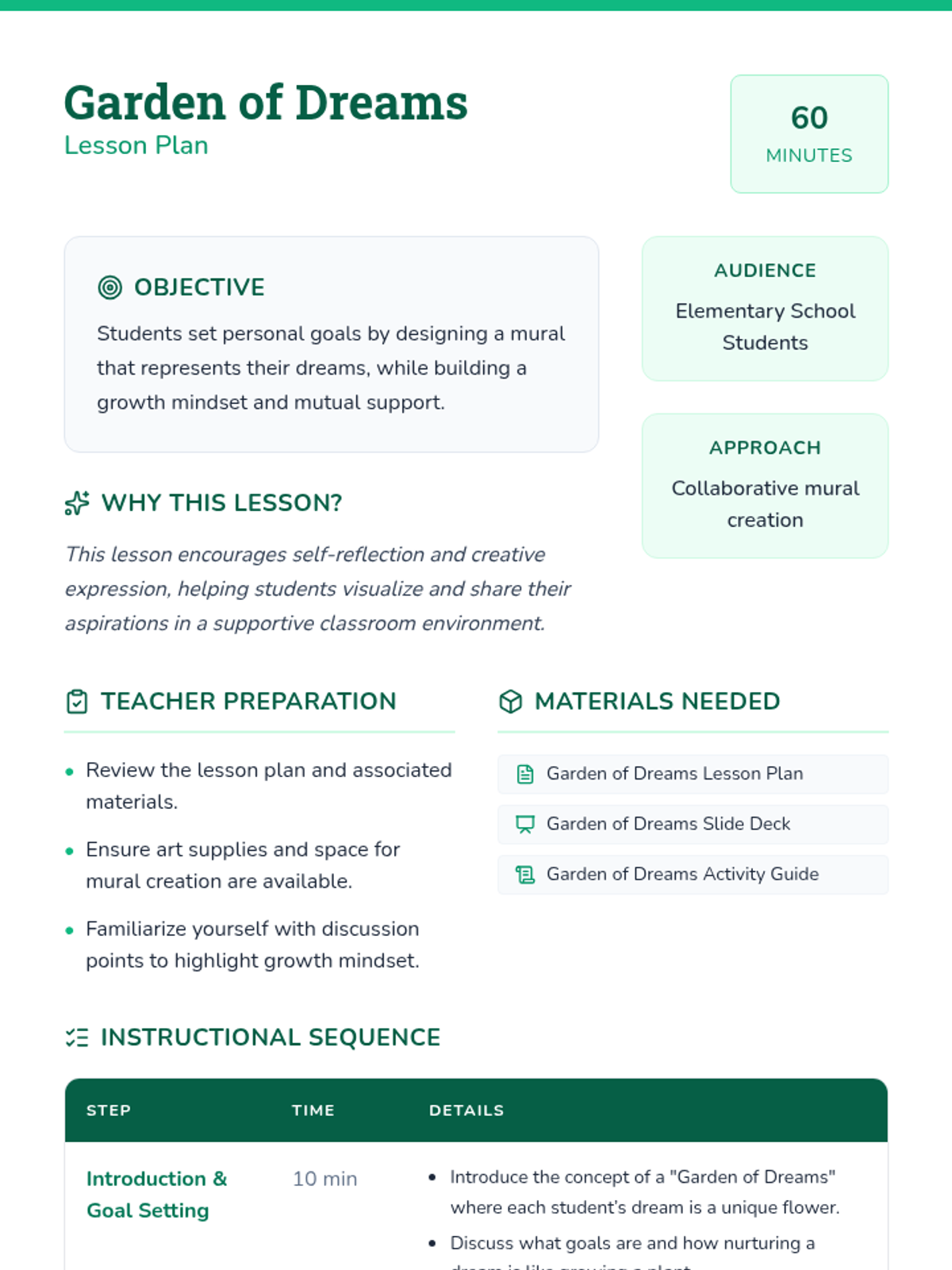 A collaborative mural-based lesson for elementary students focused on setting goals, fostering a growth mindset, and sharing aspirations through creative art.