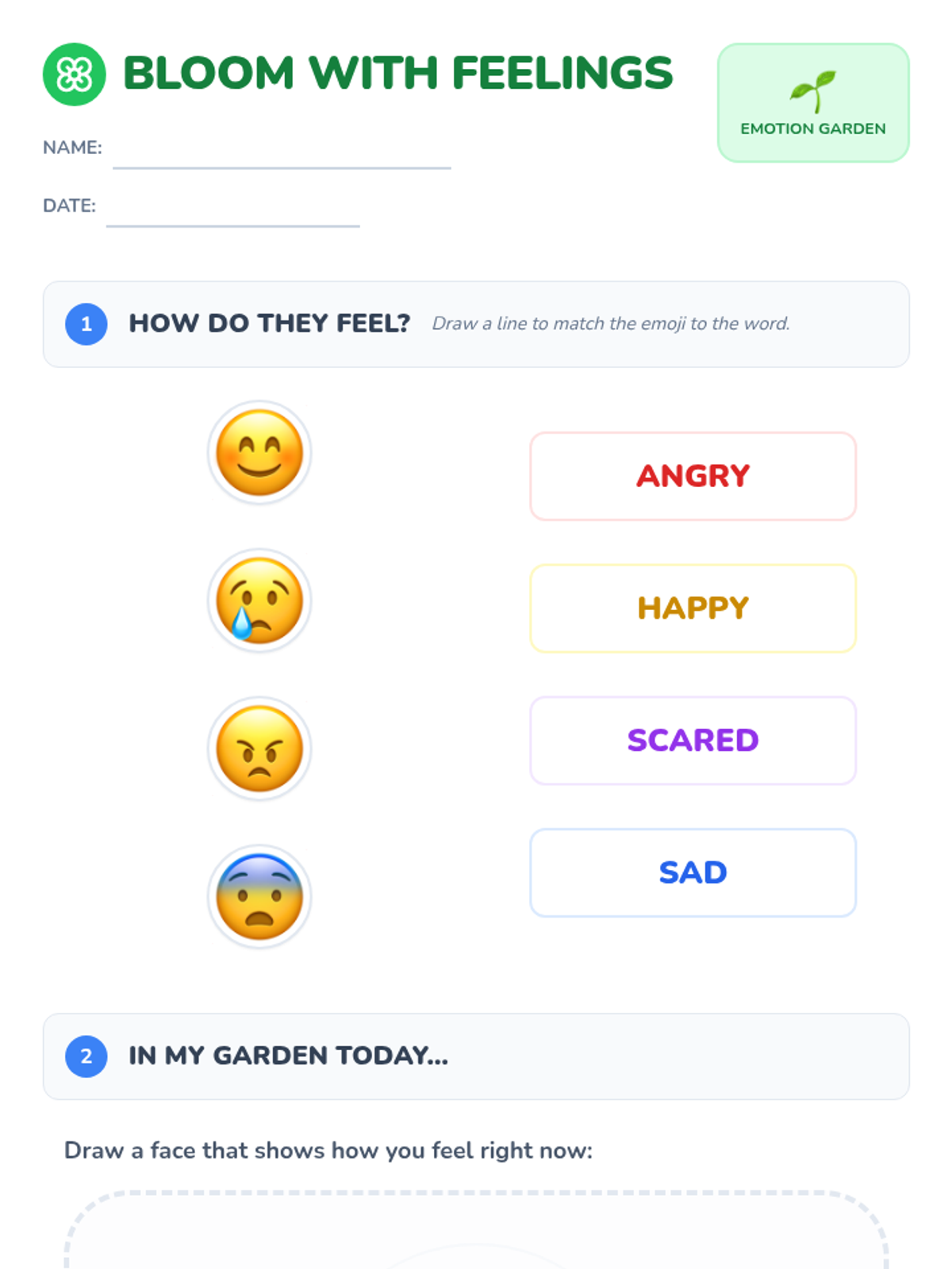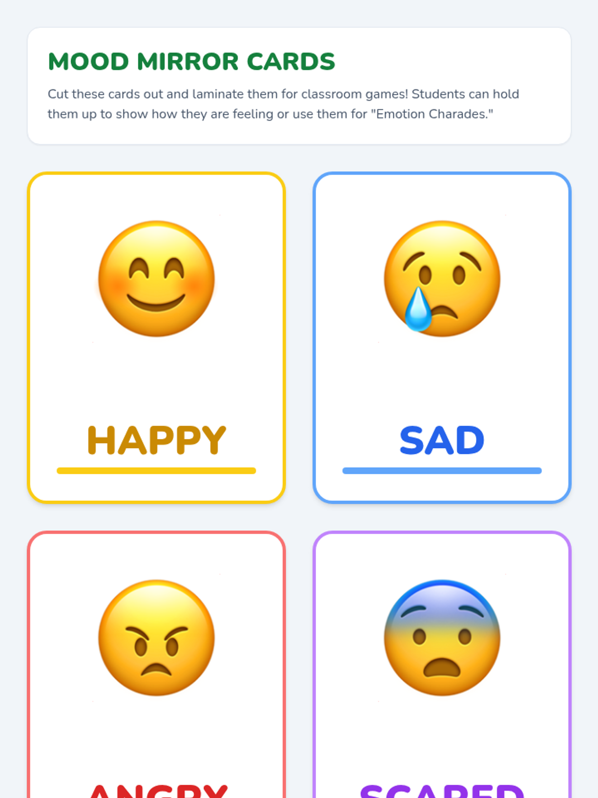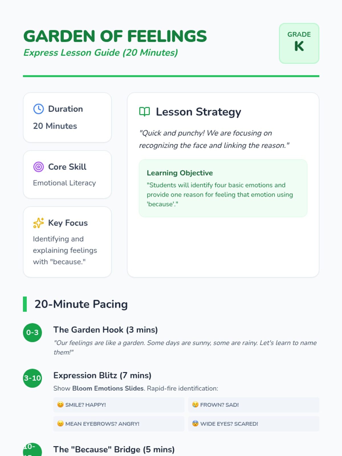 A gentle, interactive introduction to identifying core emotions (happy, sad, angry, scared) and using 'because' to explain feelings. Students will learn to read facial expressions and associate emotions with specific situations.