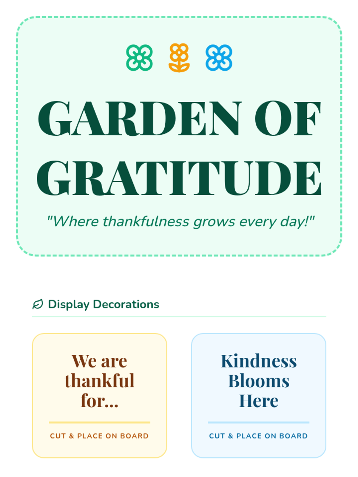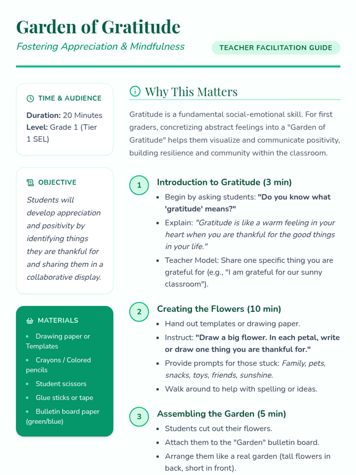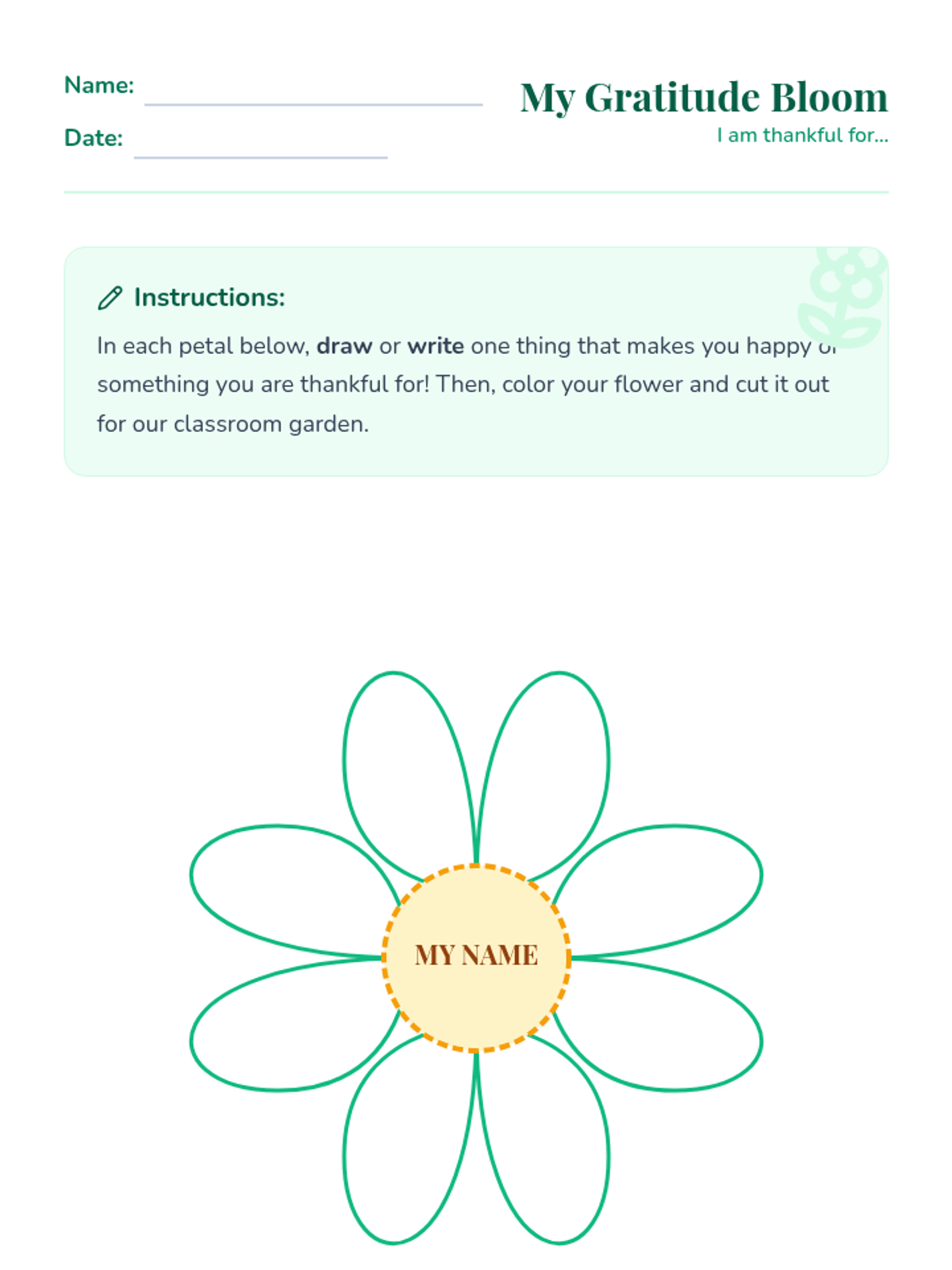 A social-emotional learning lesson for Grade 1 students to explore gratitude by creating a collaborative 'Garden of Gratitude' display. Students reflect on things they are thankful for and visualize them as petals on a flower.