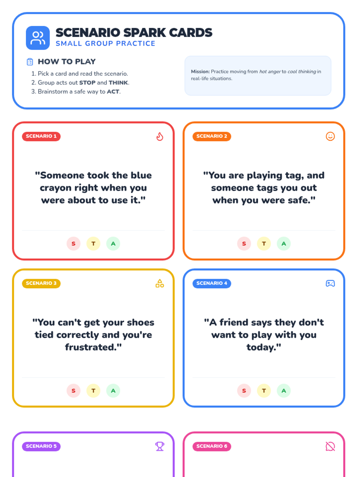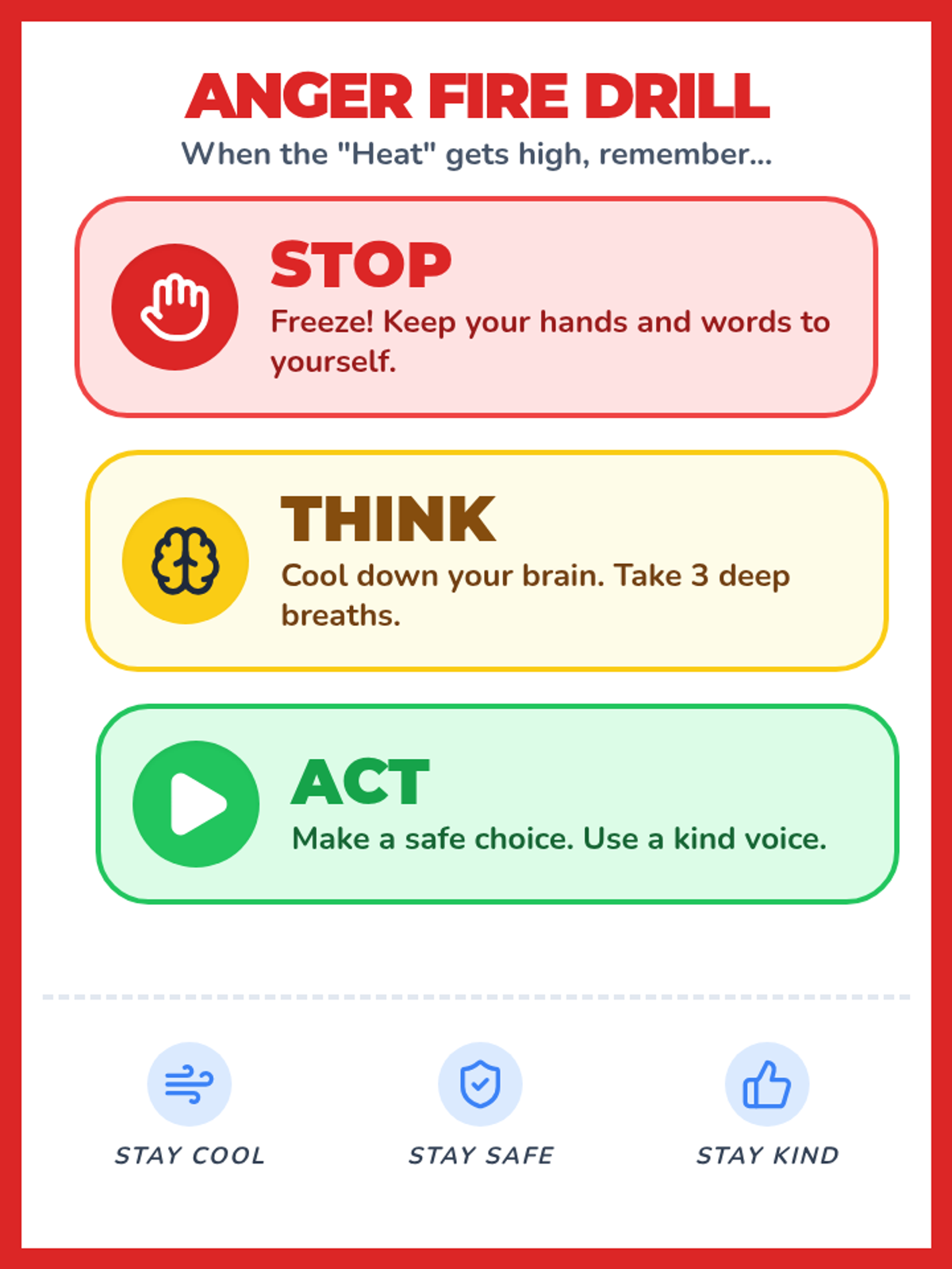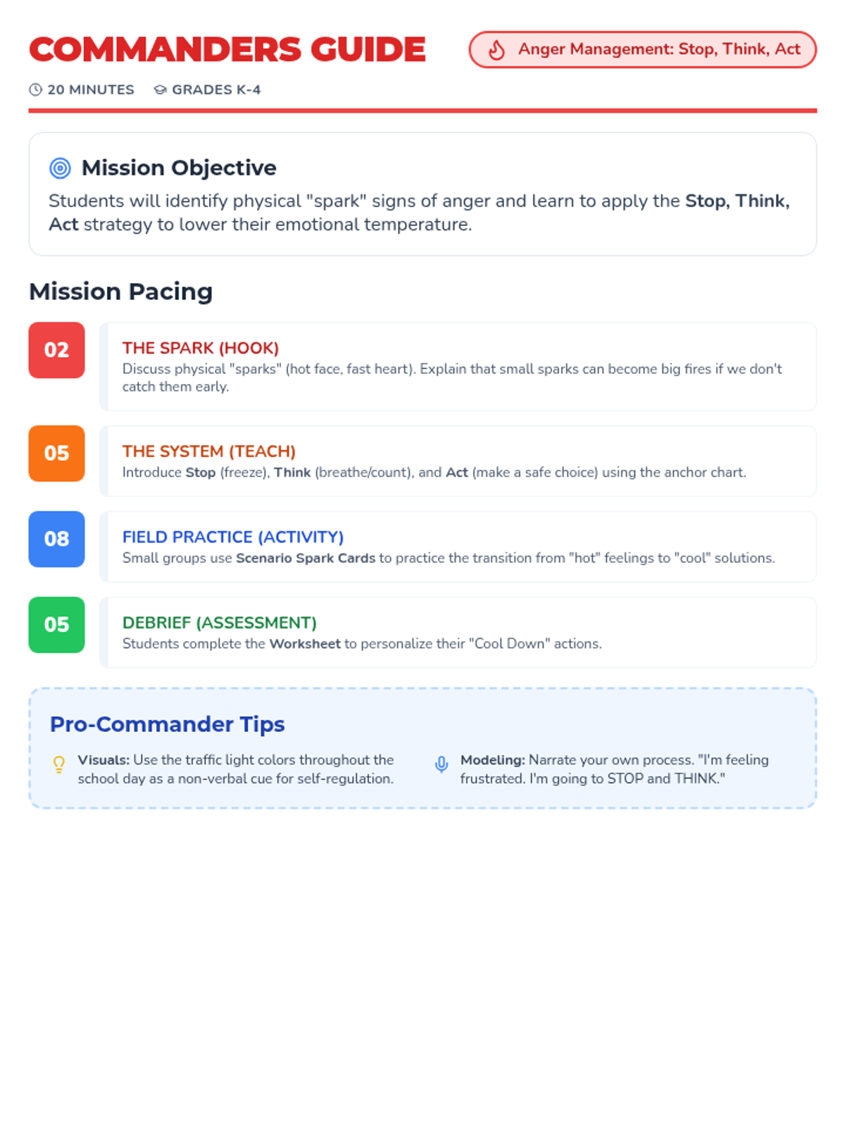 A 20-minute social-emotional learning lesson for grades K-4 focused on the 'Stop, Think, Act' strategy for managing anger and high-energy emotions.