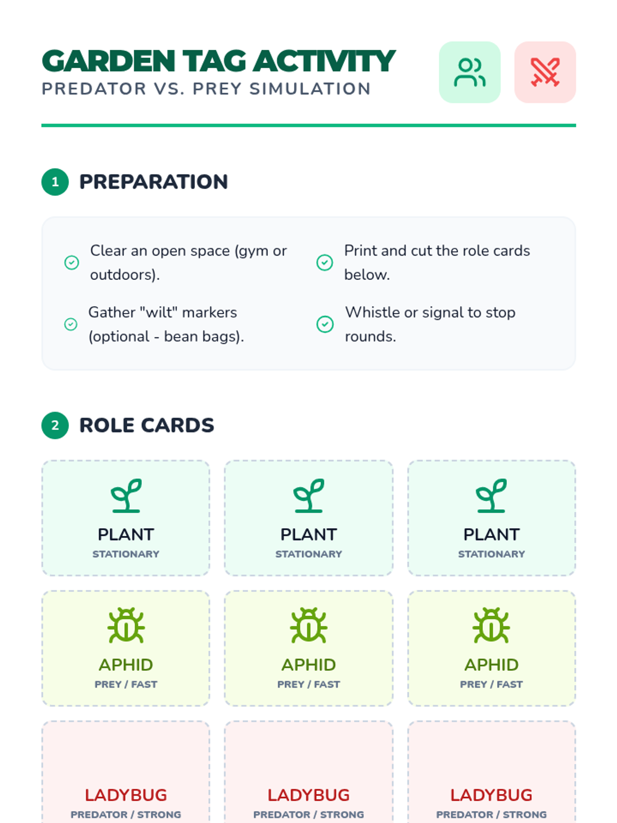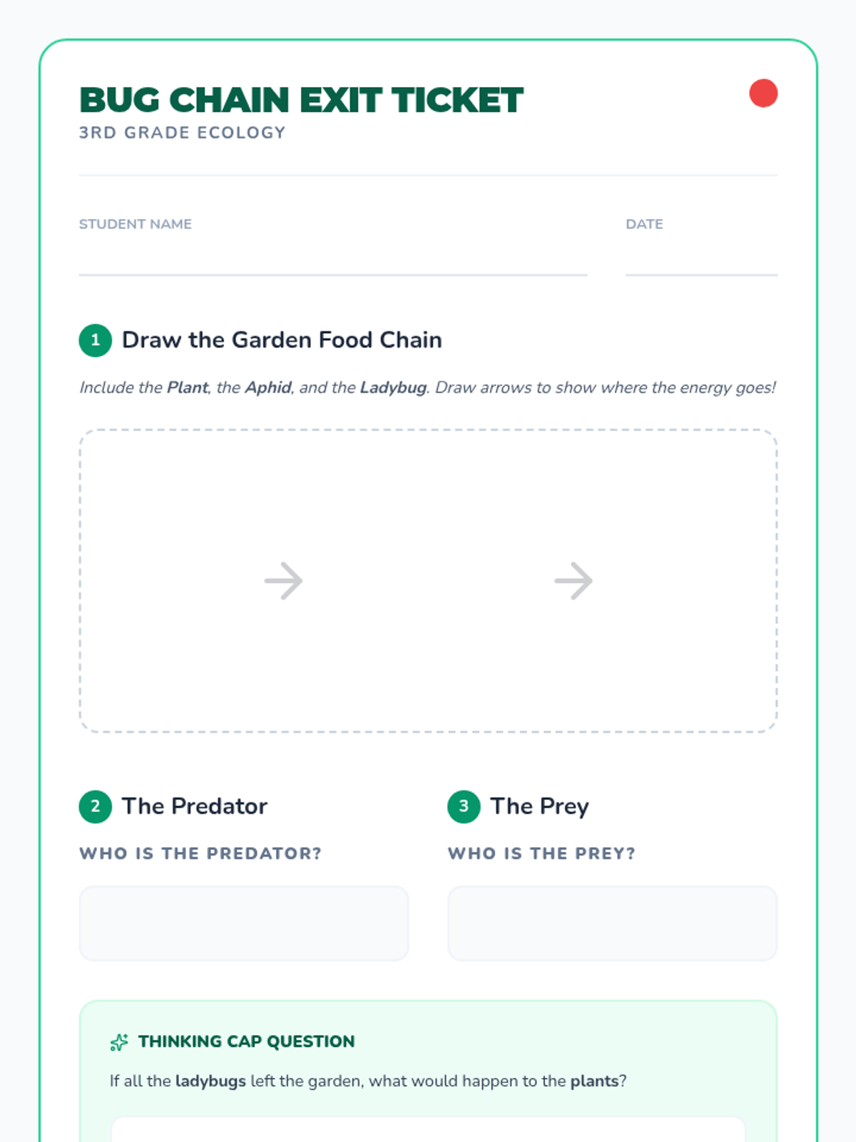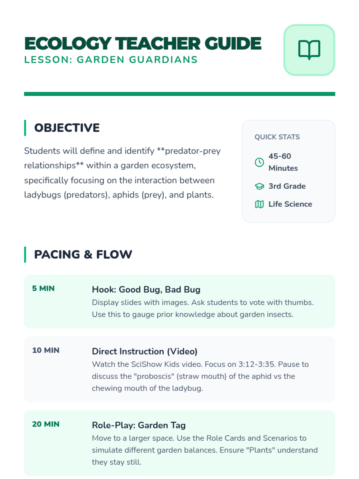 A 3rd-grade ecology lesson exploring predator-prey dynamics in a garden ecosystem using the relationship between ladybugs, aphids, and plants. Students participate in a movement-based simulation to understand population balance.