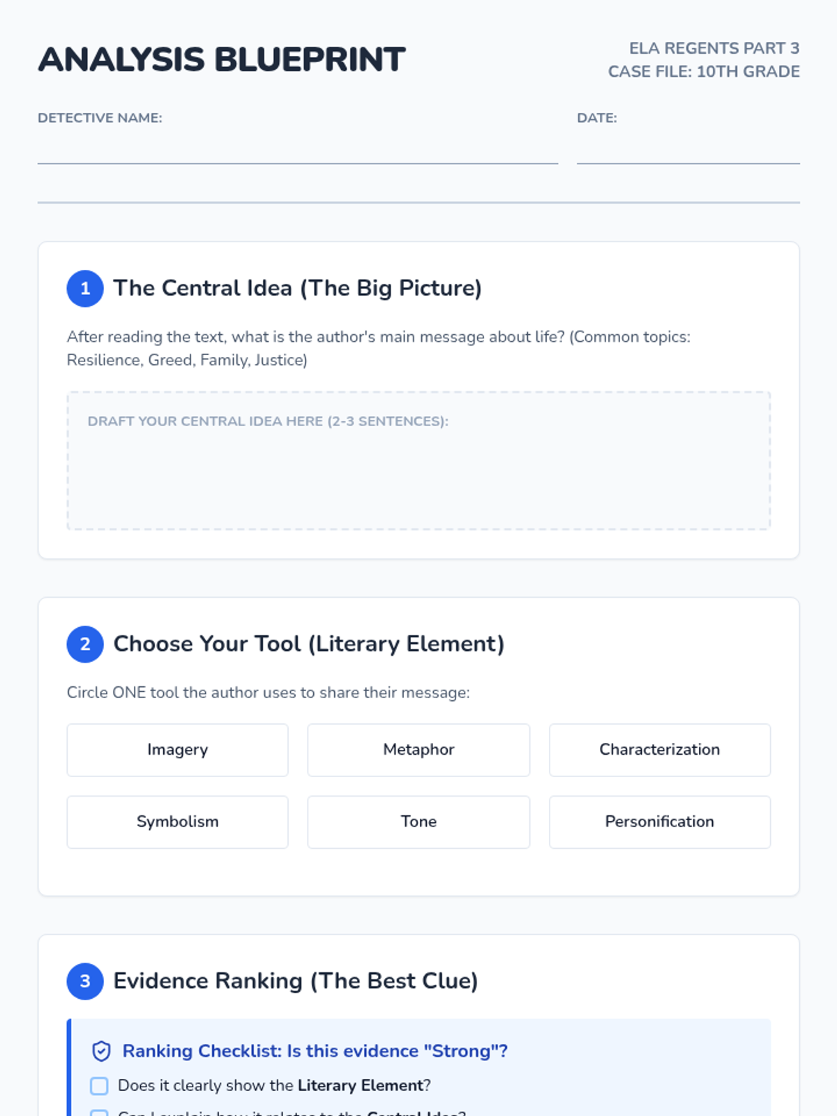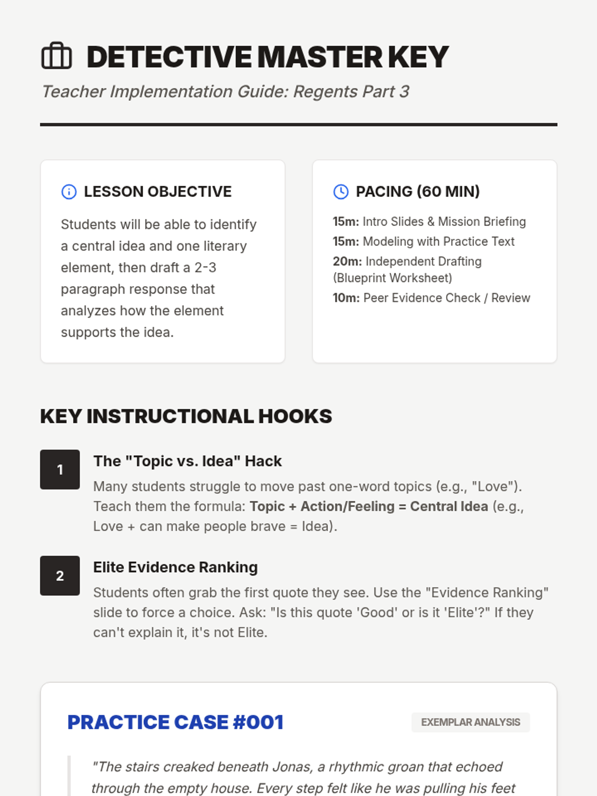 A targeted Regents Part 3 preparation lesson focusing on evidence selection and analysis through a 'detective' lens, specifically designed for students requiring high levels of scaffolding.