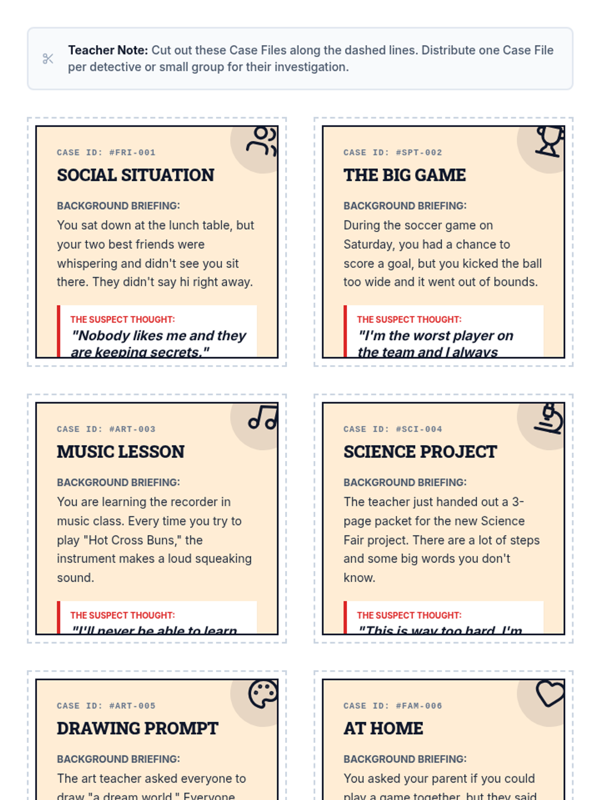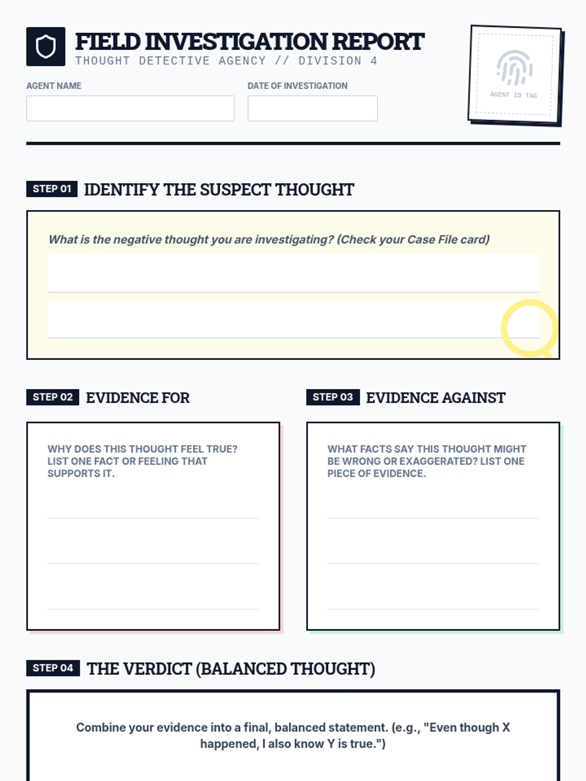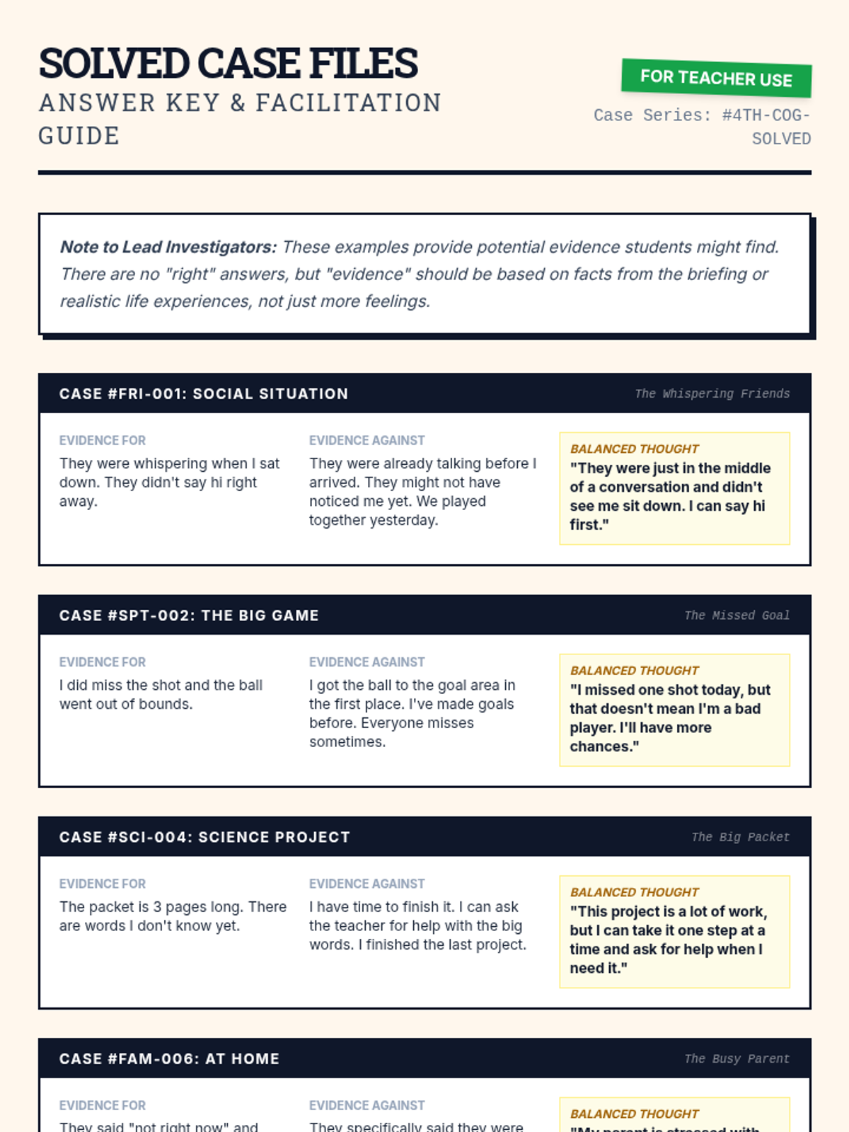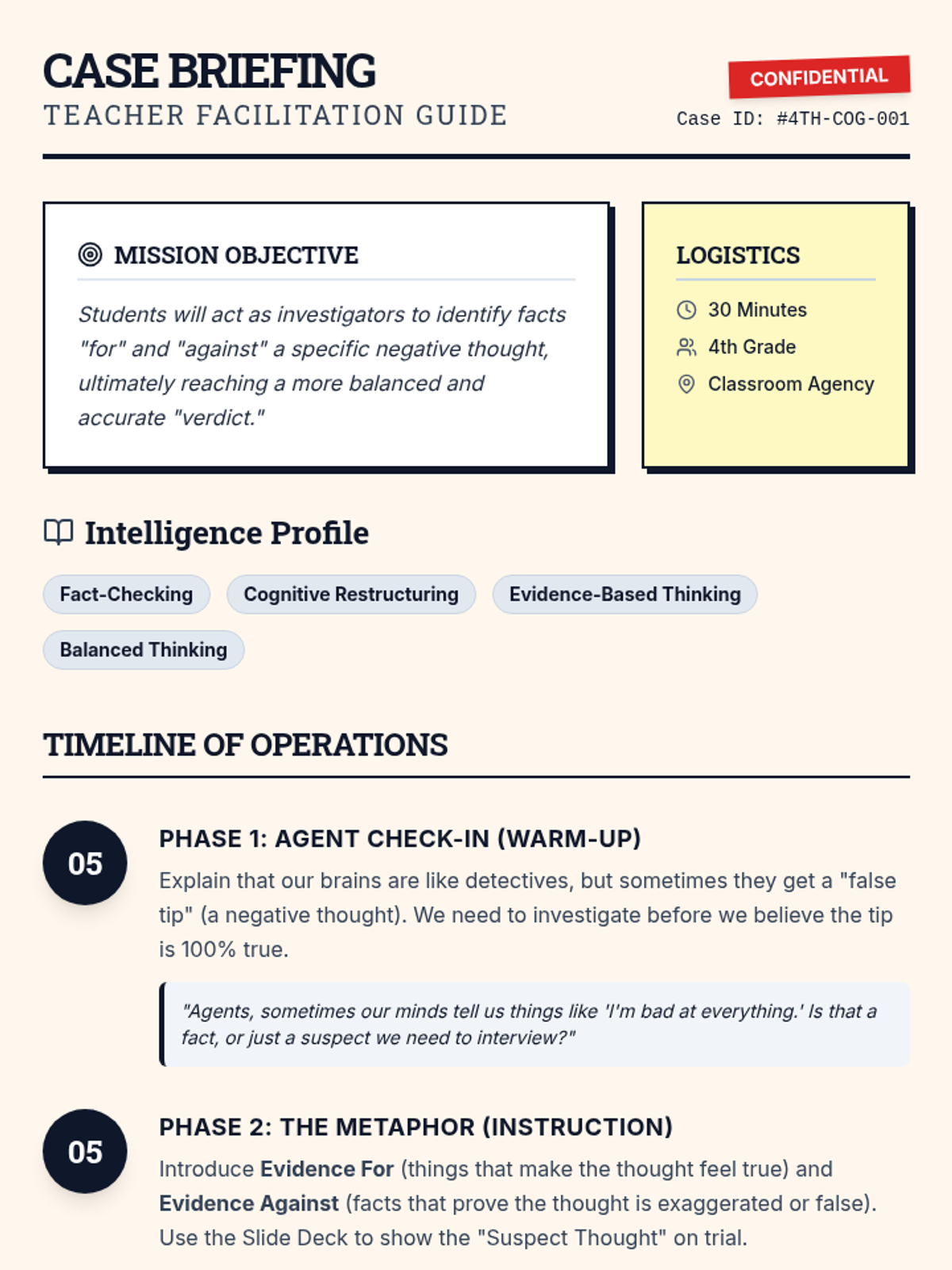 A 30-minute 4th-grade lesson where students become 'Thought Detectives' to investigate negative thoughts by gathering evidence for and against them, leading to more balanced thinking.