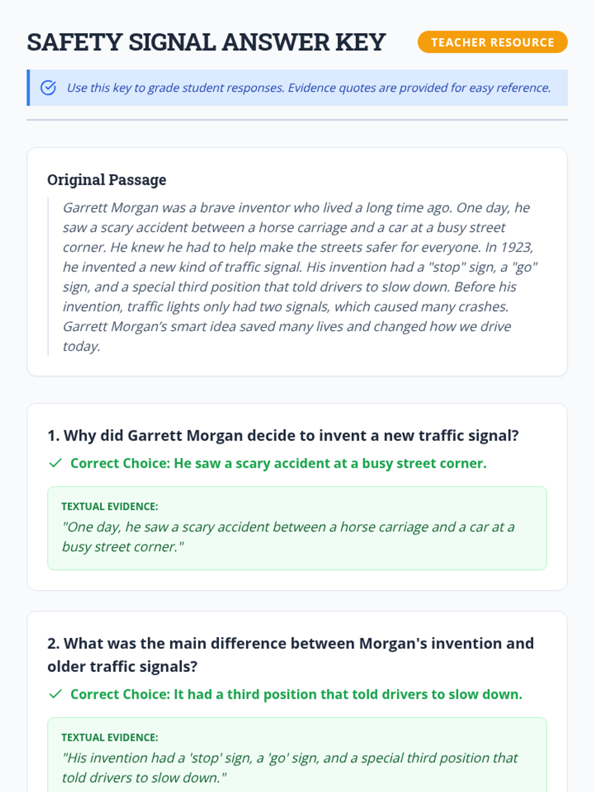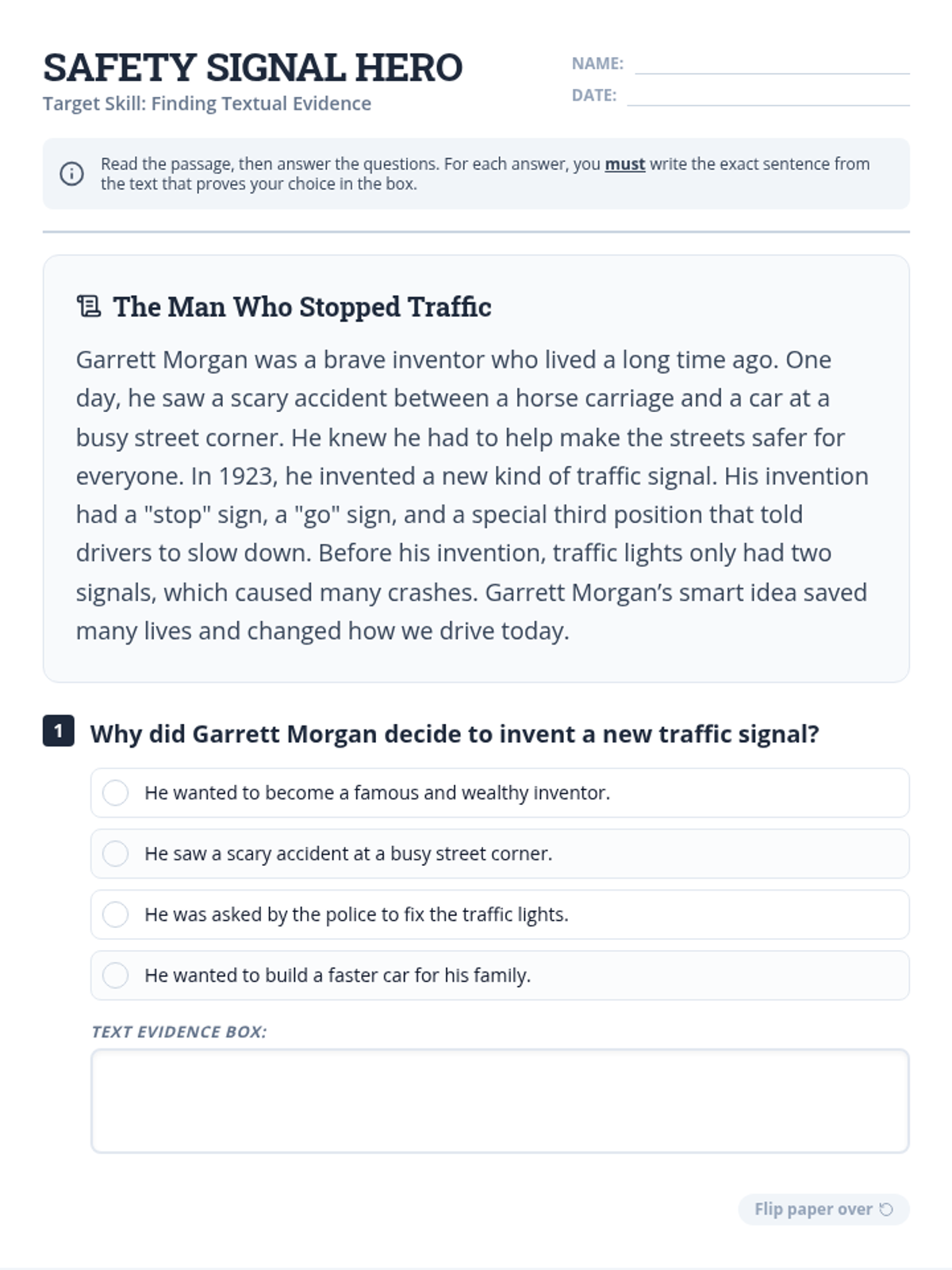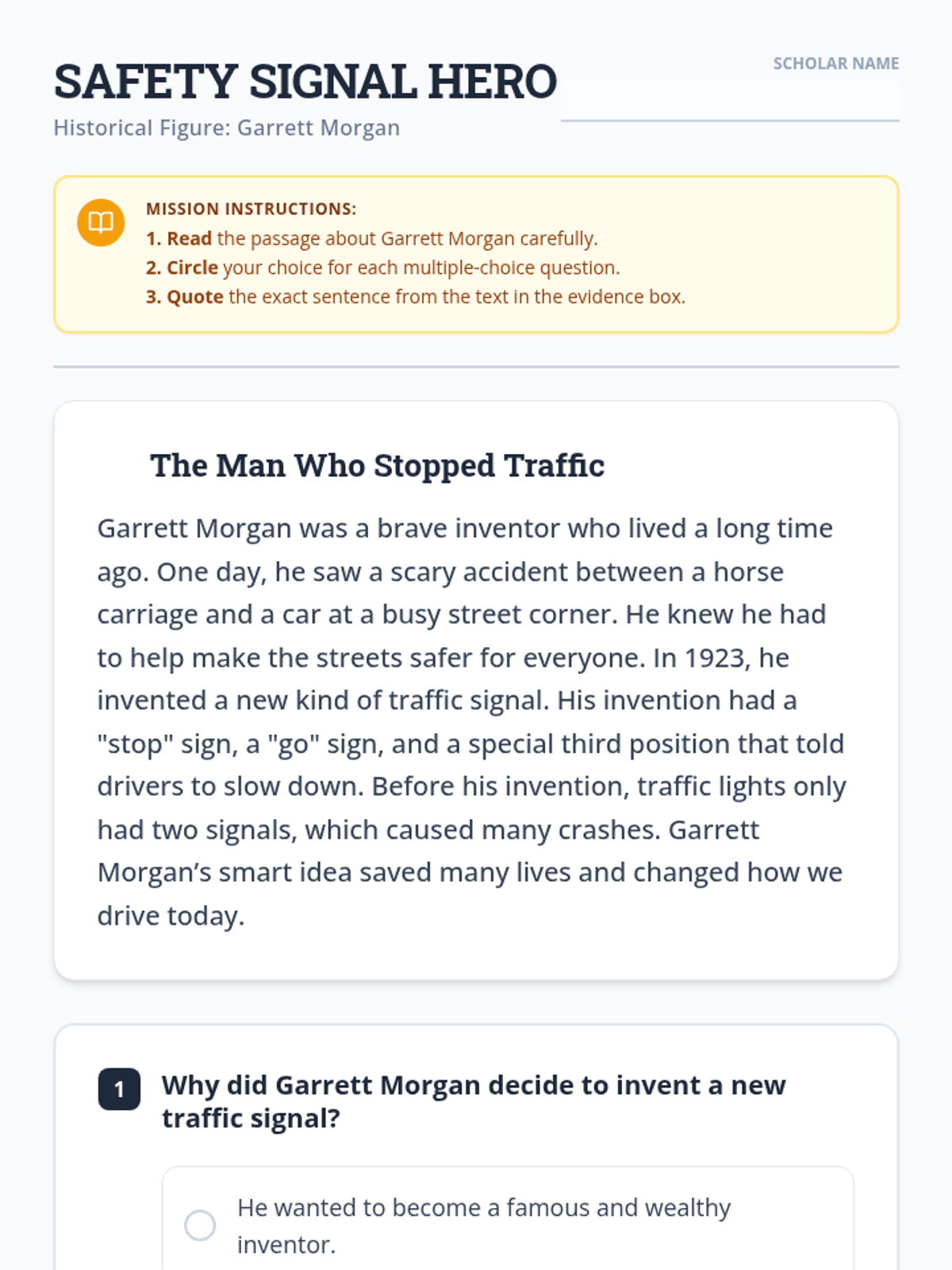 A lesson focused on Garrett Morgan's invention of the traffic signal, designed to help 4th-grade students practice finding textual evidence.