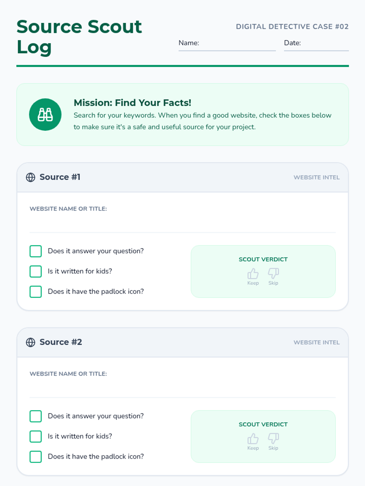 Students use search plans to find safe, reliable digital sources and apply a basic evaluation checklist.