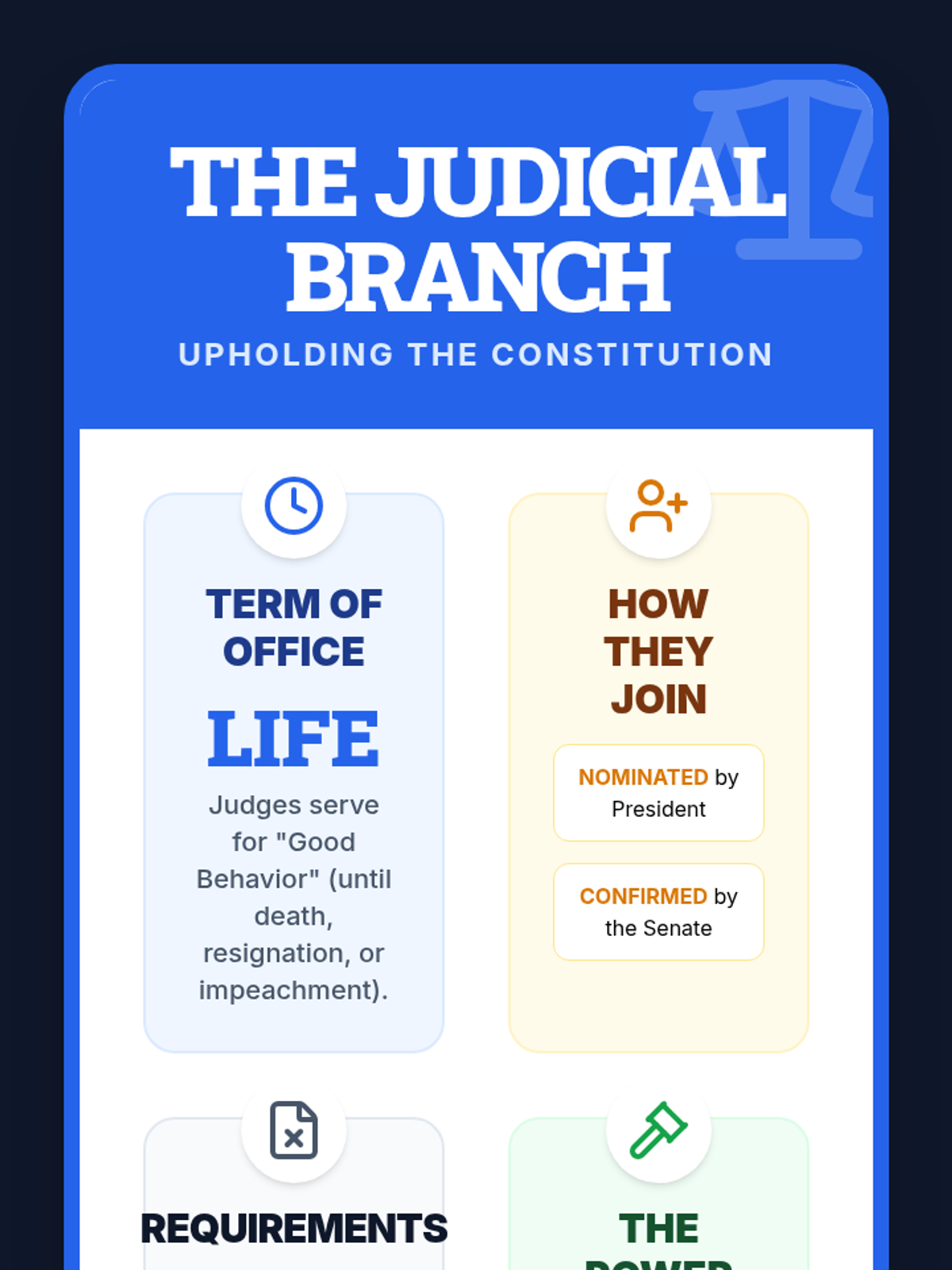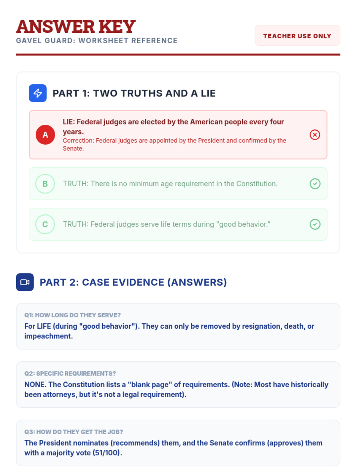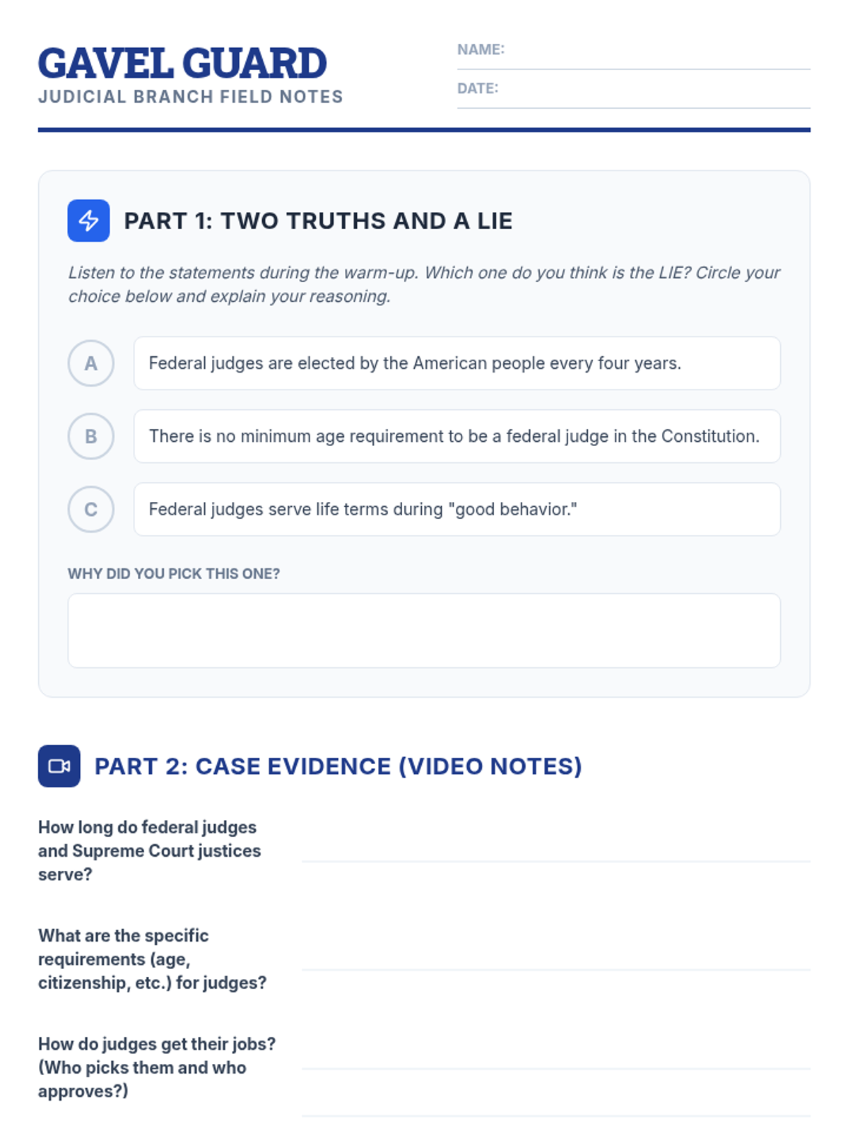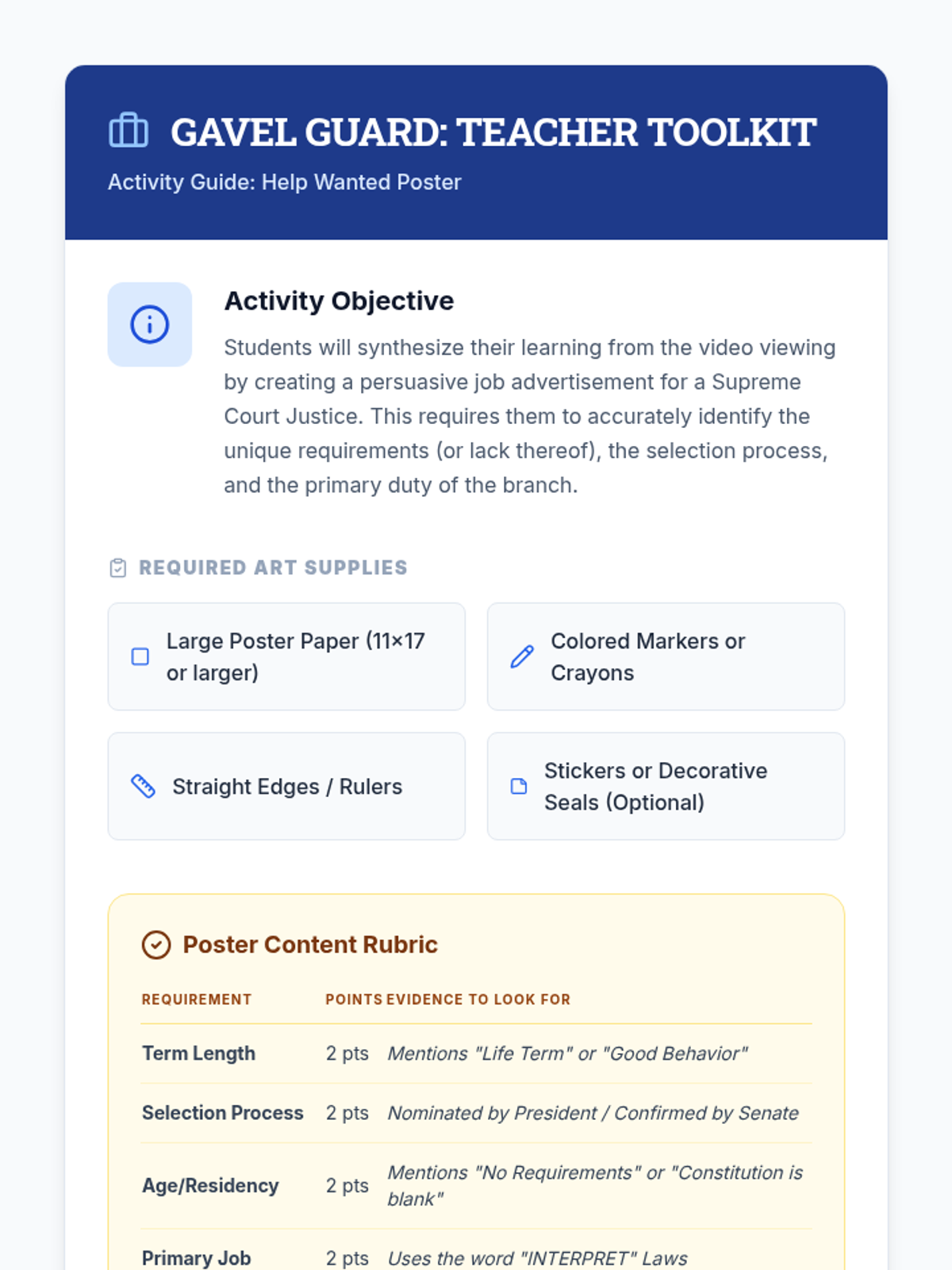 Students explore the Judicial Branch through a "Two Truths and a Lie" warm-up, a guided video analysis, and the creation of a "Help Wanted" poster for a Supreme Court Justice to understand life terms, appointment processes, and legal interpretation.