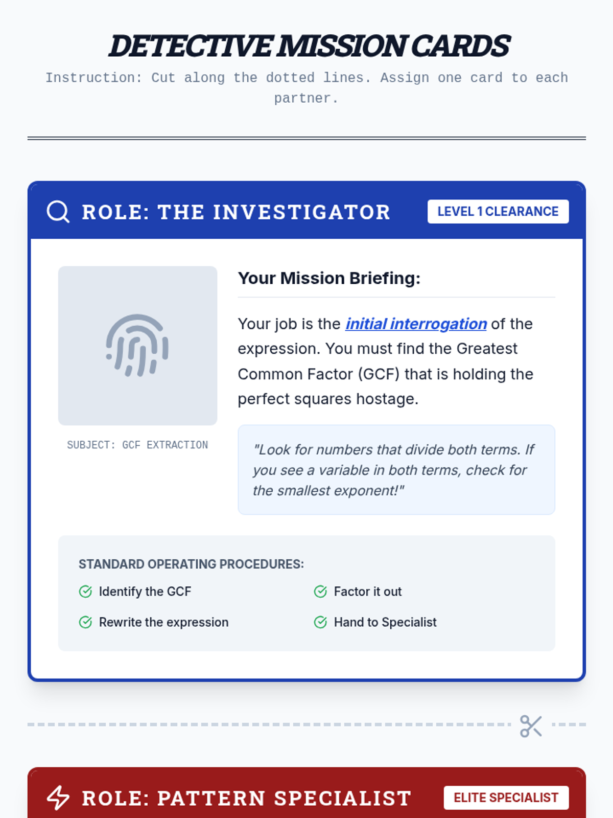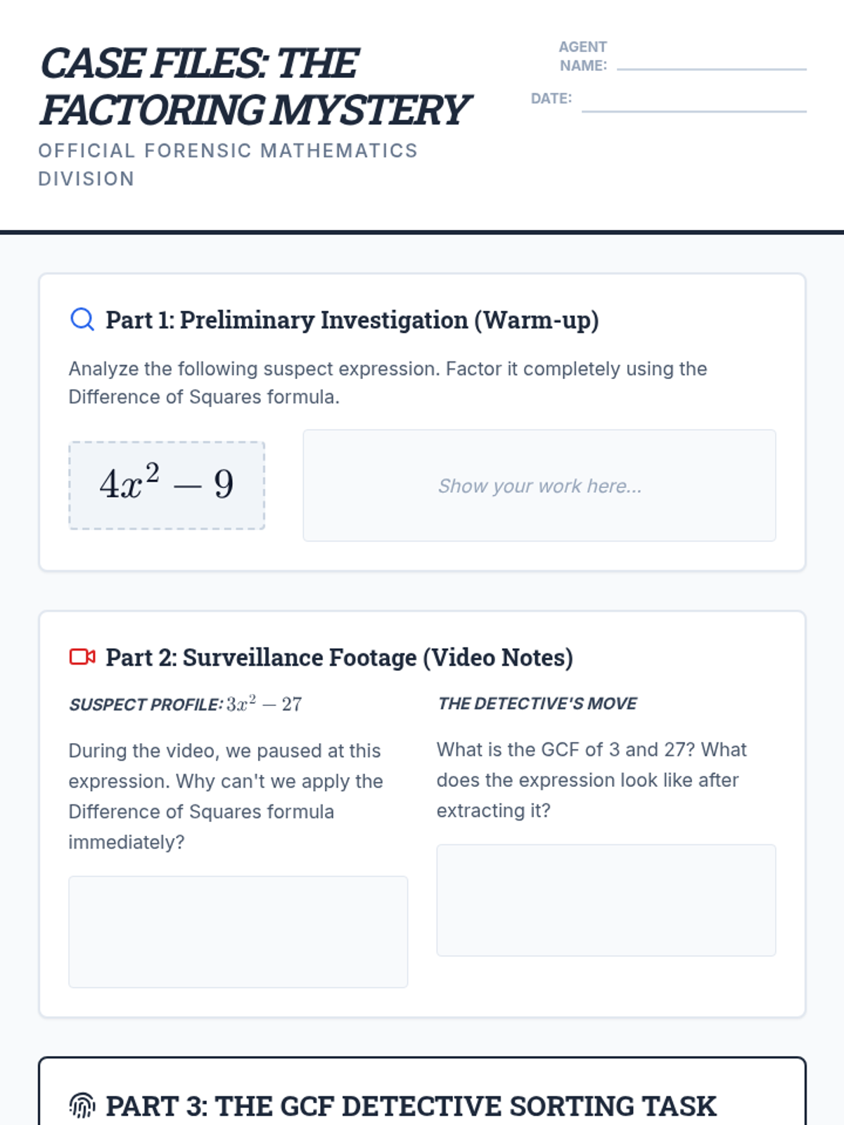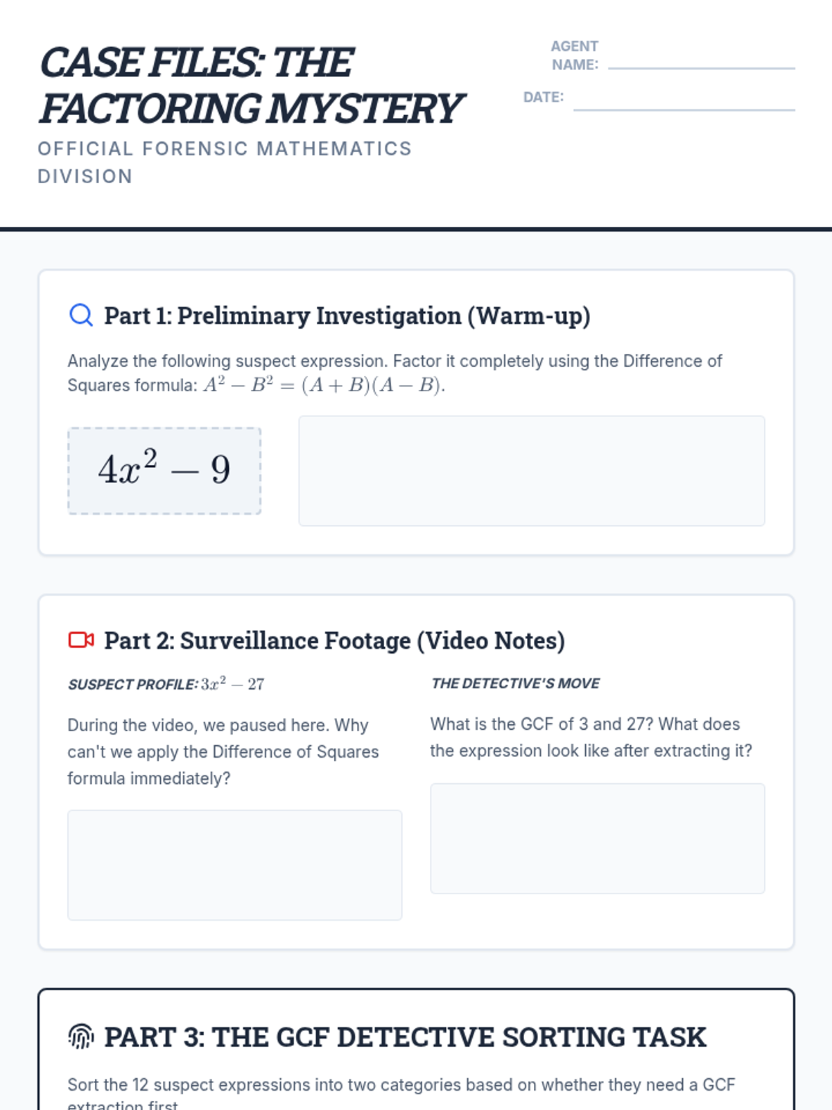 Students become 'GCF Detectives' to determine when an expression requires greatest common factor extraction before applying the difference of squares formula. The lesson features a video-guided inquiry and a collaborative sorting activity.