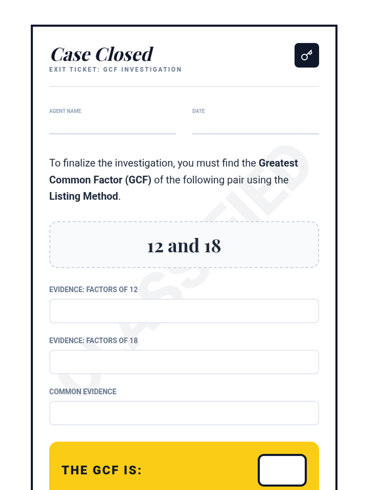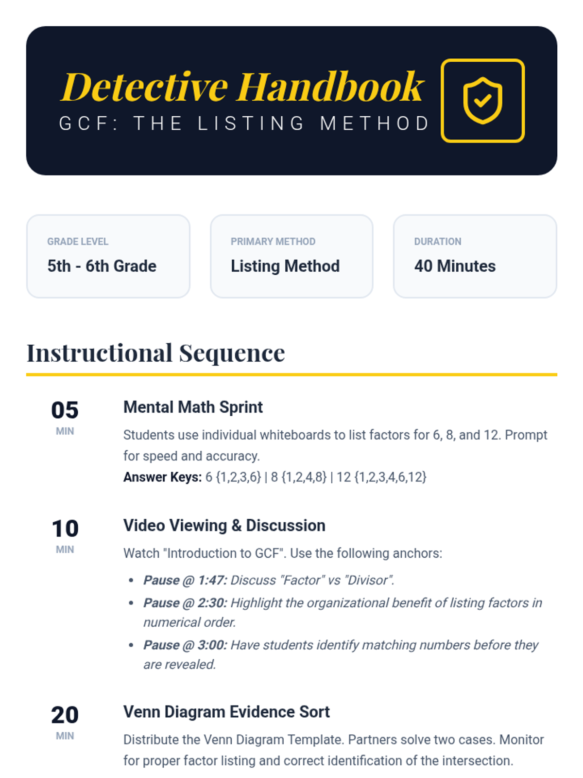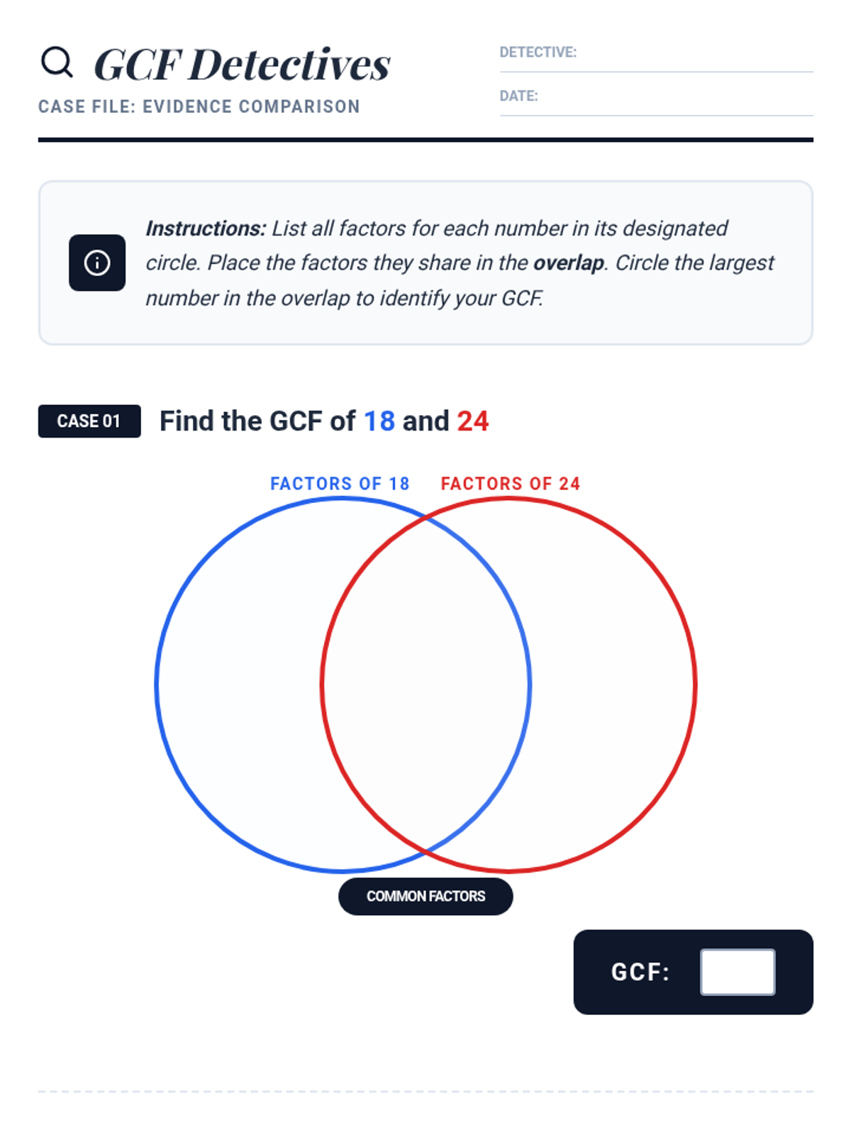 Students will learn to find the Greatest Common Factor (GCF) of two numbers using the listing method, reinforced by a detective-themed Venn Diagram activity. This lesson uses a concrete-representational-abstract approach to master factor identification and commonality.