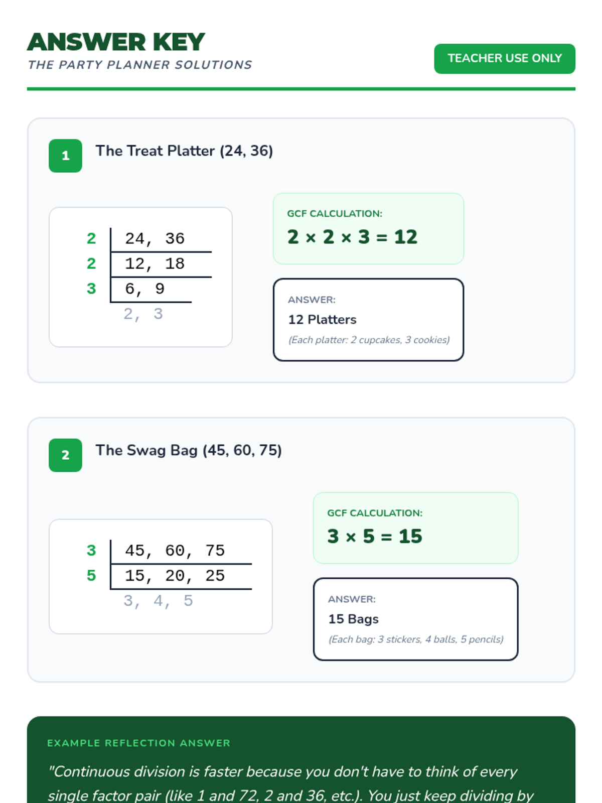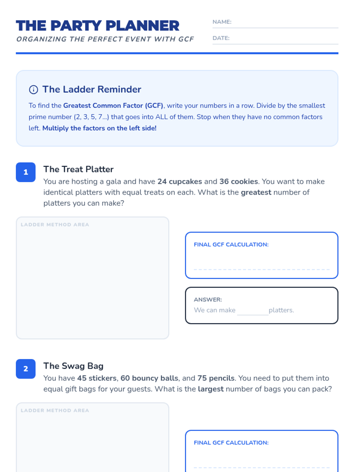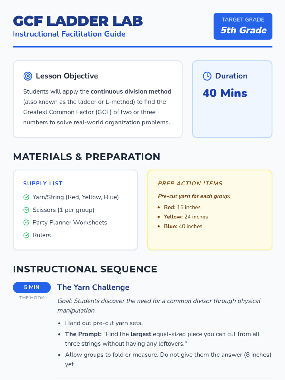 Students will master the continuous division (ladder) method for finding the Greatest Common Factor through a hands-on yarn challenge, instructional video, and a "Party Planner" word problem activity.