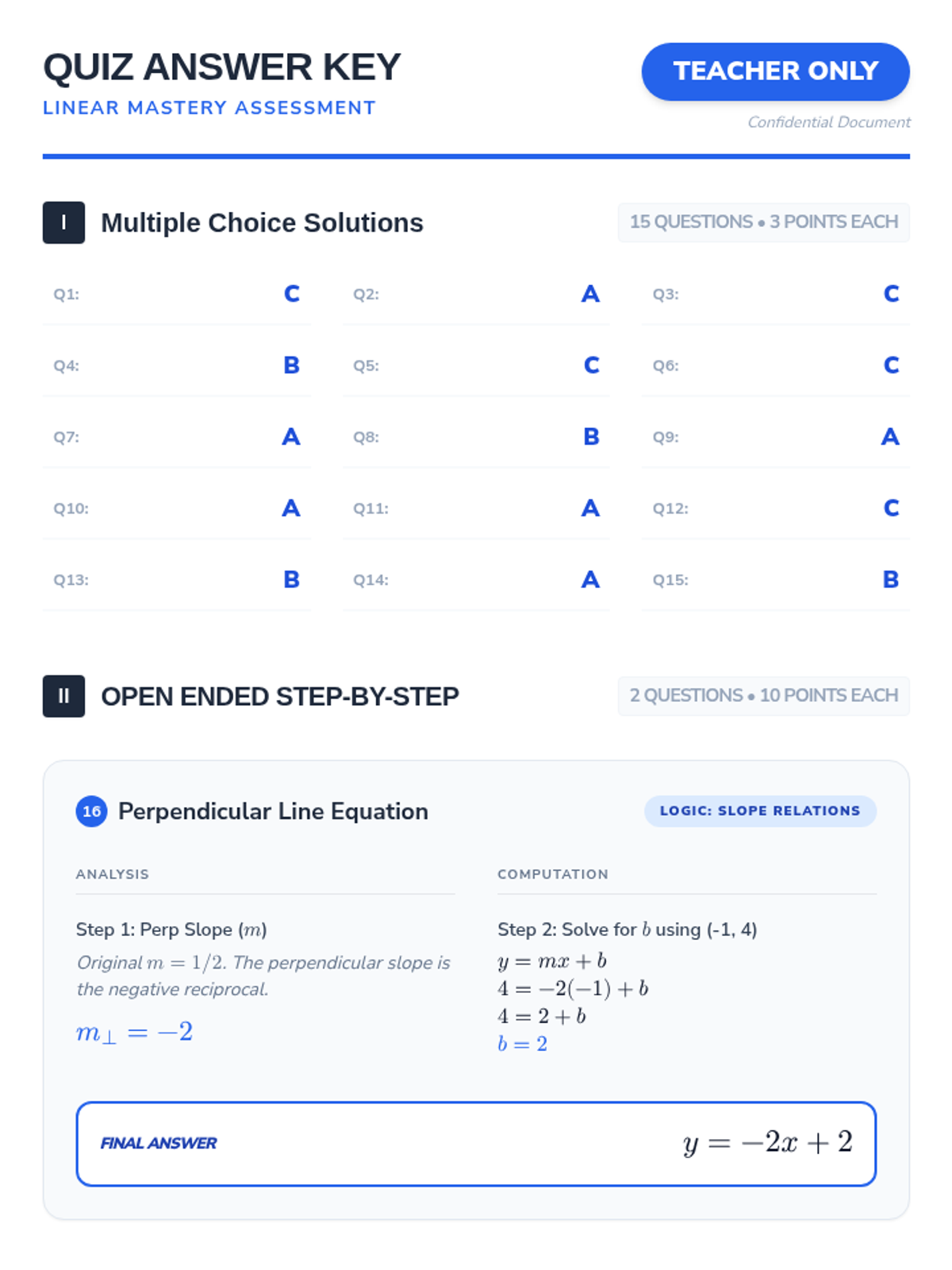 This lesson provides a comprehensive review and assessment of linear equations, covering function identification, standard form conversions, and the properties of parallel and perpendicular lines. Students will engage in guided practice, independent modeling, and summative evaluation to master linear relationships.