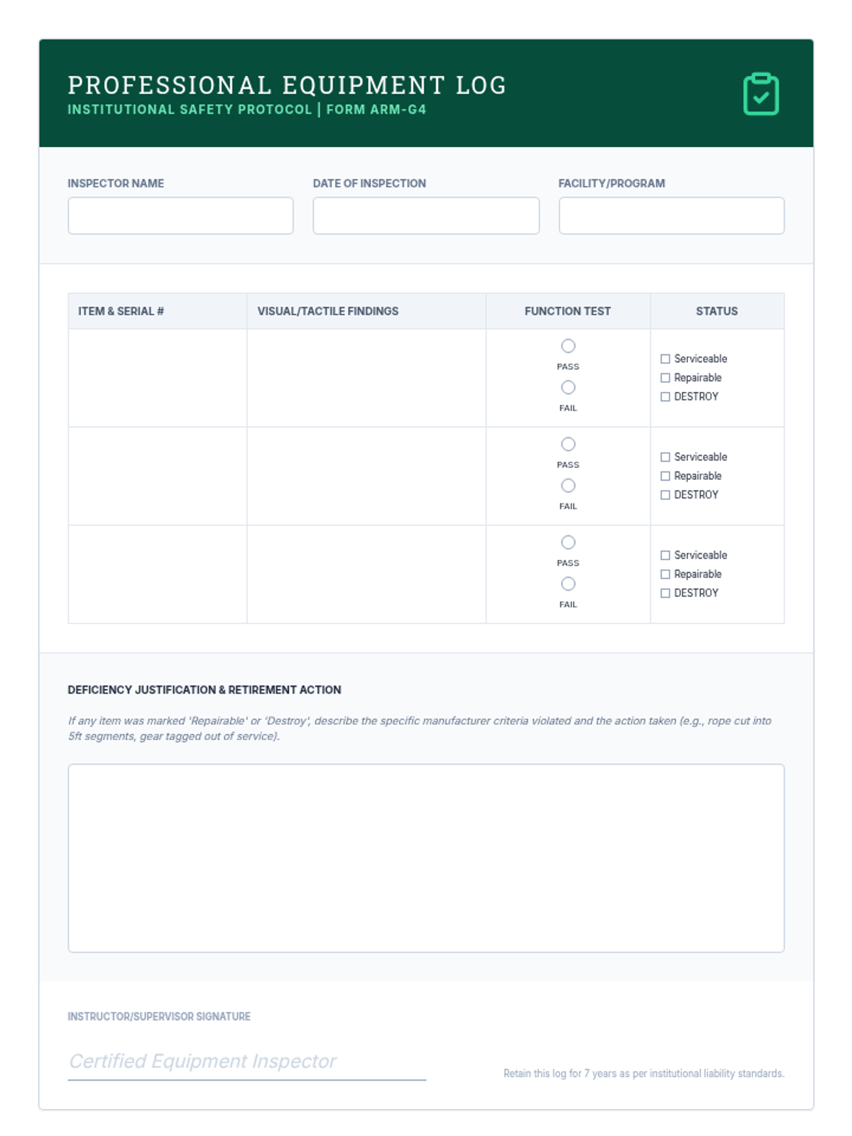 Covers professional standards for PPE inspection, equipment lifecycle management, and the legal implications of gear failure.
