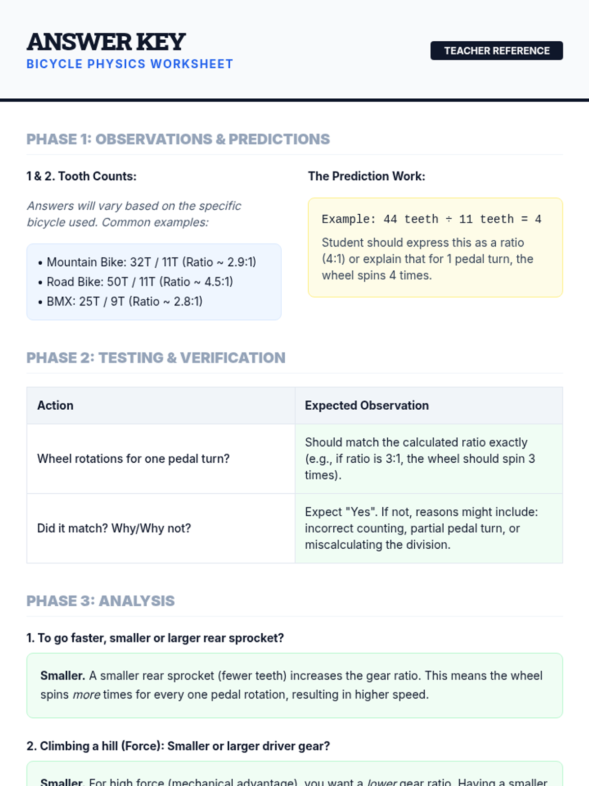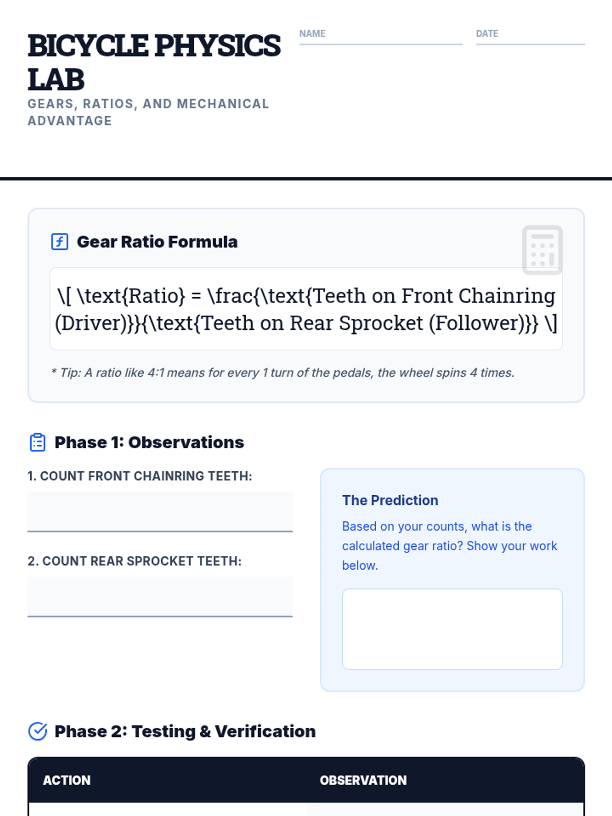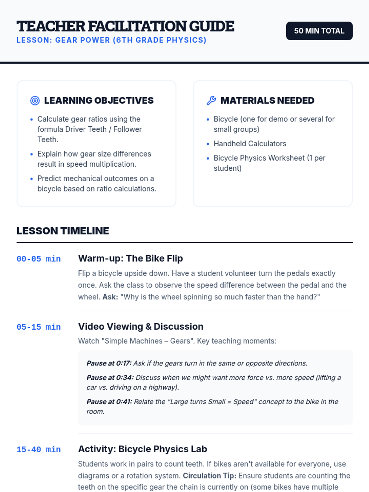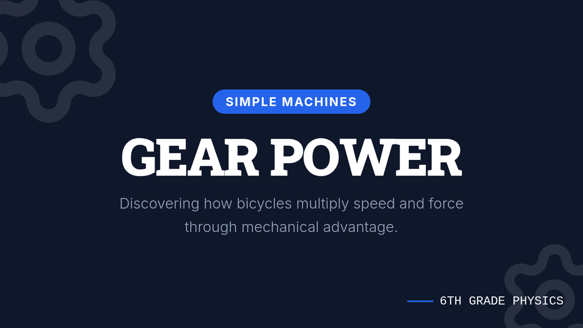 Students explore the mechanical advantage of gears through bicycle mechanics, focusing on how gear ratios multiply speed and force. They will calculate ratios using tooth counts and observe these principles in action using a physical bicycle and instructional video.
