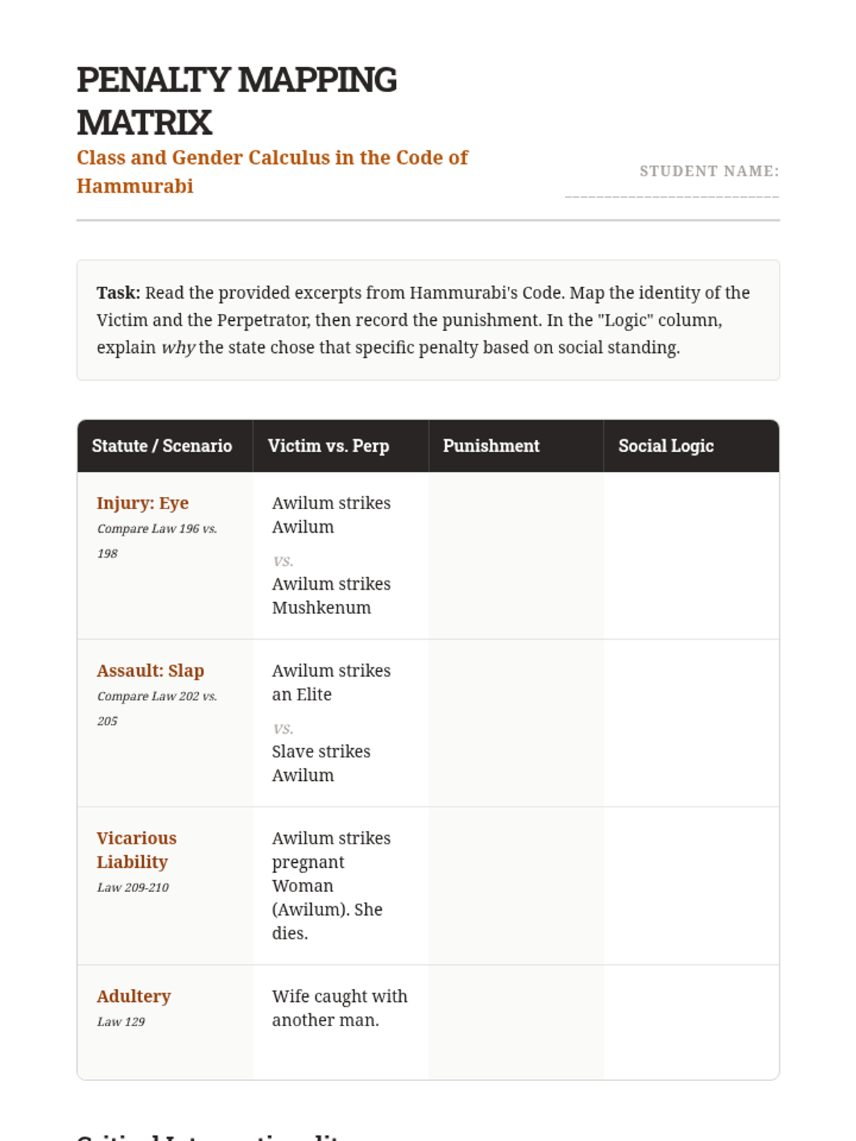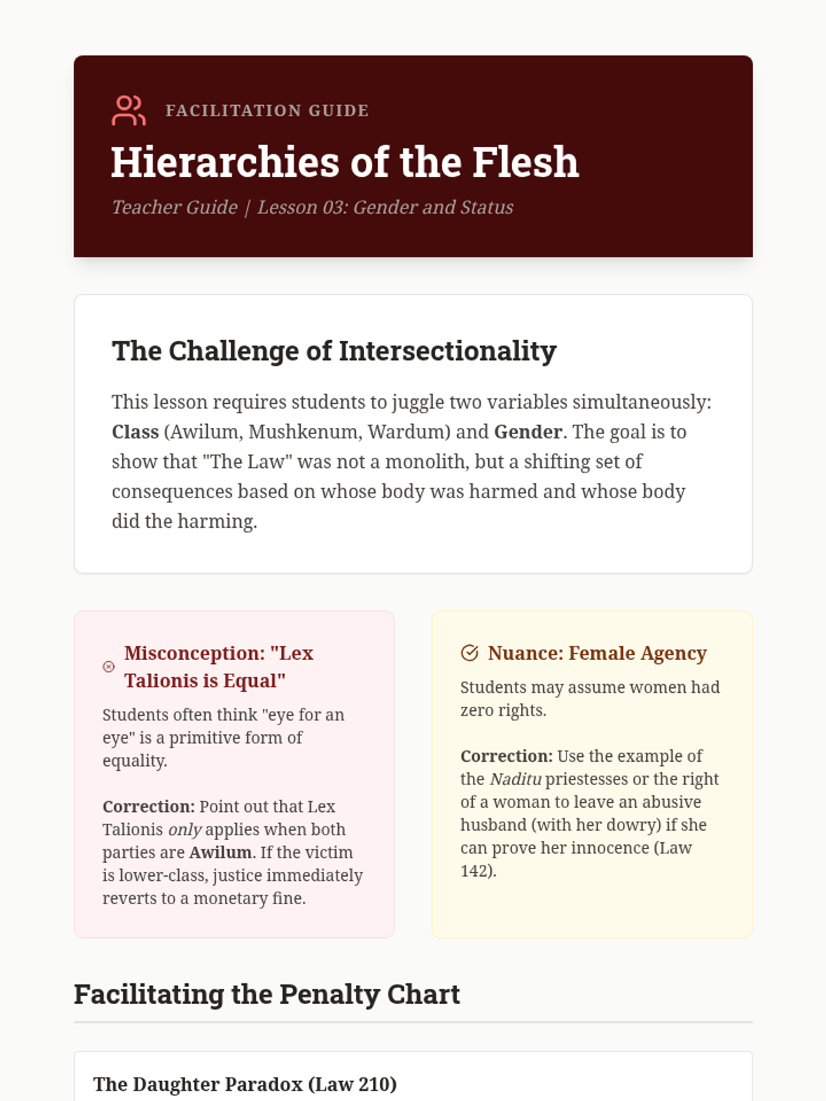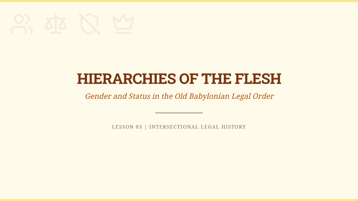 Investigates the intersectional nature of Mesopotamian law, specifically how status (Awilum, Mushkenum, Wardum) and gender determine legal standing and the severity of punishments. Students map out the 'value' of different bodies in the eyes of the state.
