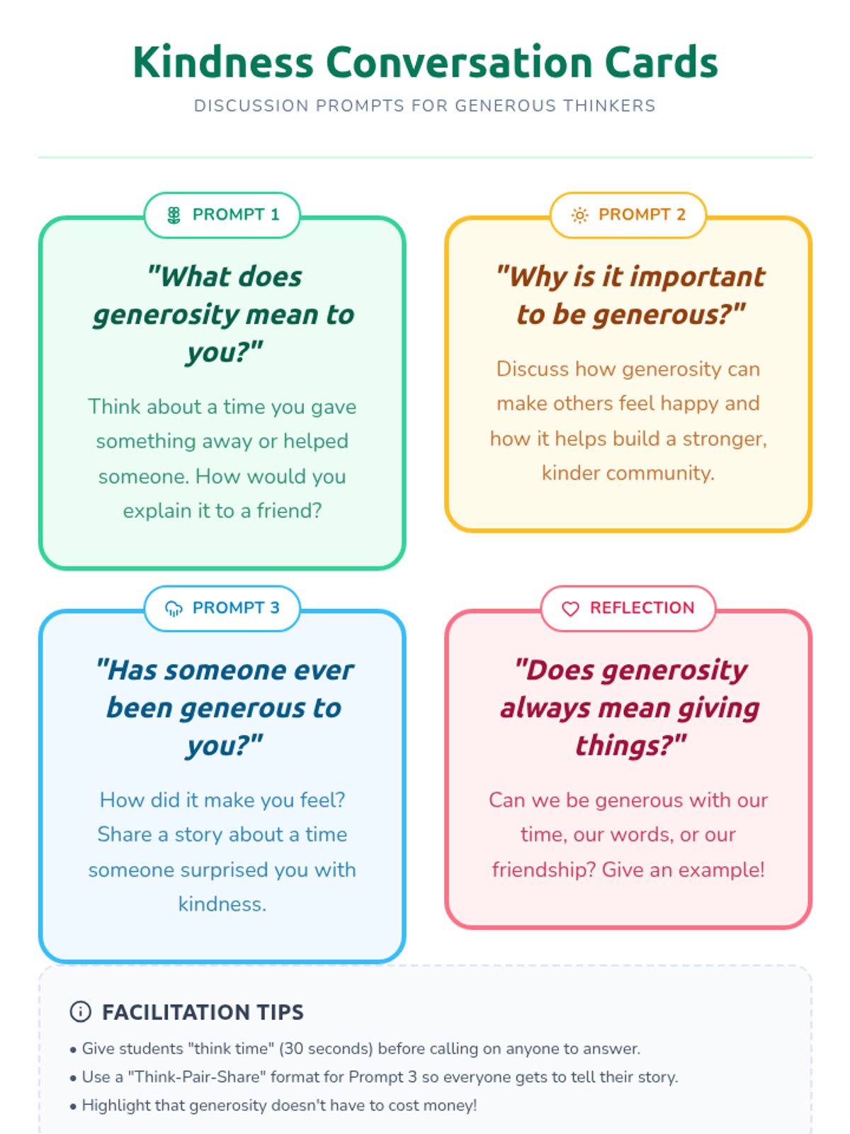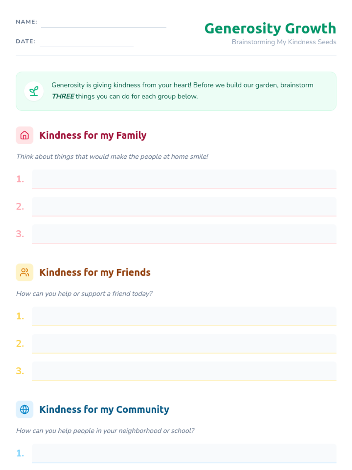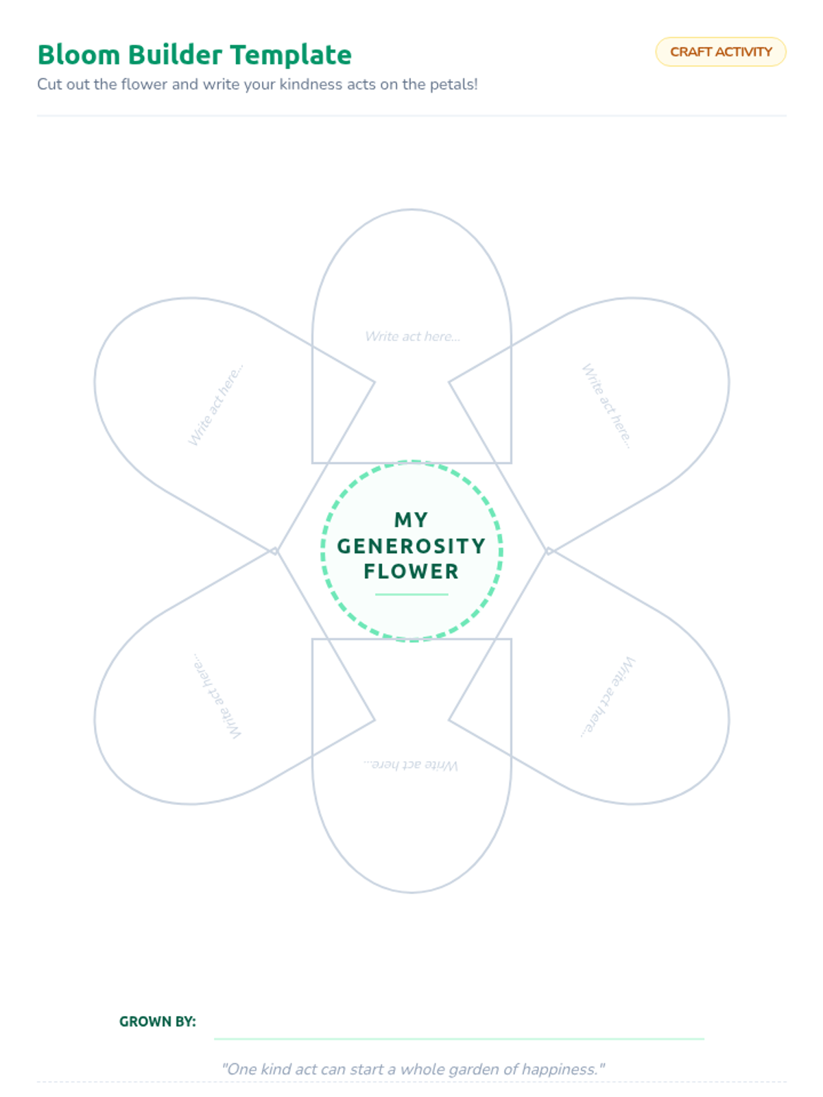 Students will explore the concept of generosity by creating a 'Generosity Garden,' where each flower petal symbolizes an act of kindness they can perform for their community.