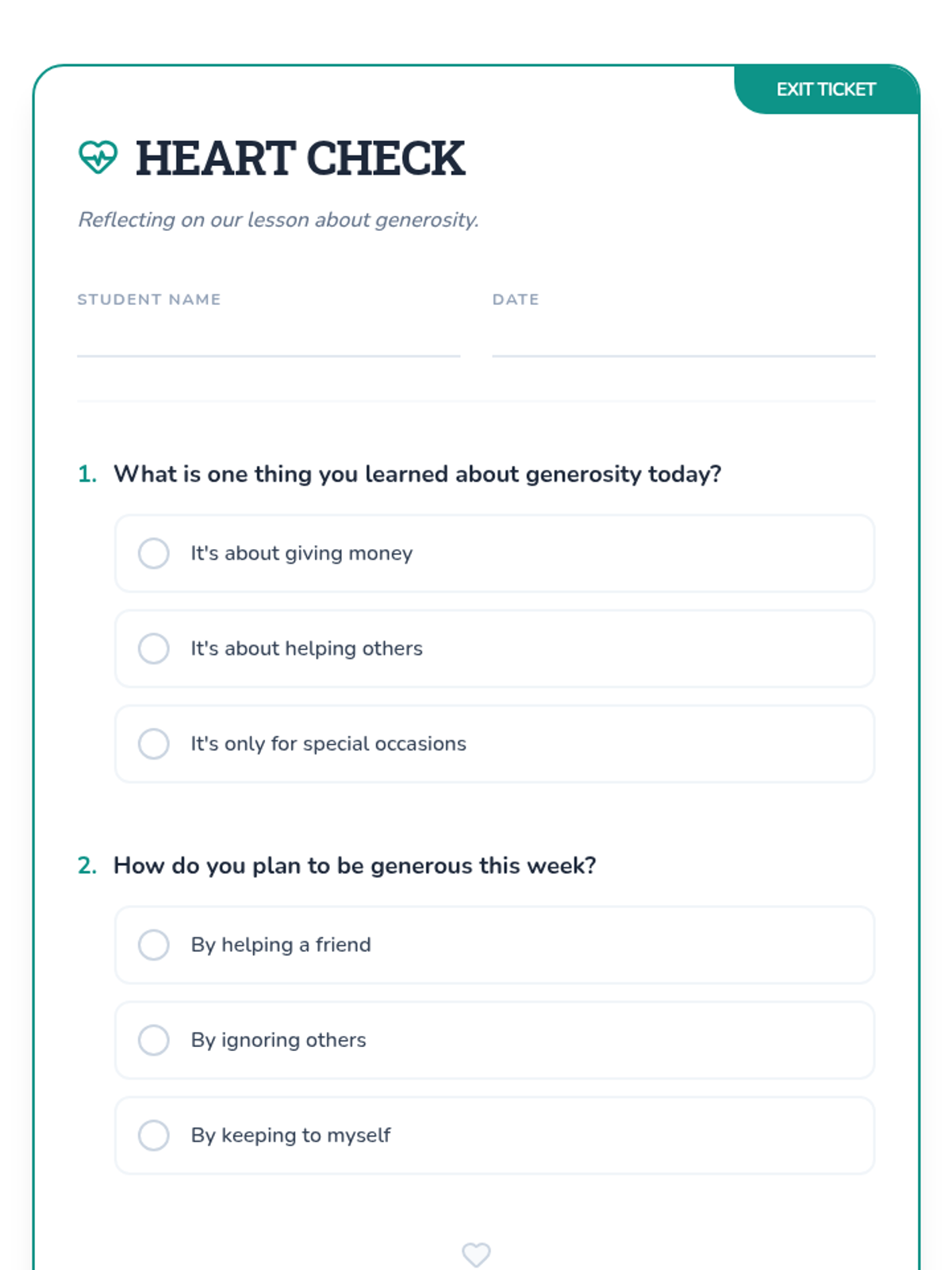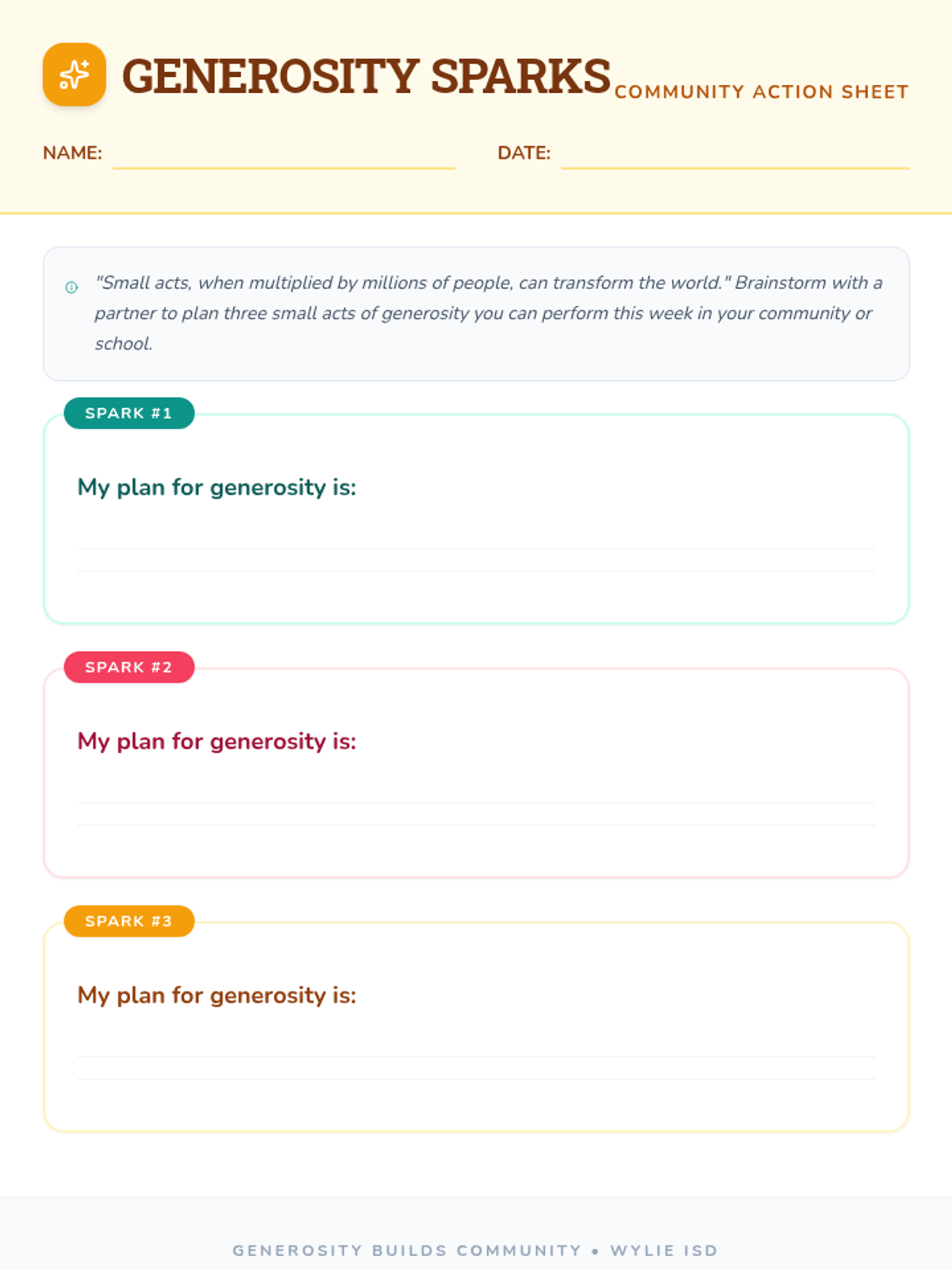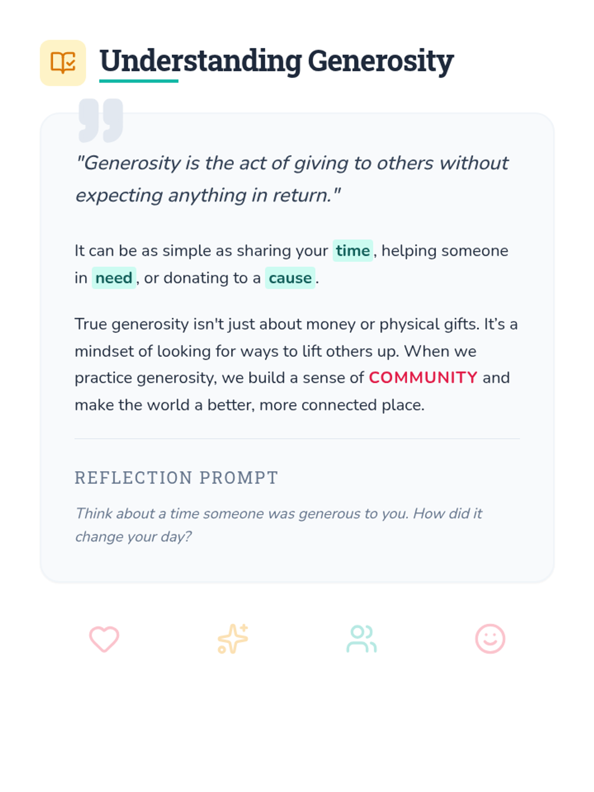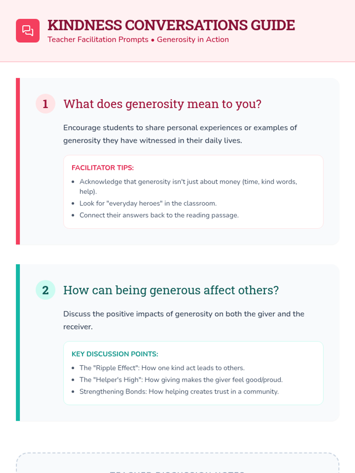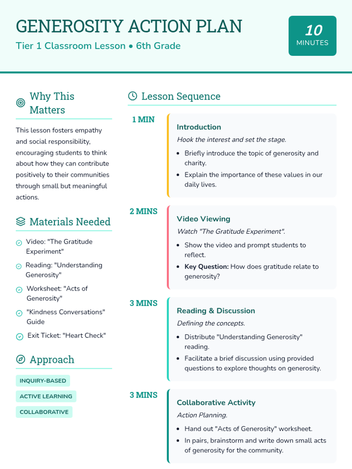 A brief, engaging 10-minute lesson for 6th graders exploring the concepts of generosity and charity through video, reading, and collaborative brainstorming. Students learn how small acts can build a stronger community.