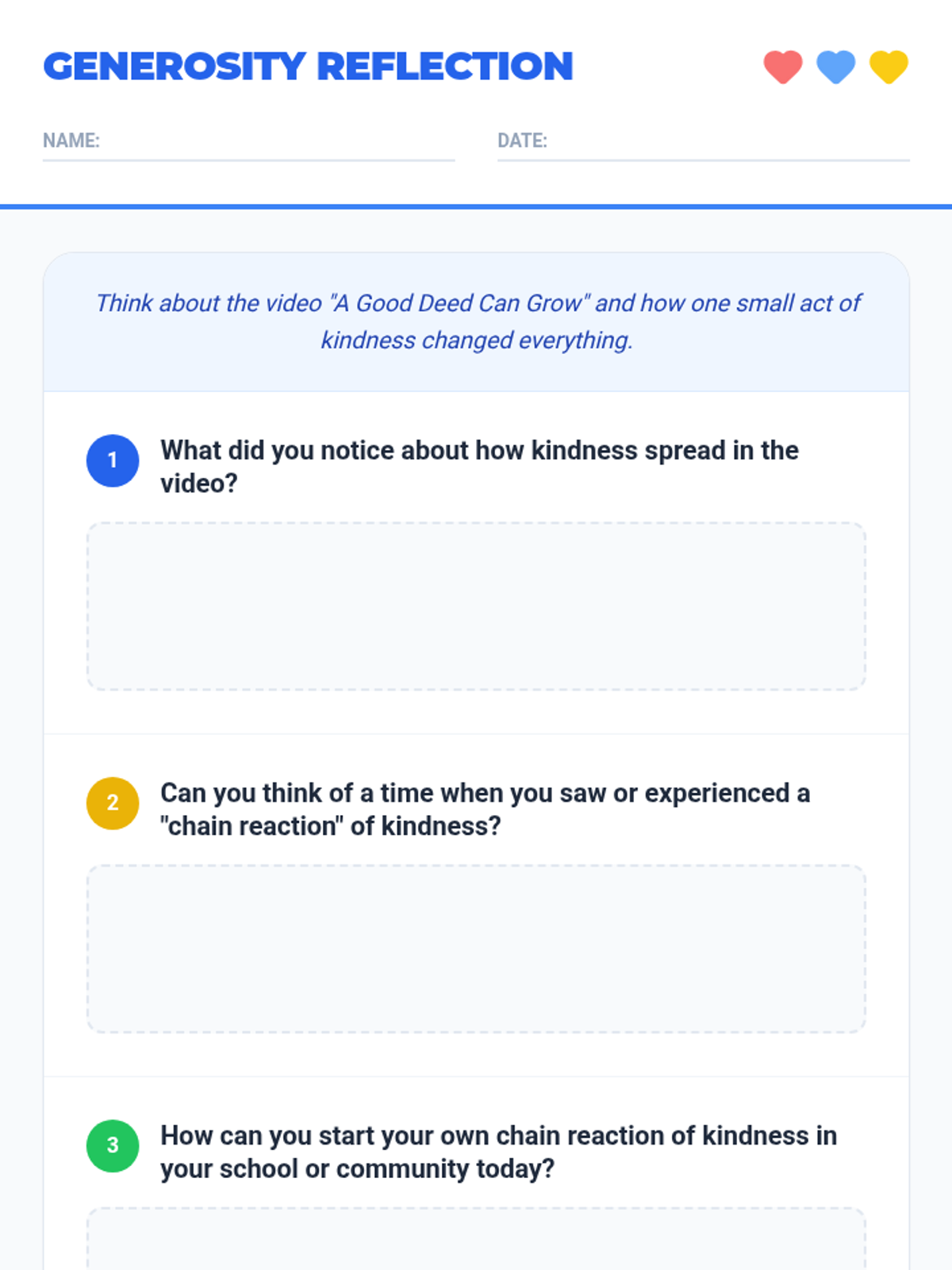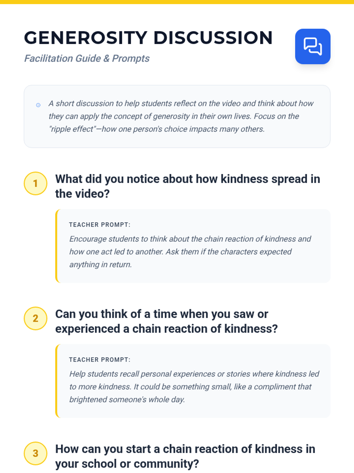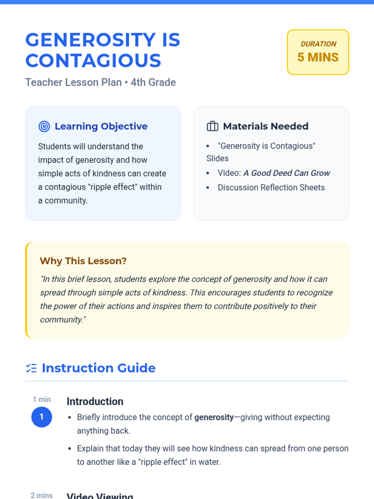 A quick 5-minute lesson for 4th graders exploring how acts of generosity create a contagious ripple effect in a community. Students watch a short video and discuss how they can start their own chain reactions of kindness.