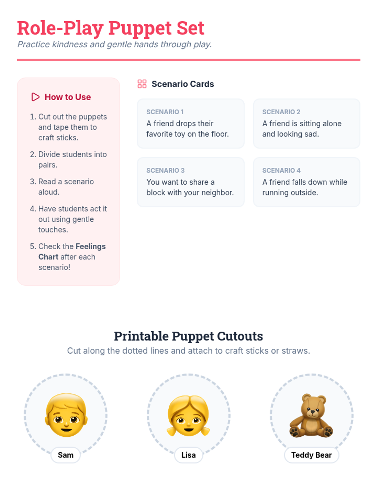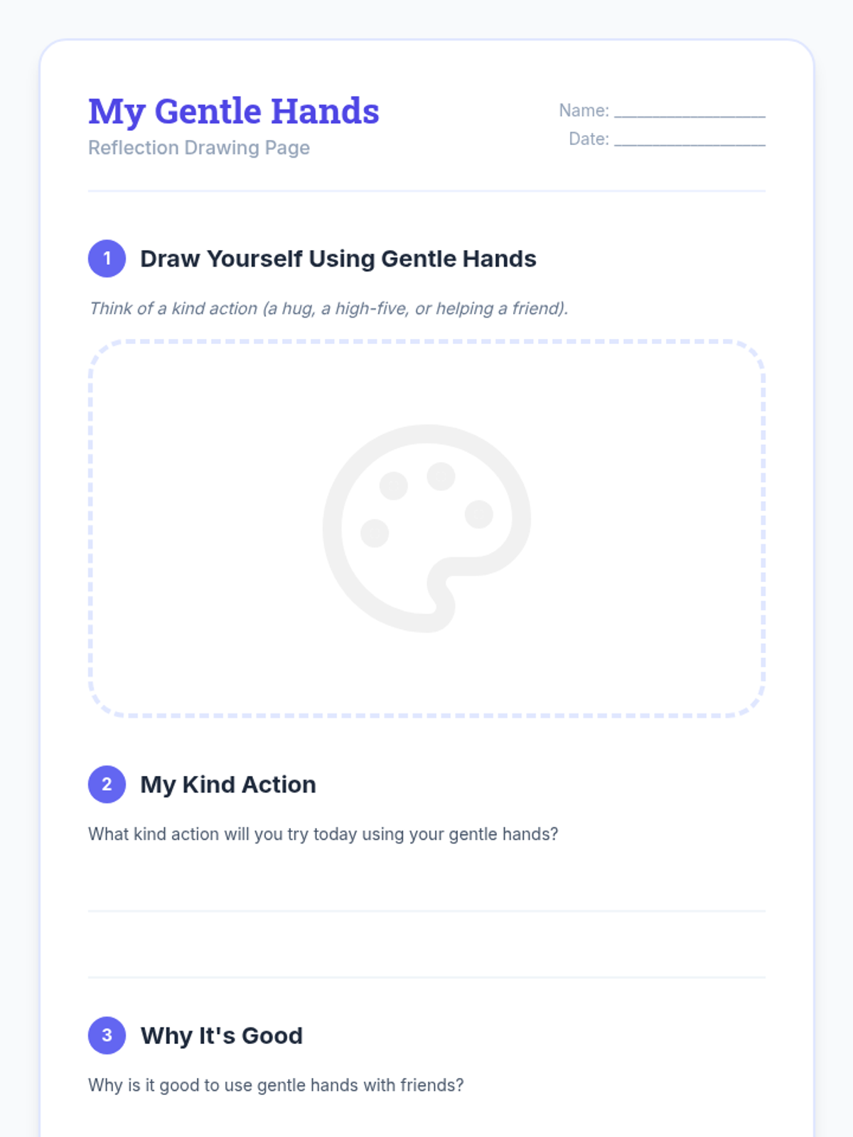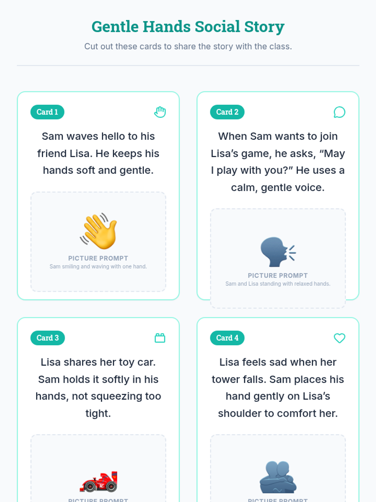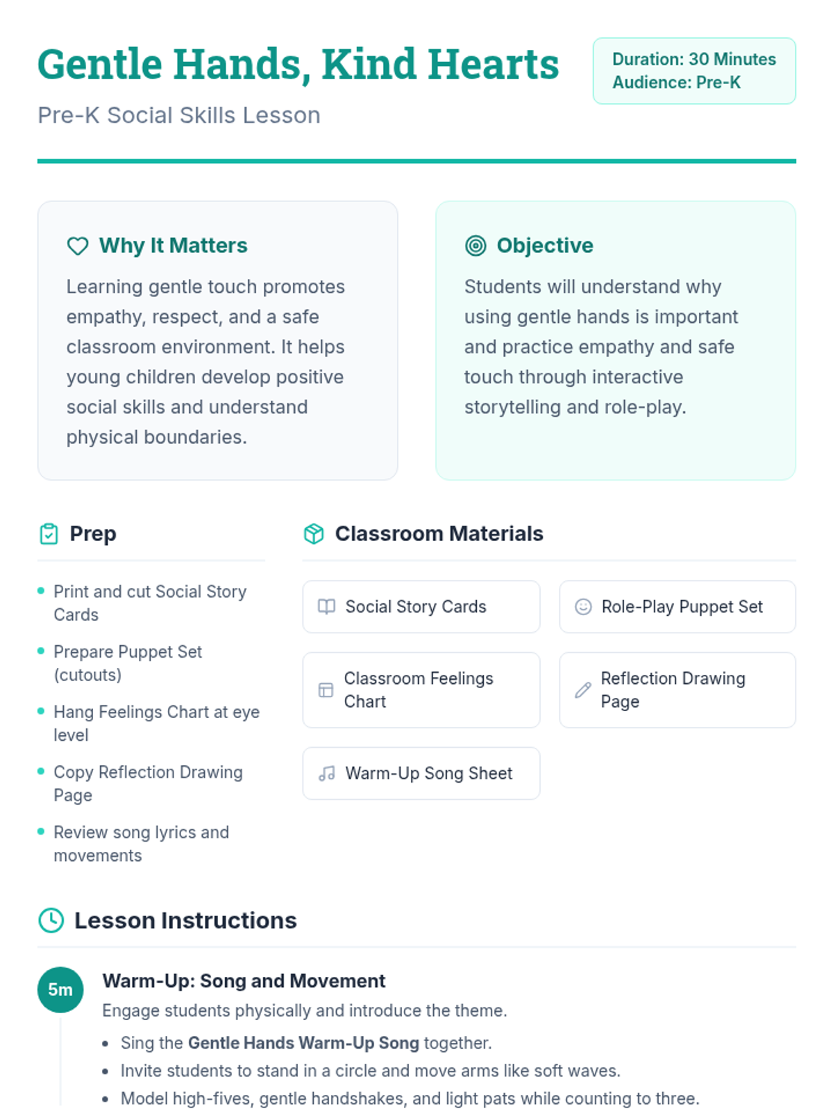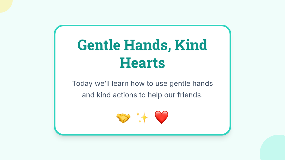 A 30-minute Pre-K social story lesson where students learn the importance of using gentle hands and kind actions through interactive storytelling, role-play, and creative reflection.