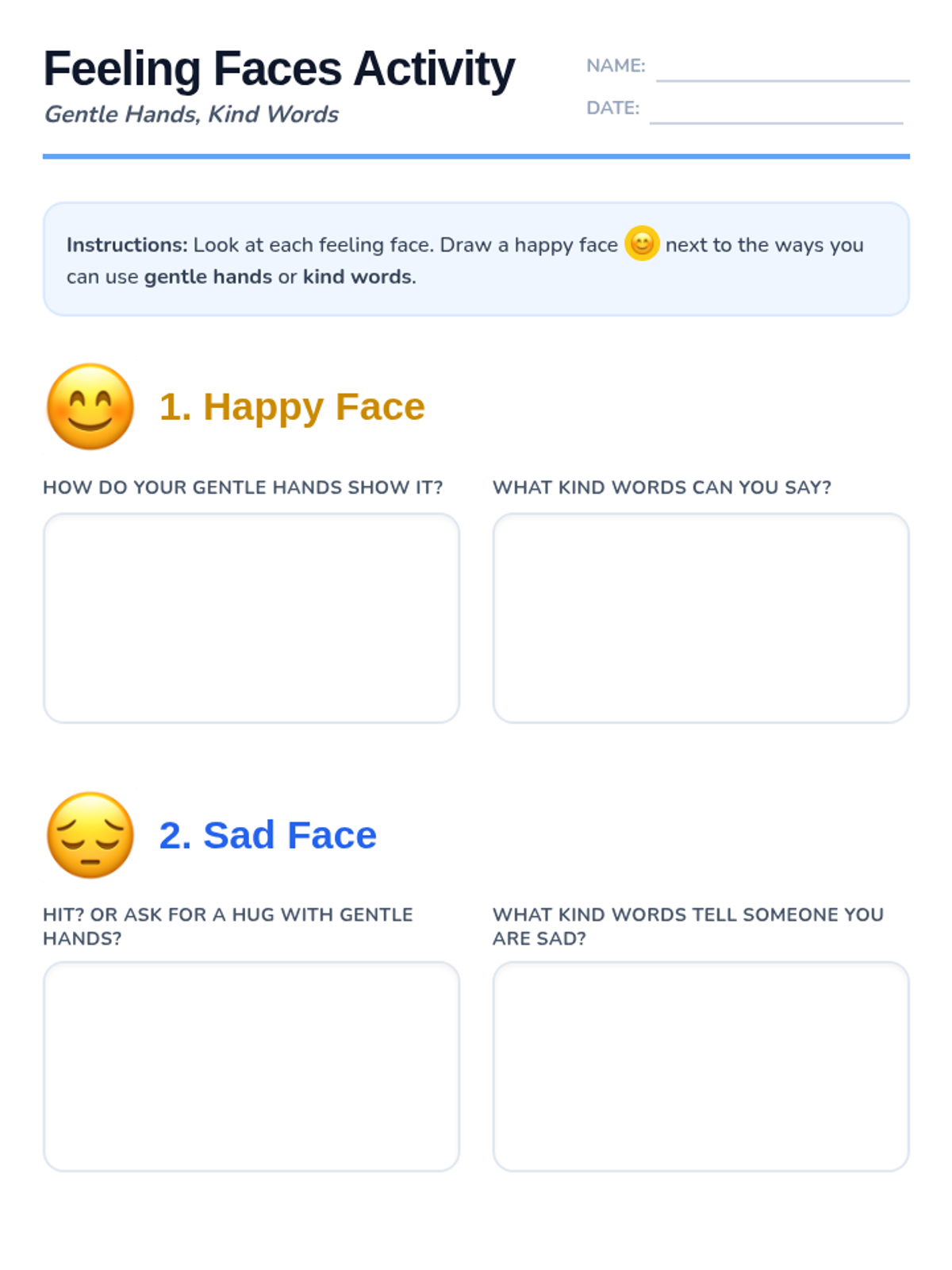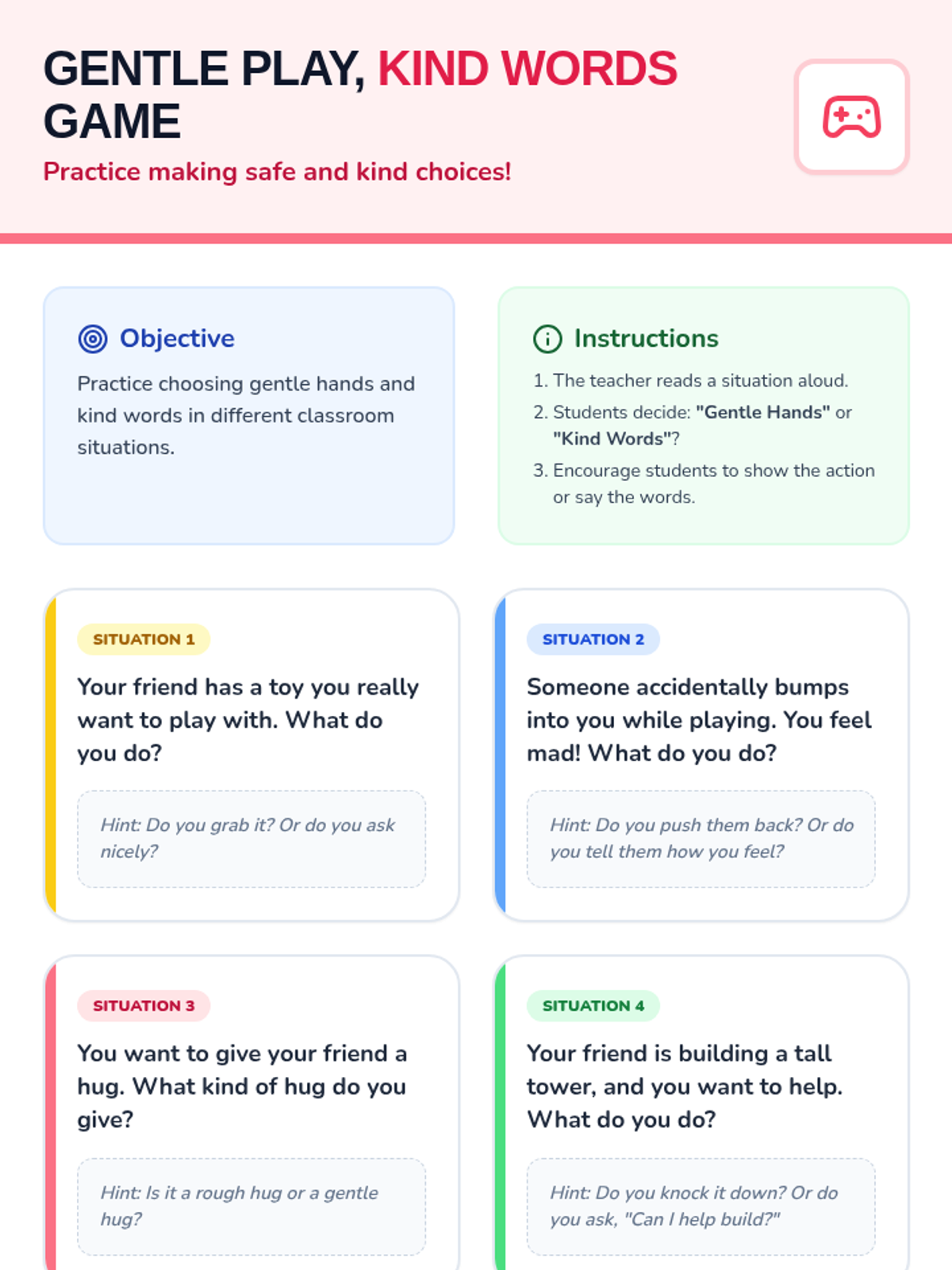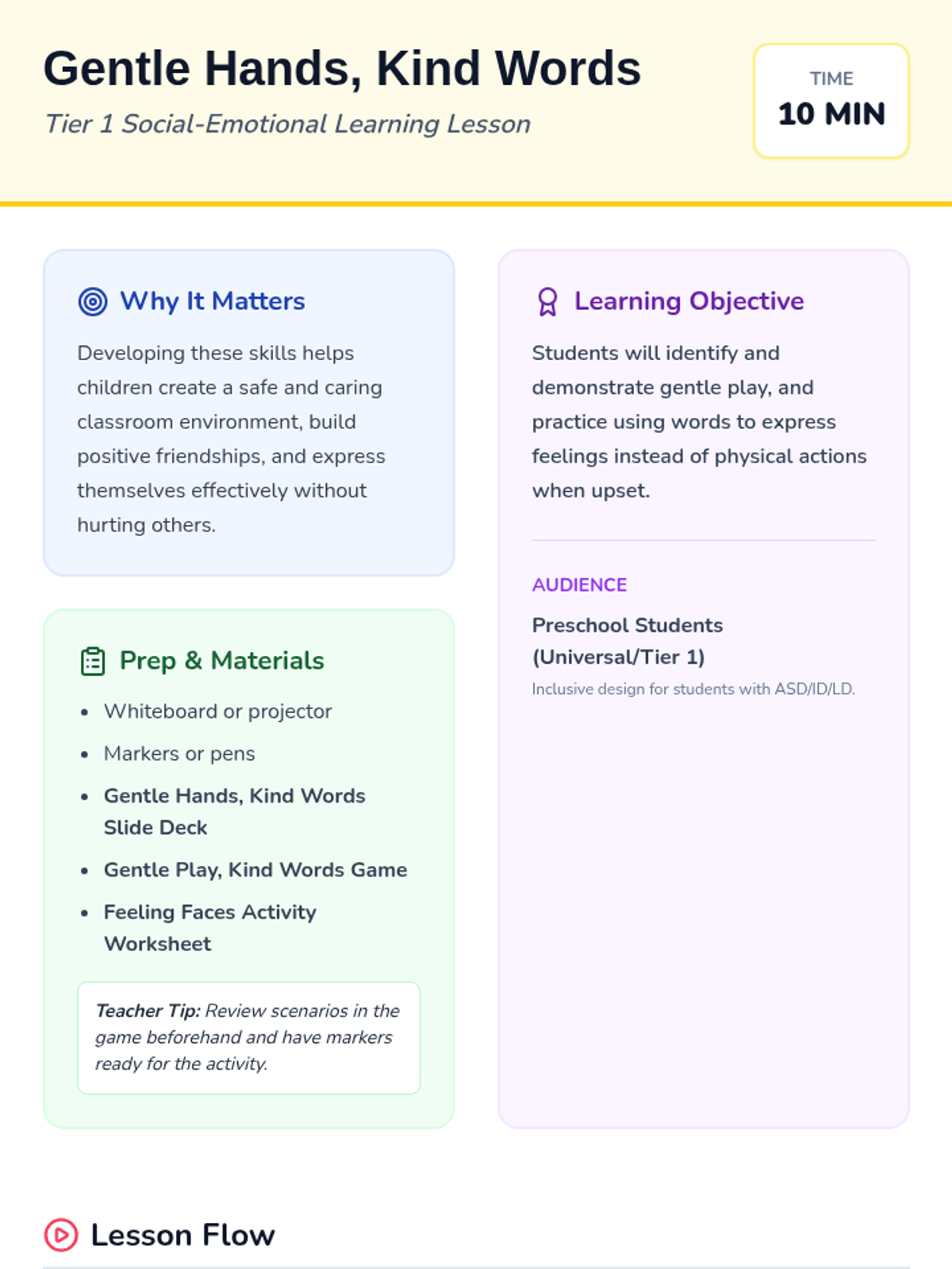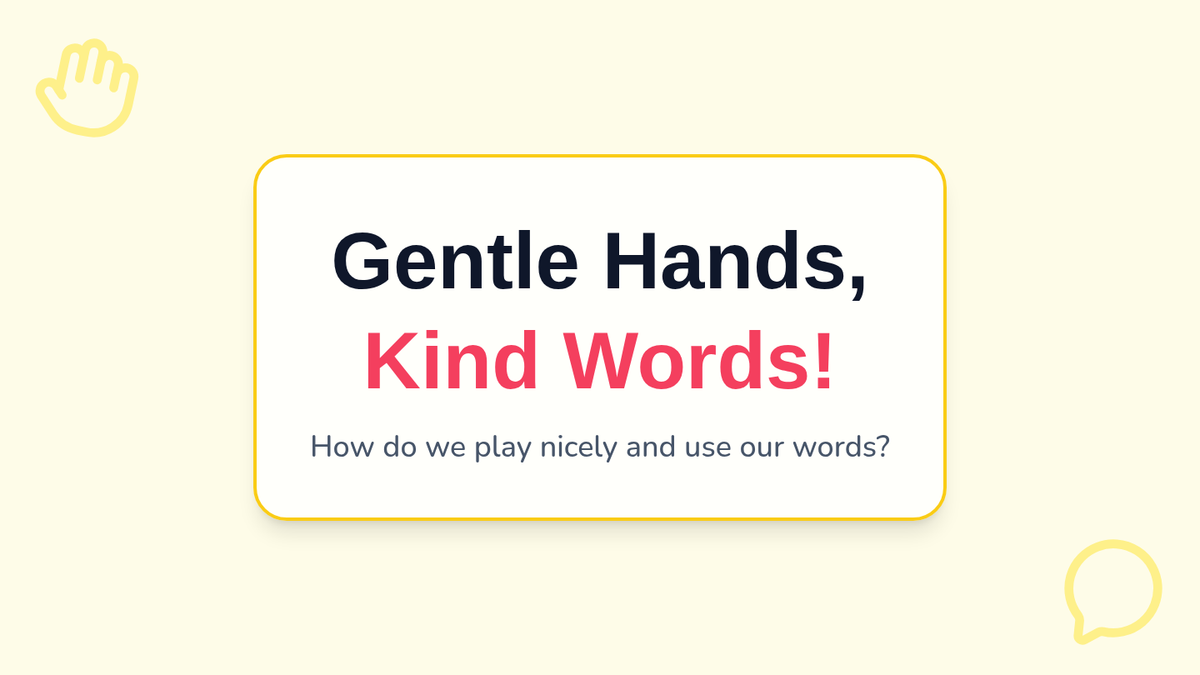 A 10-minute social-emotional learning lesson for preschool students focused on practicing gentle touch and using verbal communication to express feelings and resolve conflicts.