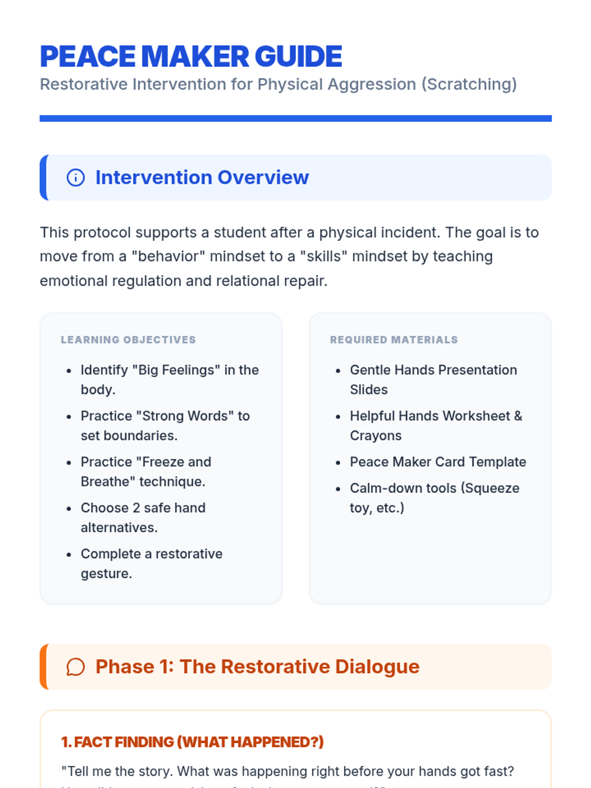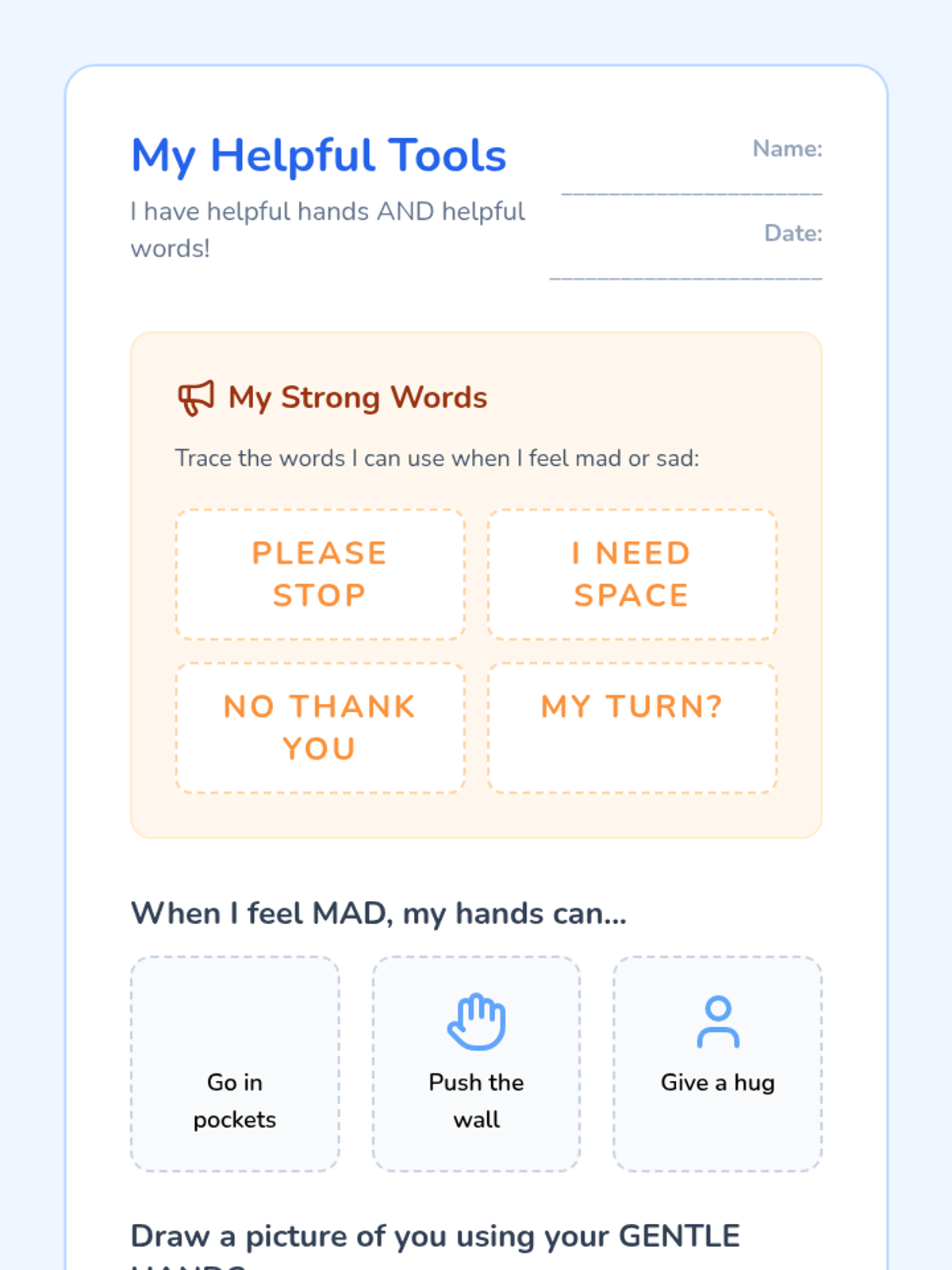 A social-emotional lesson for kindergarteners focused on managing anger, using hands safely, and participating in restorative actions after conflict.