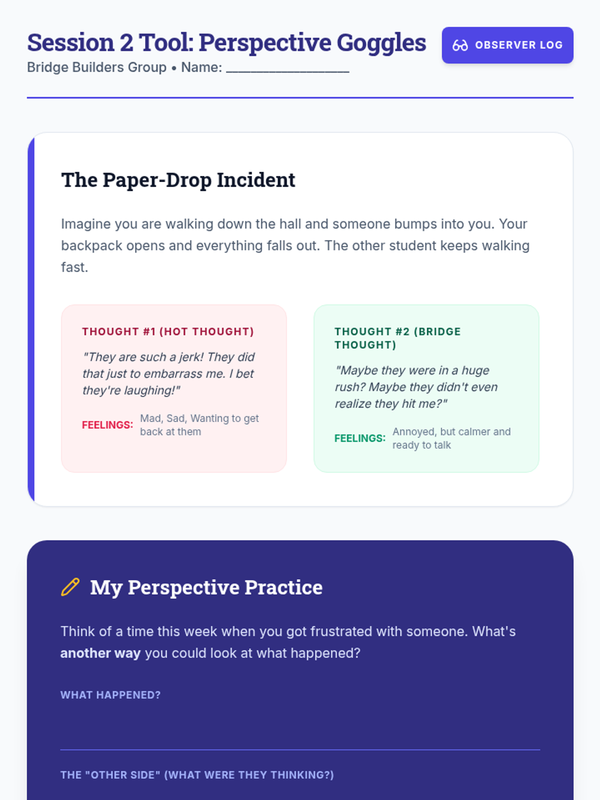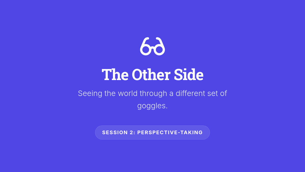 Introduces perspective-taking through the 'Other Side' model, helping students understand different viewpoints in a conflict.