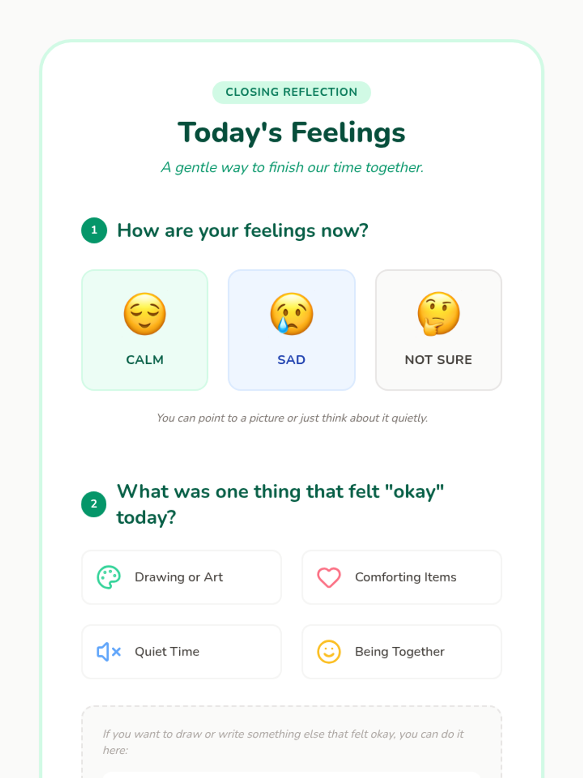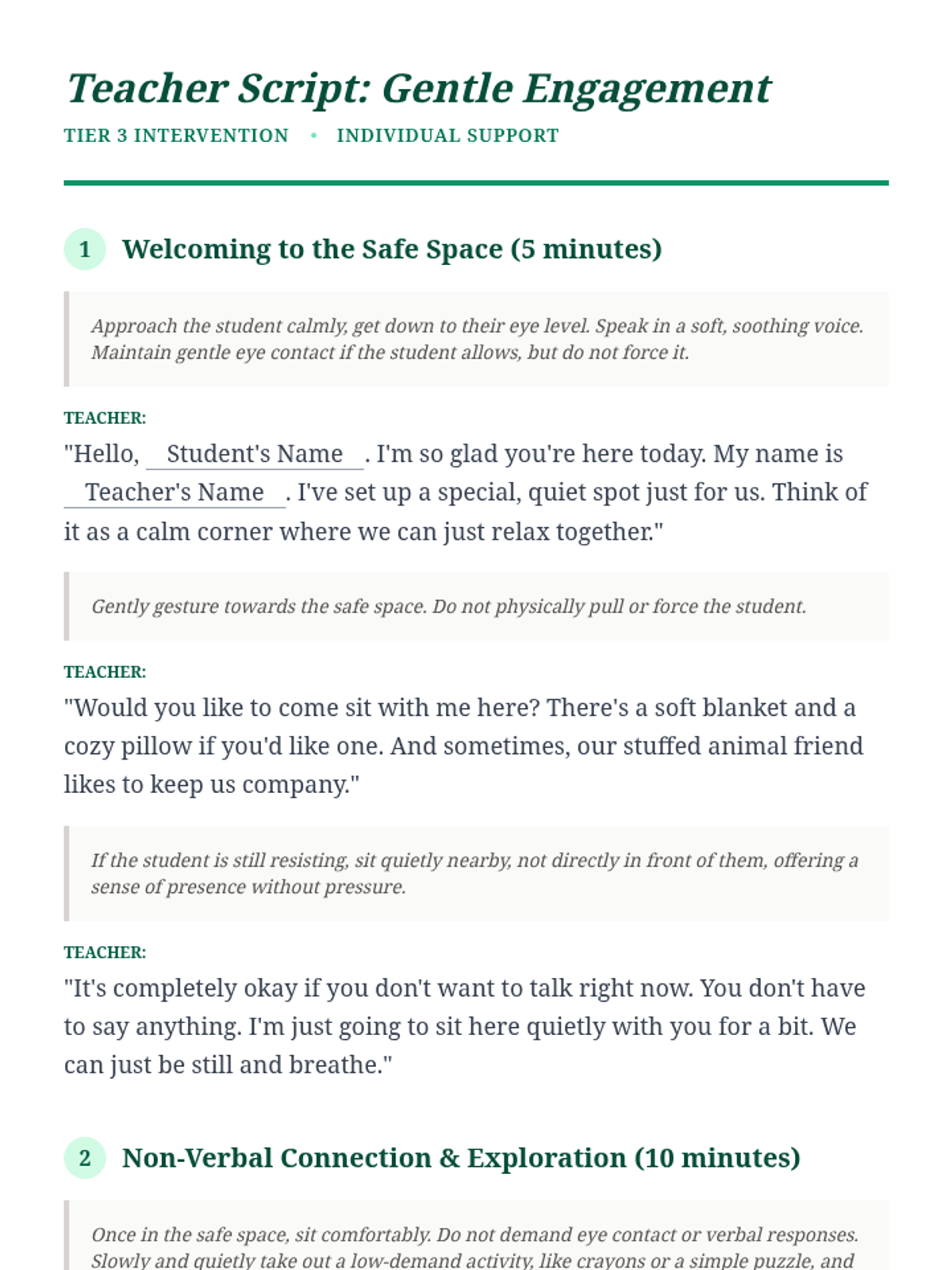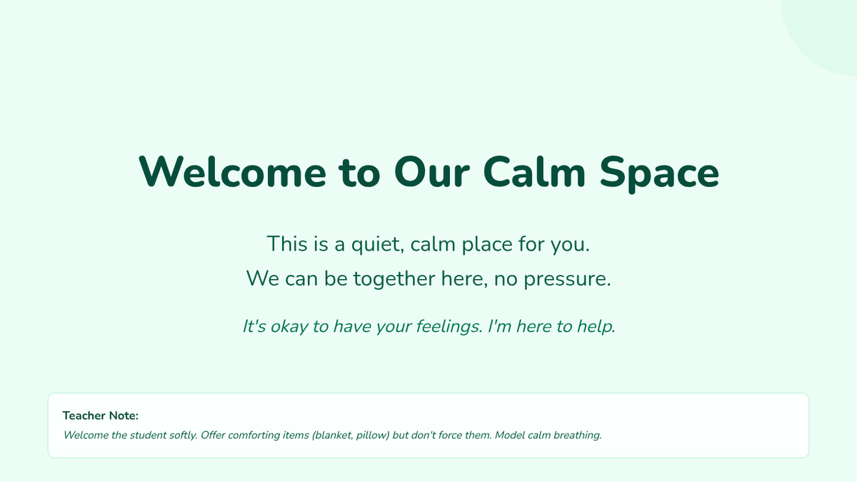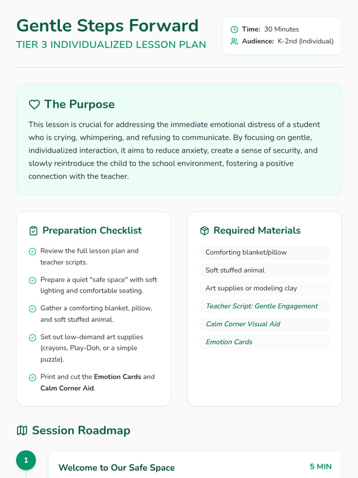 This lesson provides a gentle, individualized approach for a Kindergarten student exhibiting extreme school refusal behaviors. It focuses on building trust, creating a safe space, and gradually introducing engagement through non-verbal and low-demand activities.