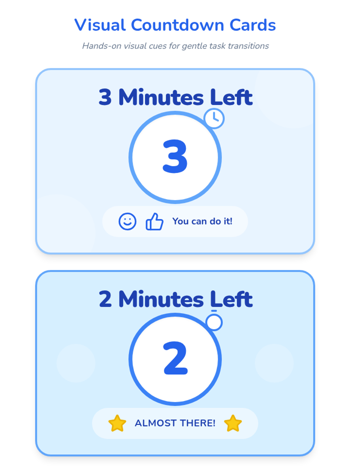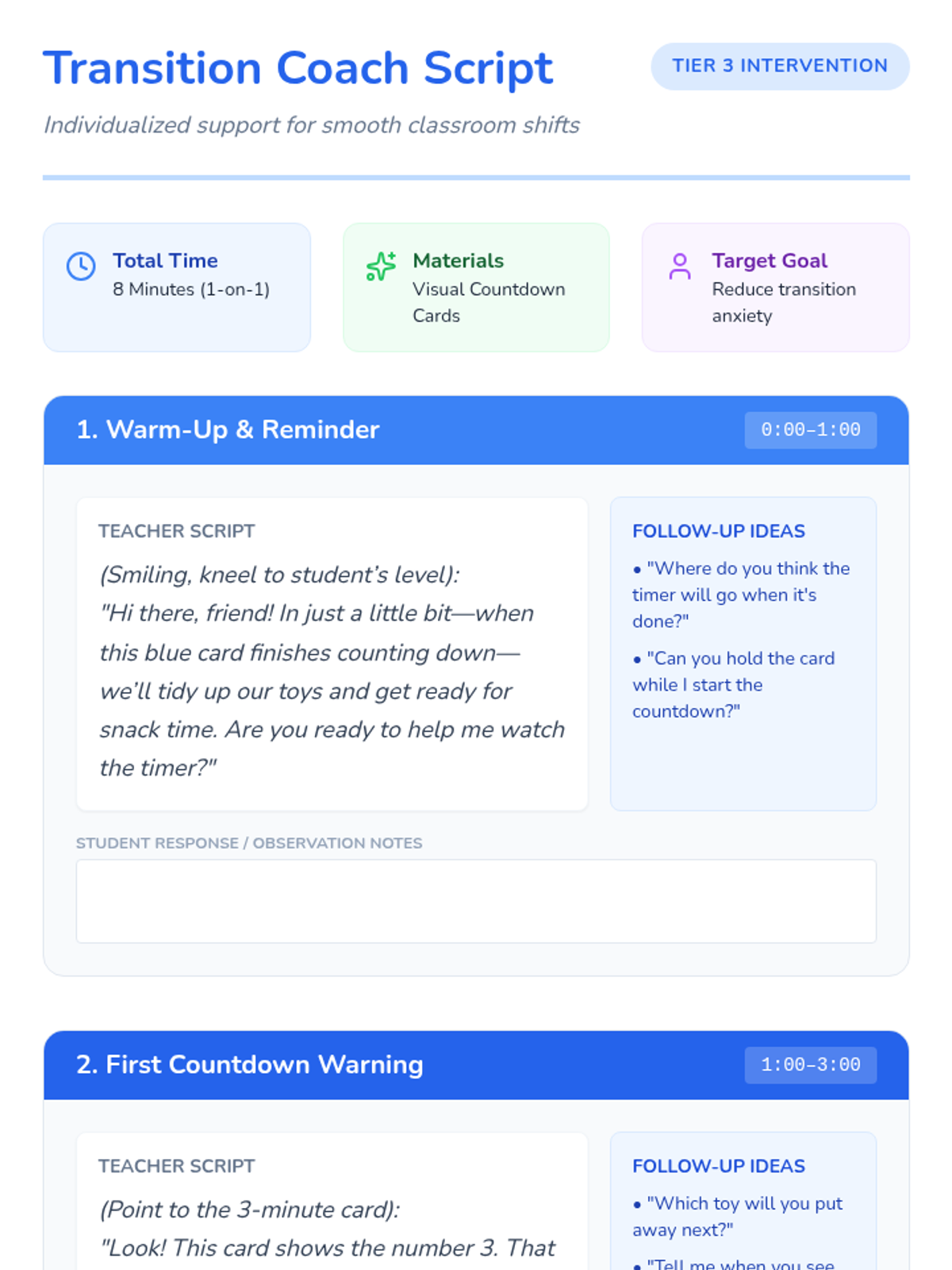 A one-on-one Tier 3 session designed to help a Pre-K student move smoothly between tasks using a short scripted interaction and hands-on visual countdown cards. This lesson empowers the child with clear cues, positive reinforcement, and engaging visuals to reduce anxiety around transitions.