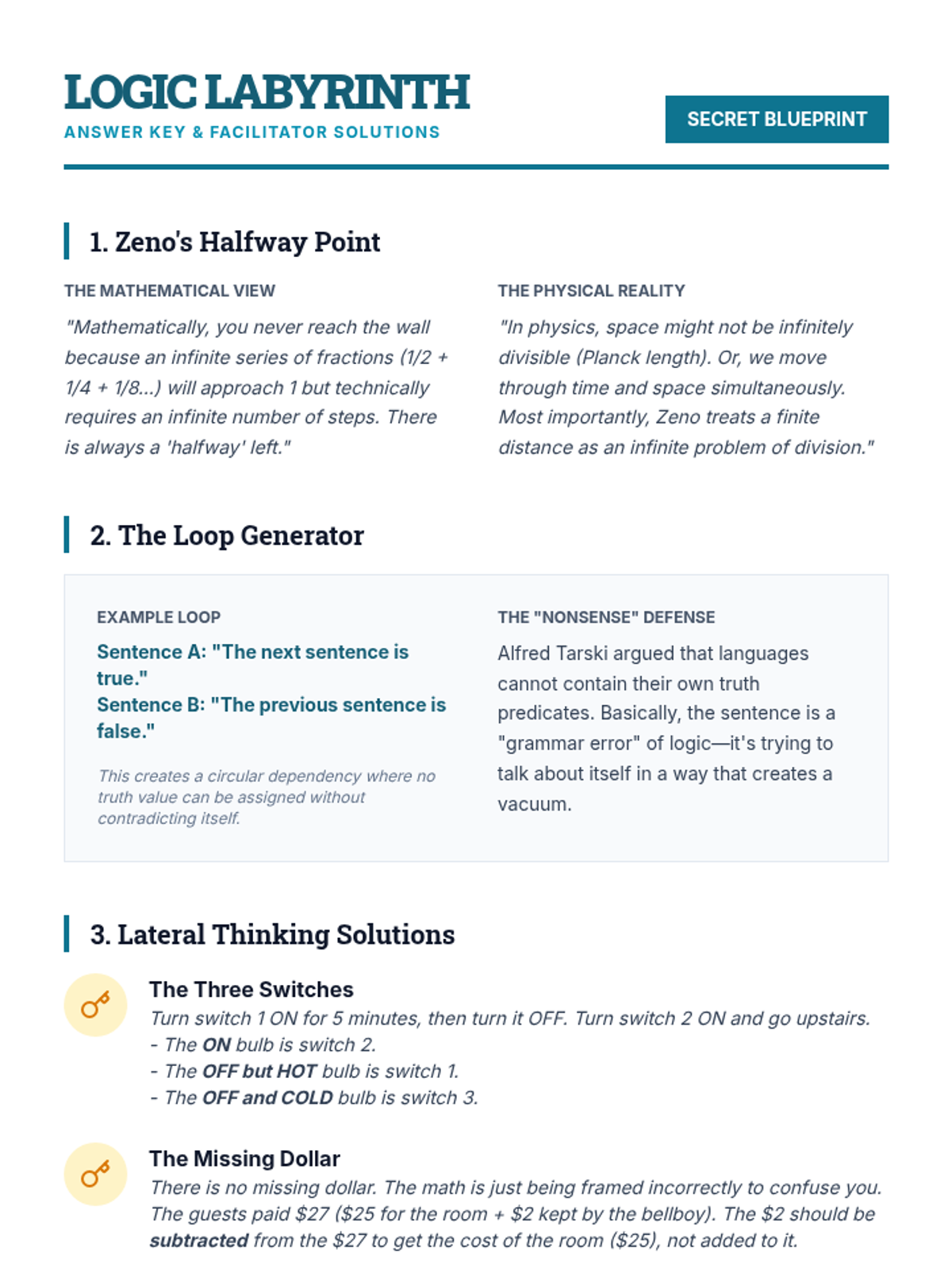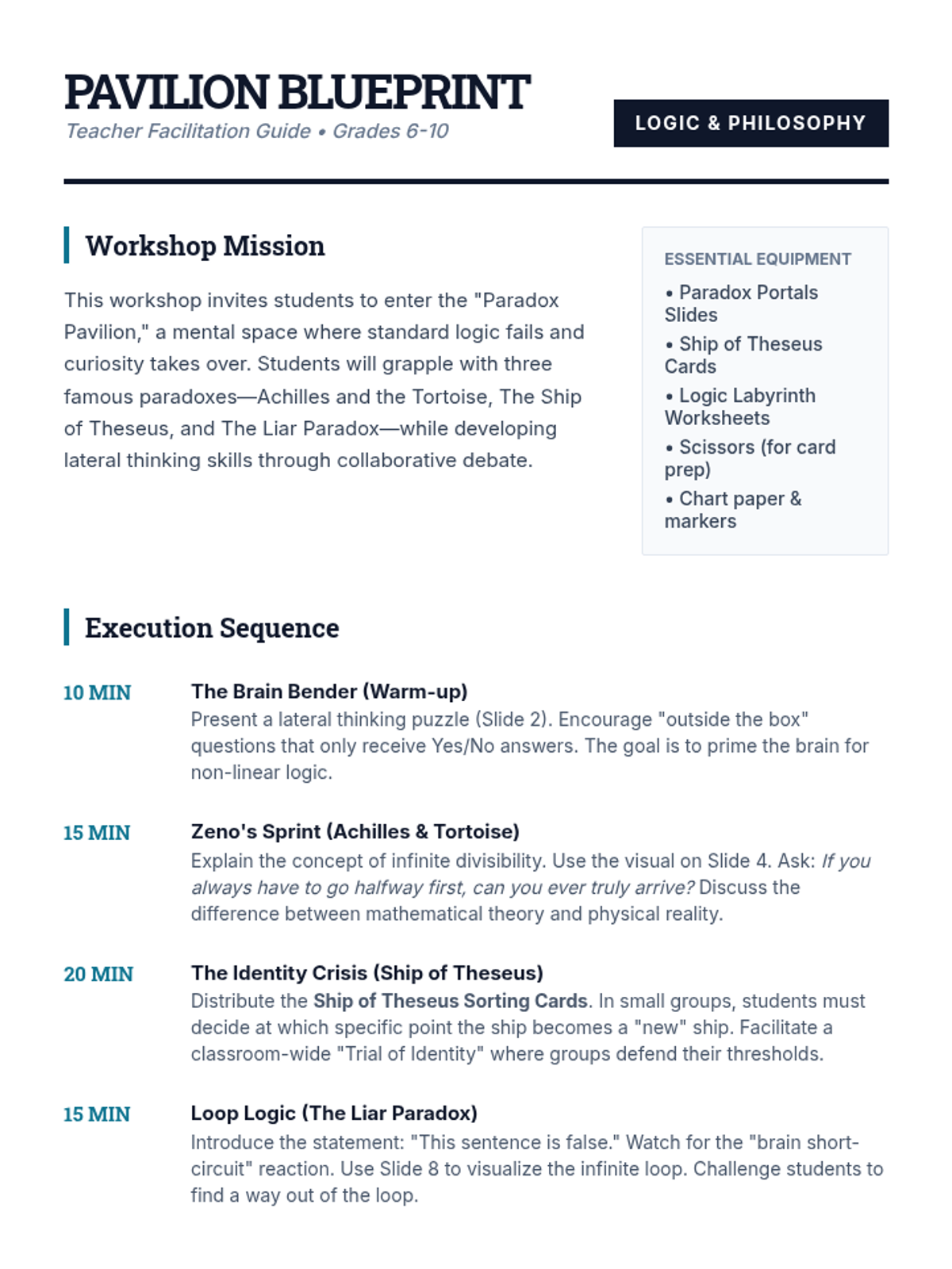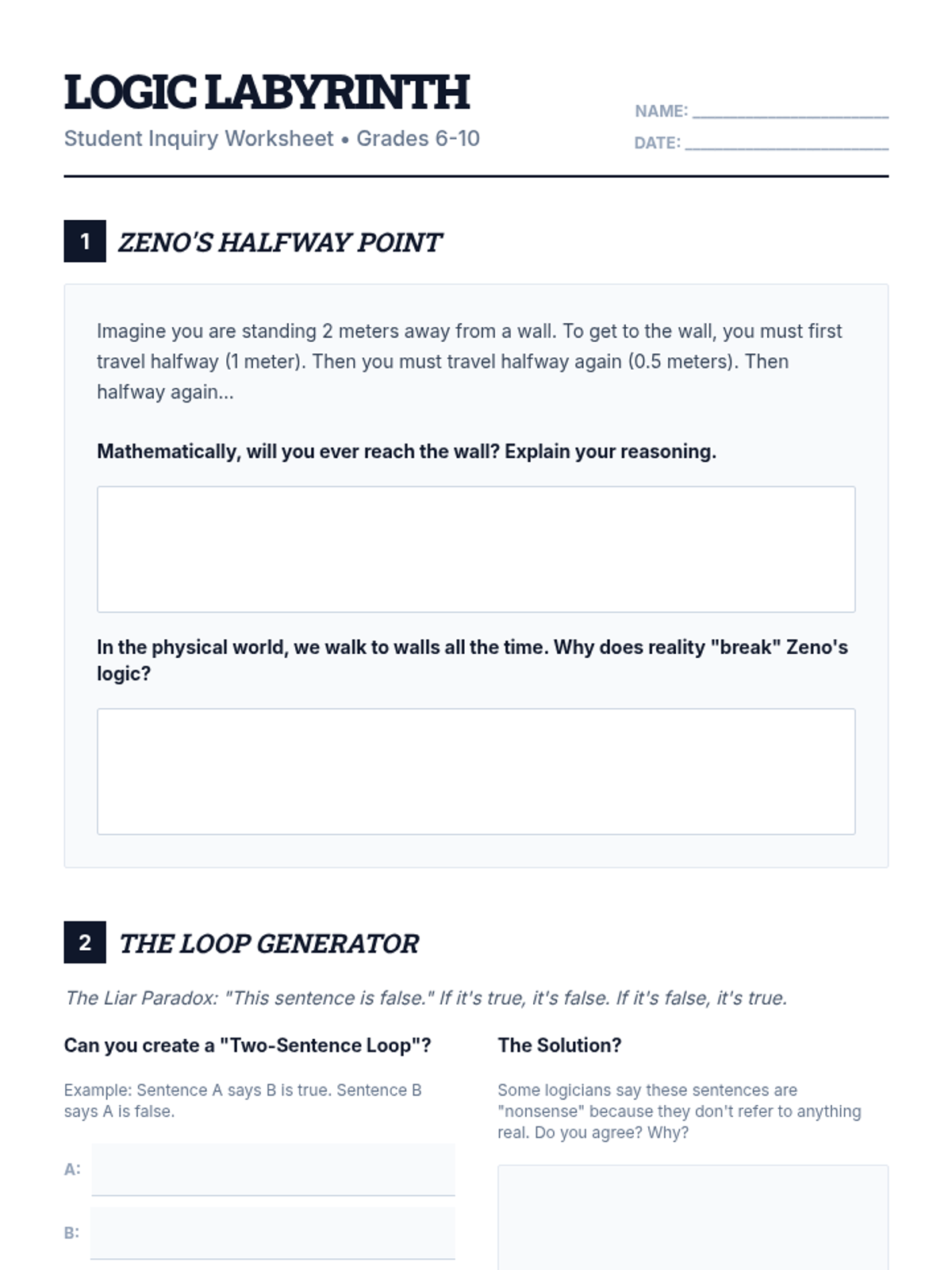 An inquiry-based workshop where students explore philosophical paradoxes and lateral thinking puzzles to sharpen critical reasoning skills.