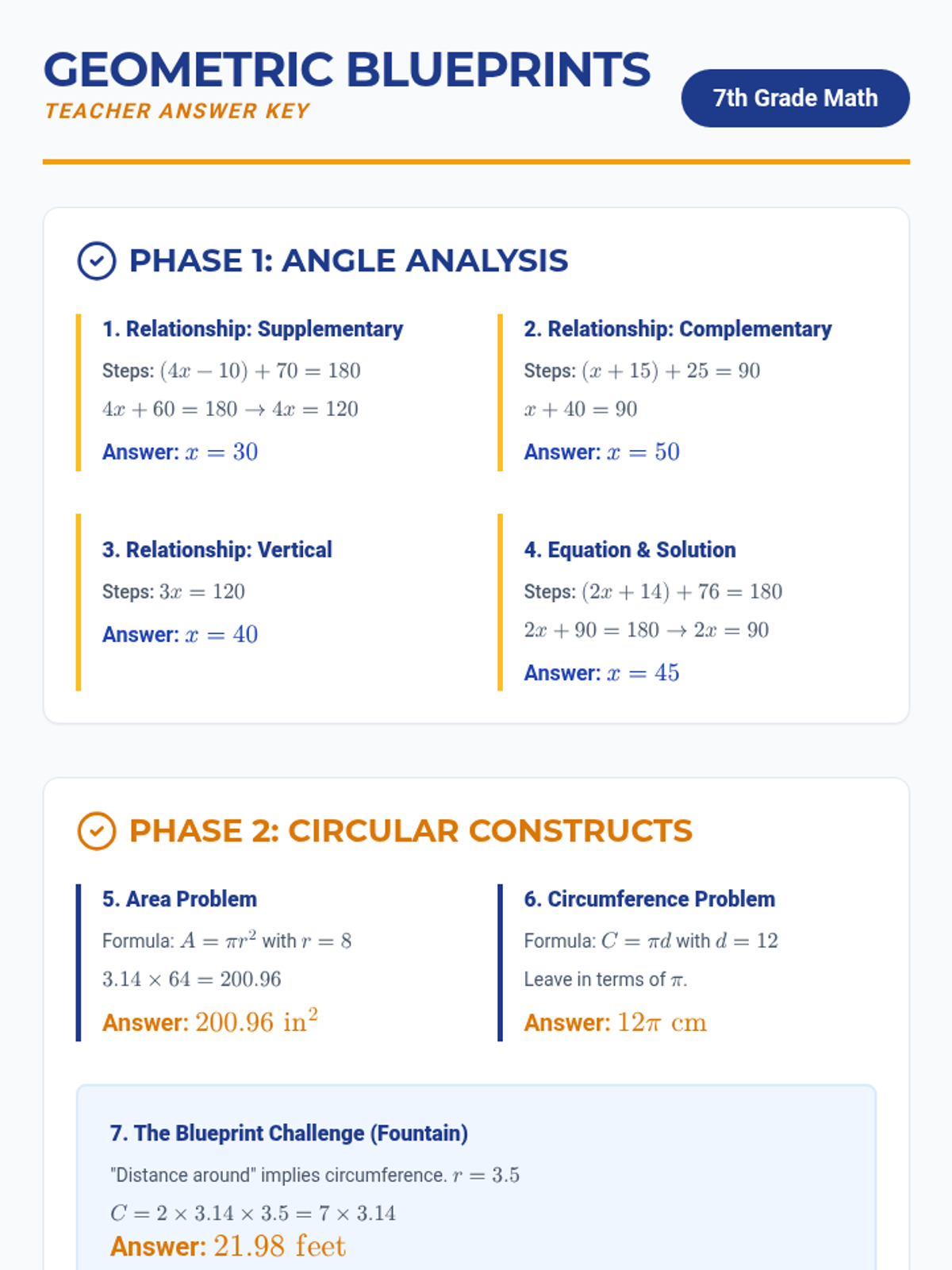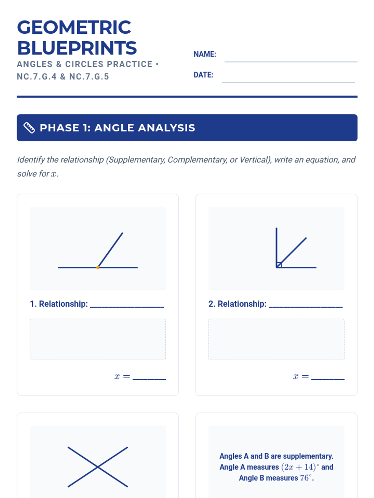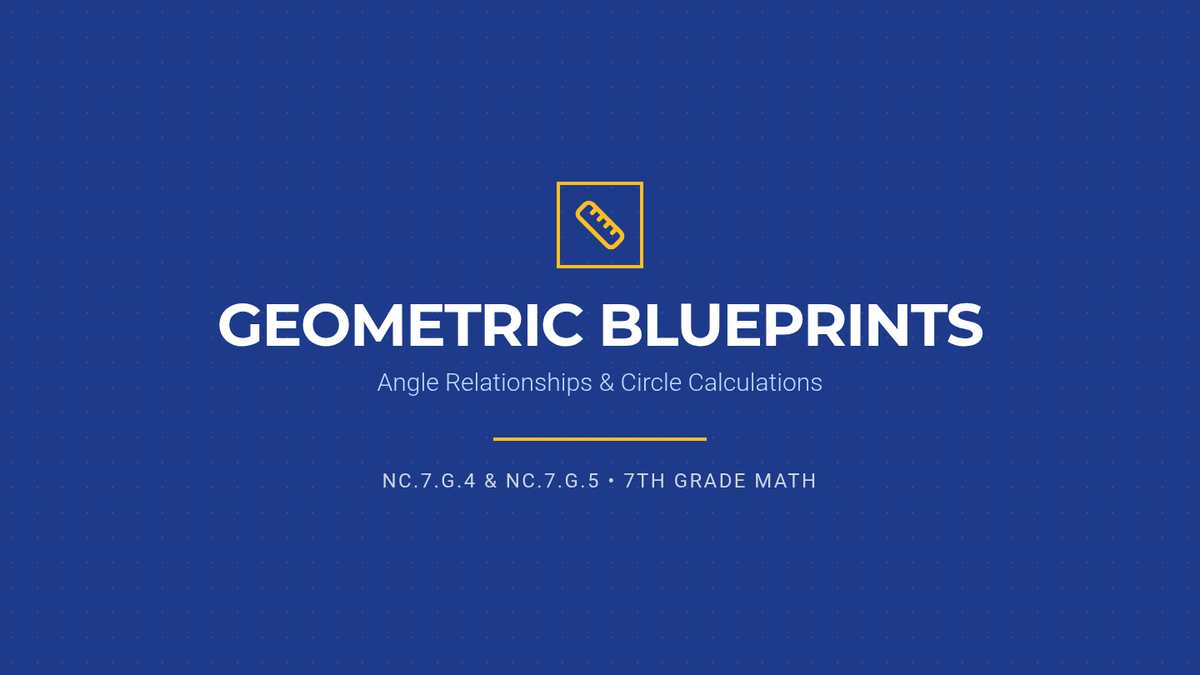 A comprehensive lesson on angle relationships (supplementary, complementary, vertical) and circle geometry (area, circumference) aligned to NC 7th grade math standards. Students will solve multi-step problems using equations and geometric facts.