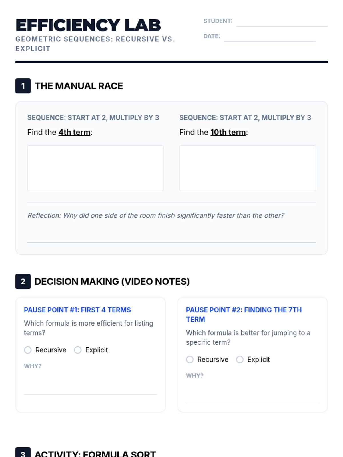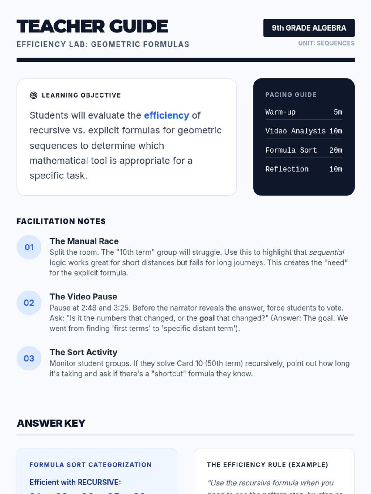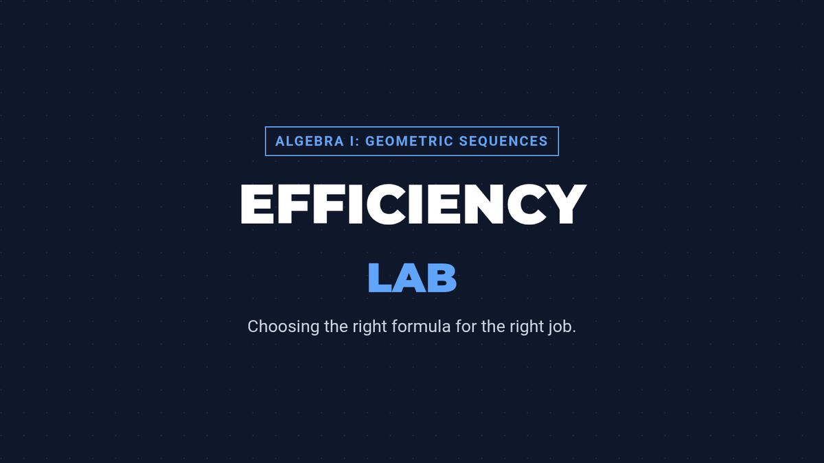 Students will learn to distinguish between recursive and explicit geometric formulas based on efficiency. The lesson focuses on choosing the right tool for the job: sequential listing vs. jumping to distant terms.