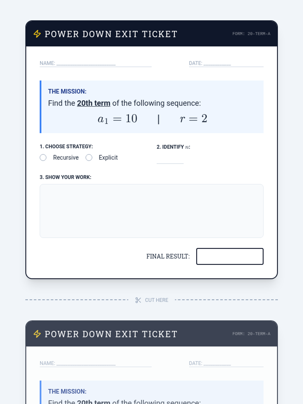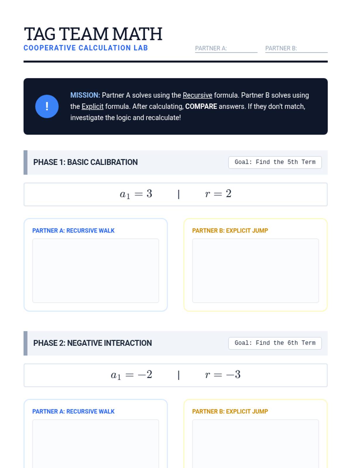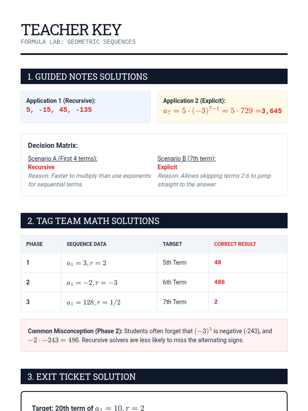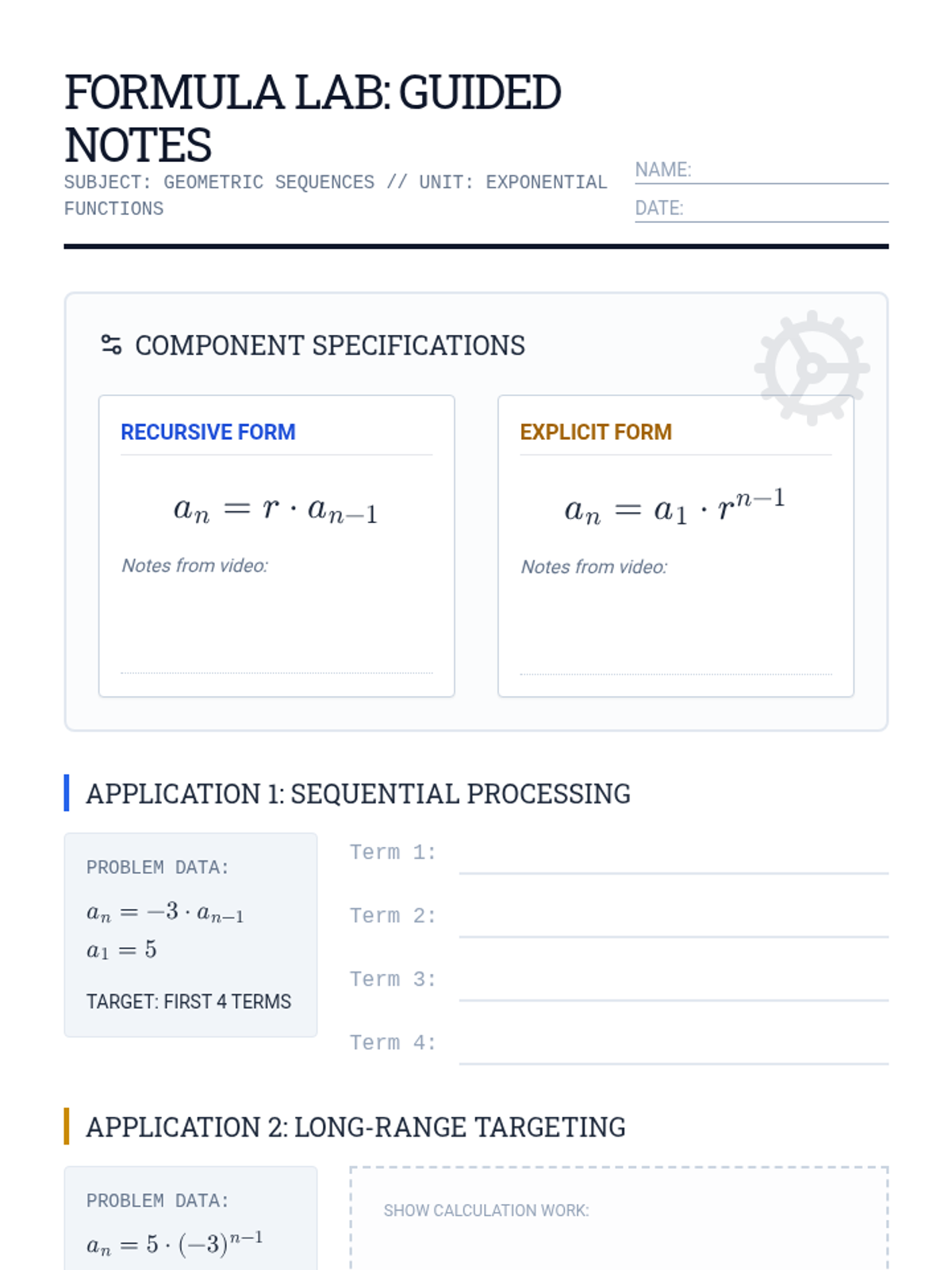 A high school math lesson focused on using recursive and explicit formulas to find terms in geometric sequences, featuring guided video notes and a collaborative partner activity.