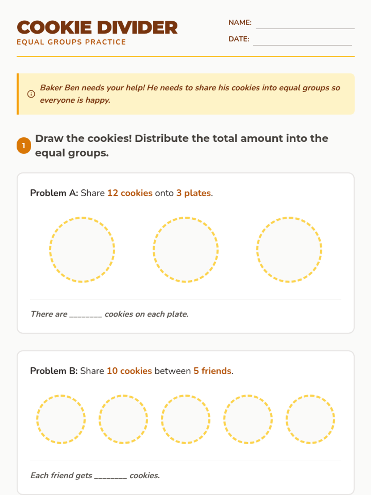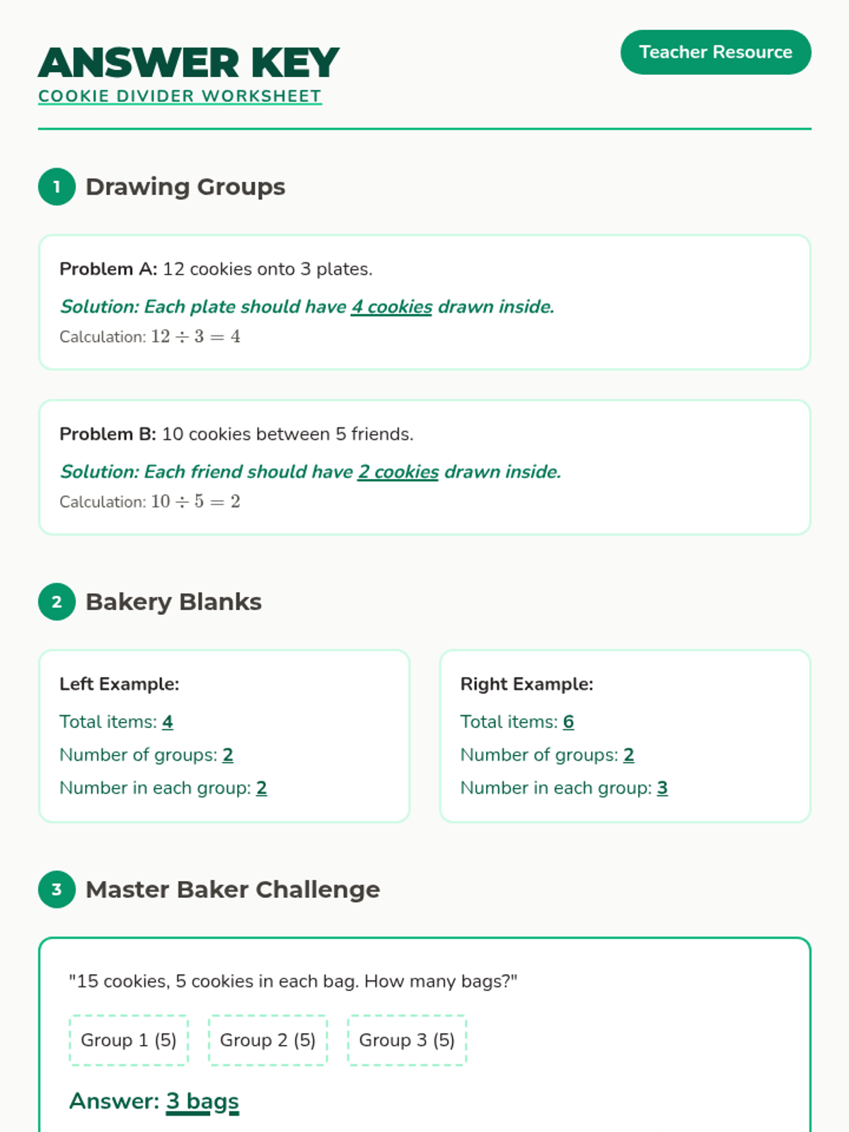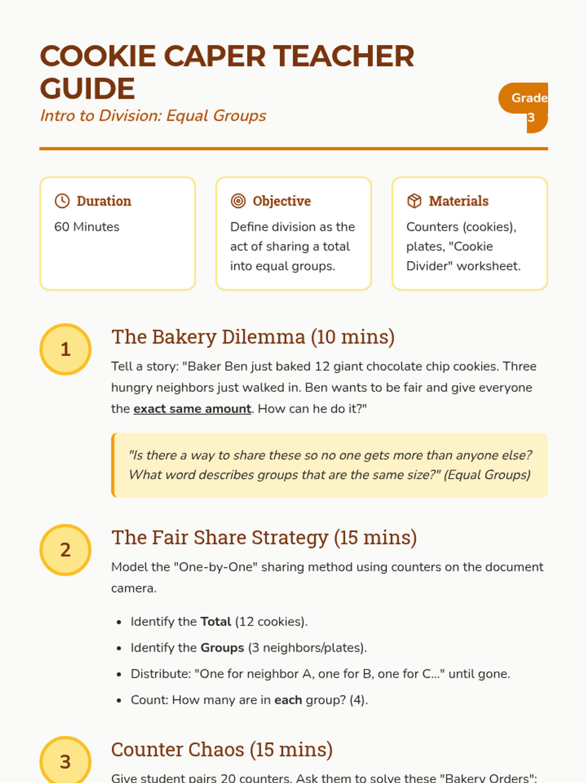 An introductory lesson on division where students learn to share items into equal groups through a fun bakery-themed narrative.