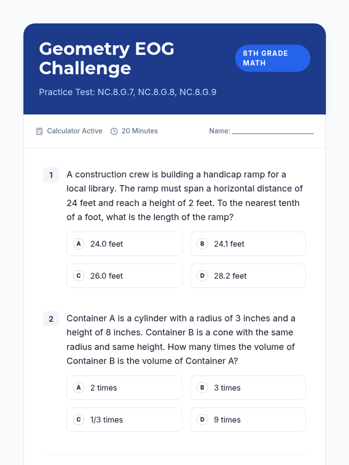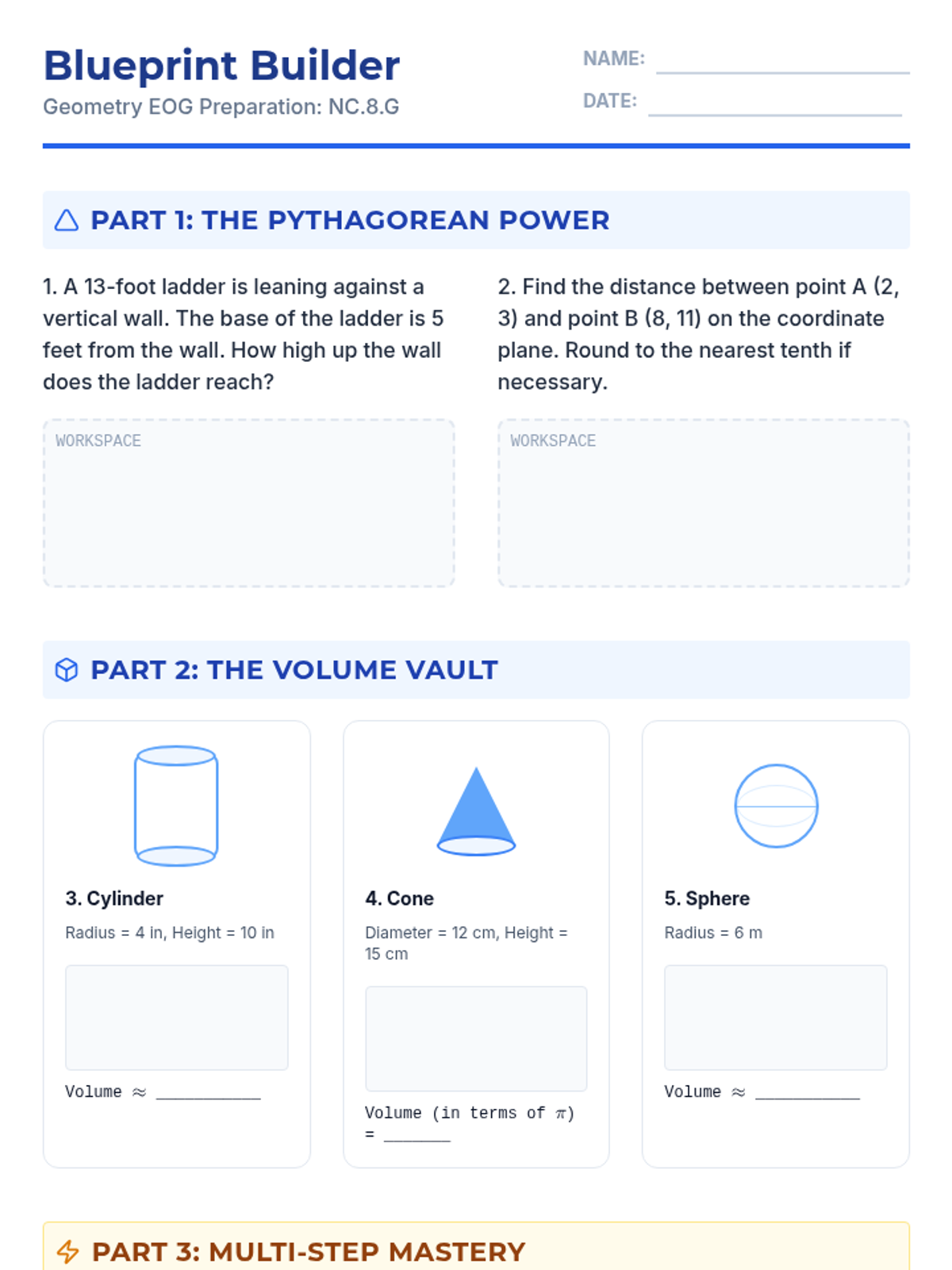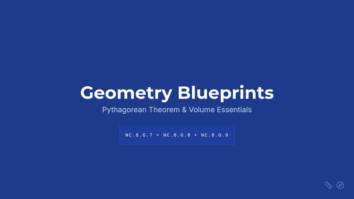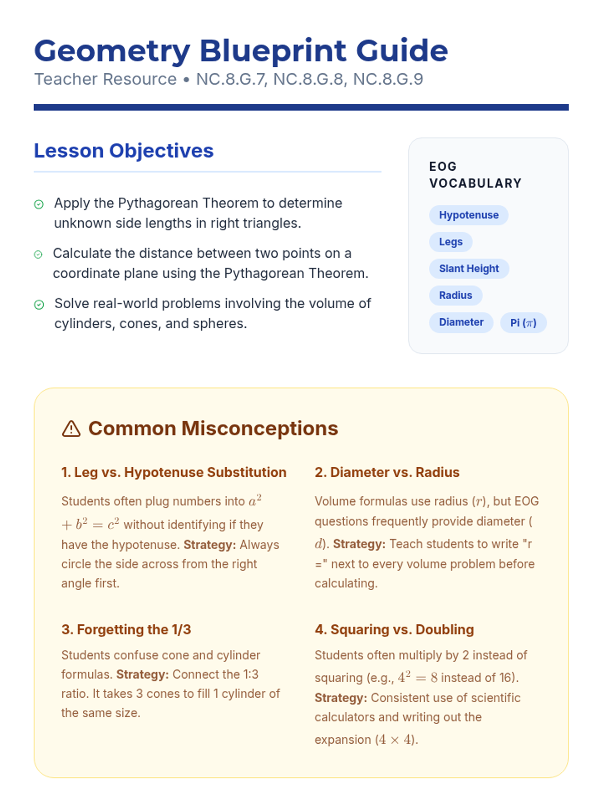 An 8th-grade geometry lesson focused on the Pythagorean Theorem and the volume of cylinders, cones, and spheres, aligned with NC.8.G standards and designed for EOG preparation.