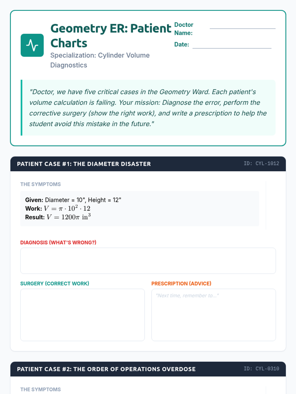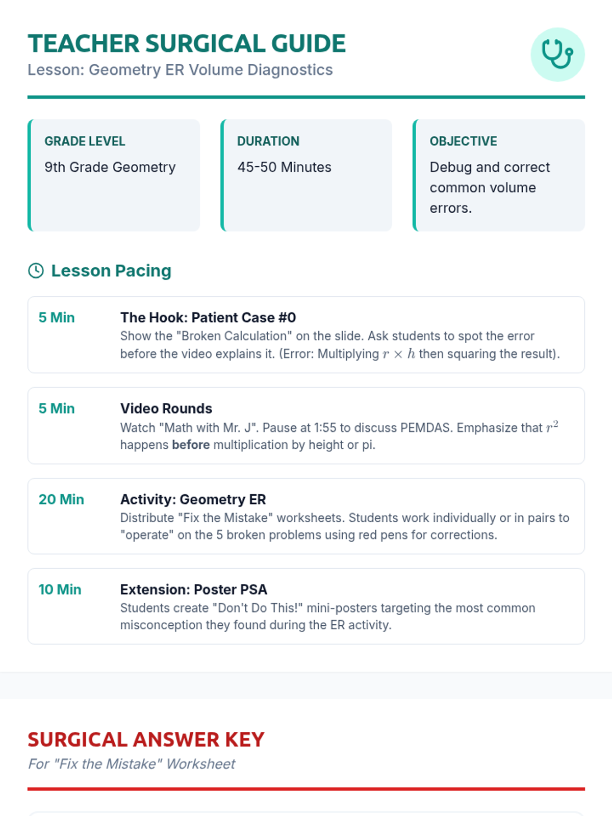 A 9th-grade geometry lesson where students act as 'math doctors' to diagnose and repair common errors in cylinder volume calculations, featuring a video-based conceptual check and a creative poster extension.
