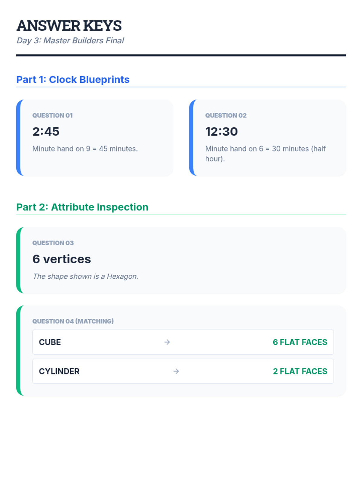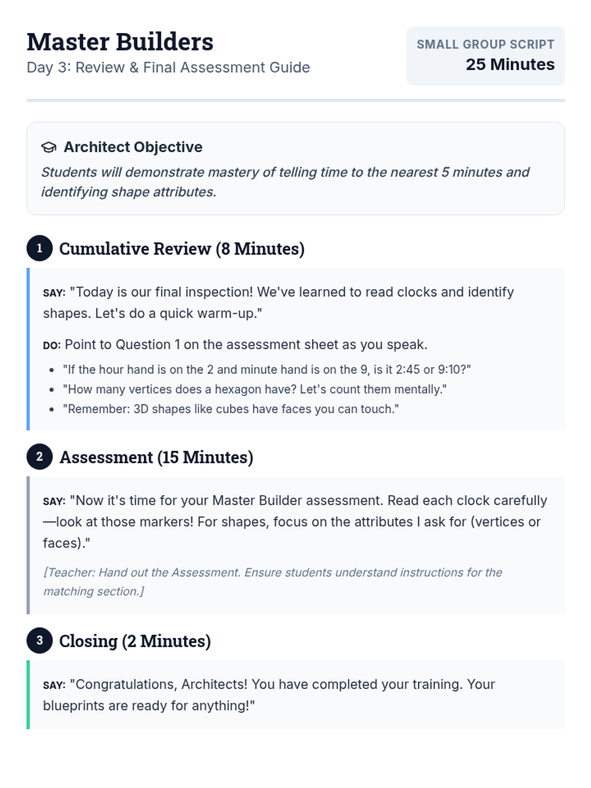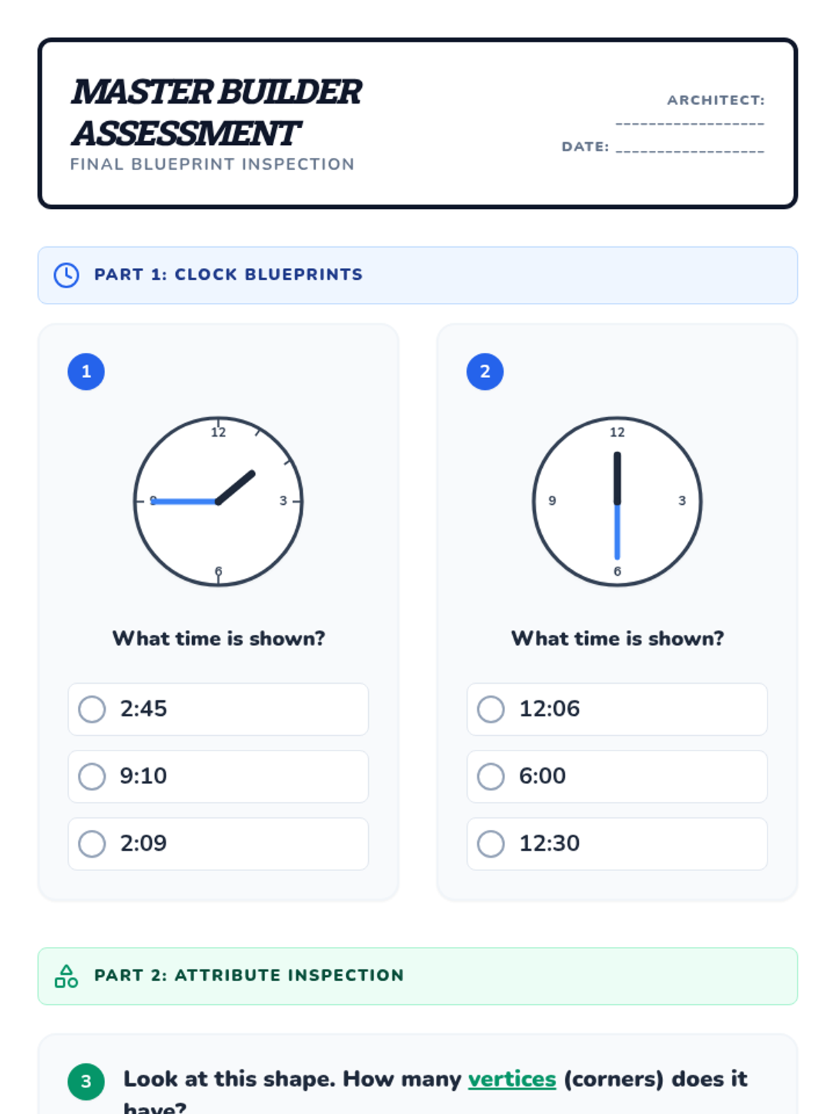 A cumulative review of time and shape attributes followed by a formal assessment to track student growth toward RIT 180 goals.