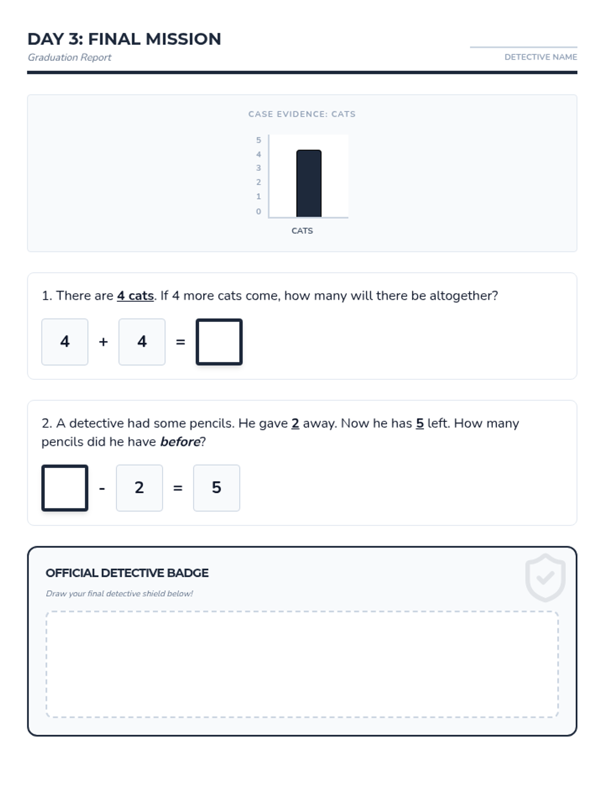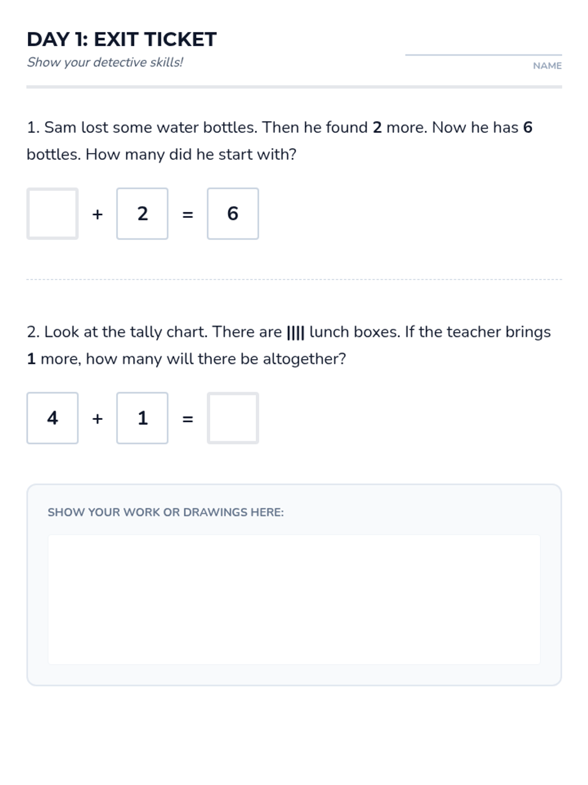 Focuses on addition word problems (joining) using farm-themed stories. Students practice drawing pictures and using ten-frames to represent addition equations.