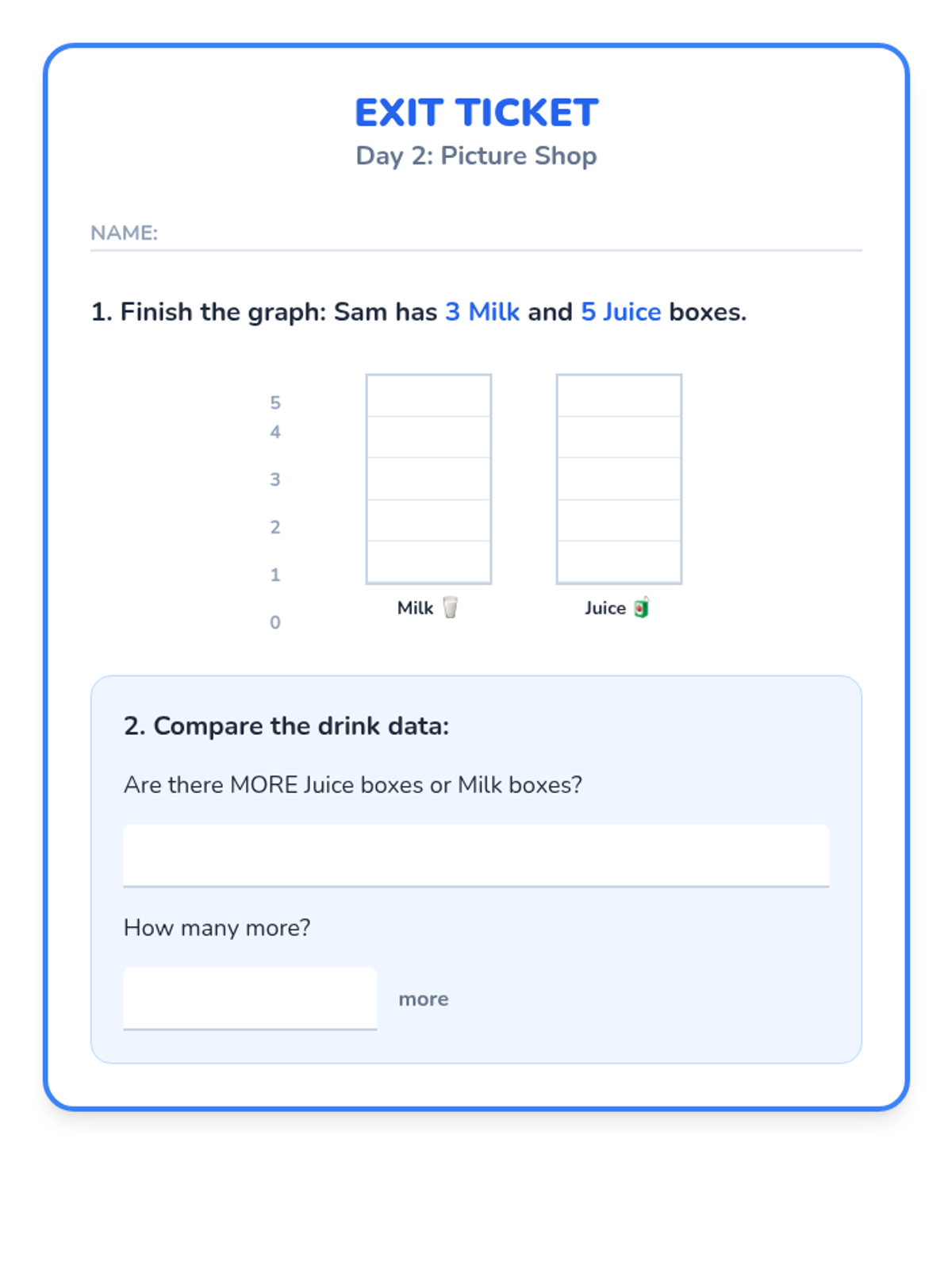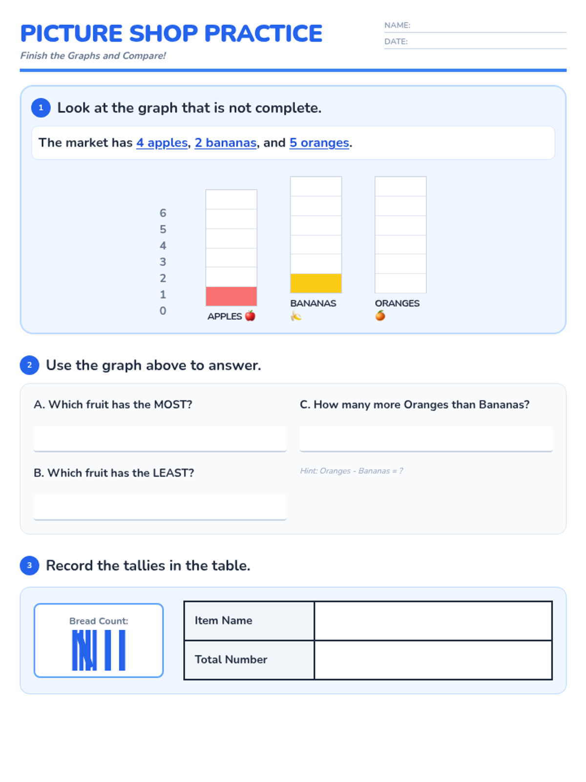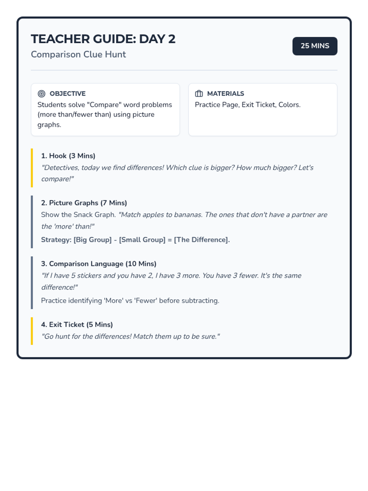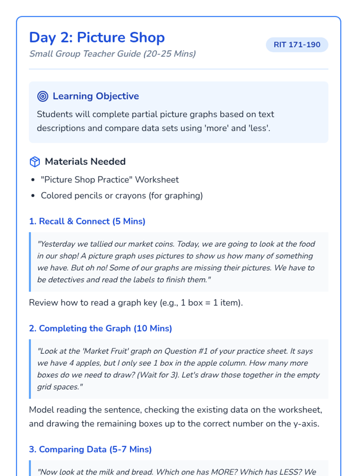 Students complete picture graphs based on text descriptions and compare data to find 'more' or 'less'. This lesson directly targets the NWEA skill of completing partial graphs and interpreting visual data.