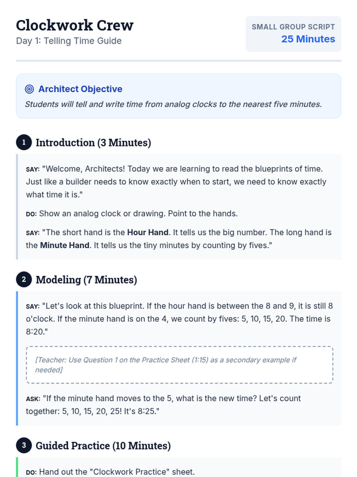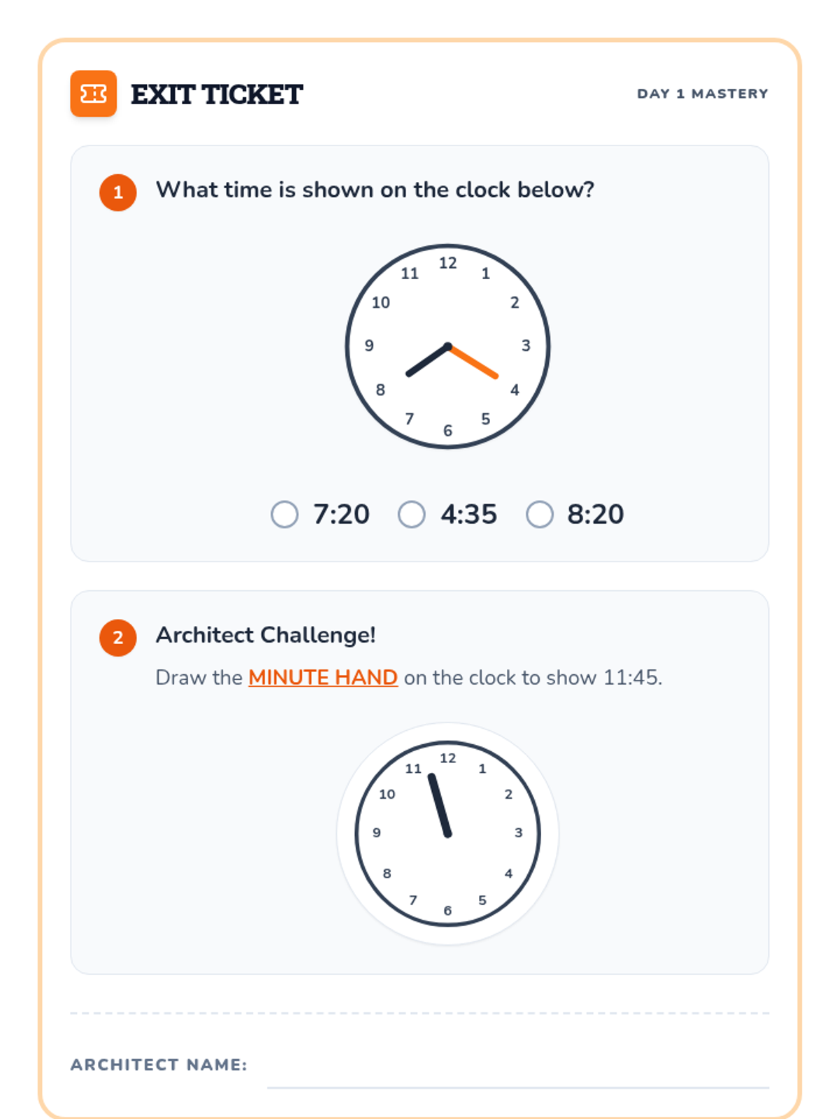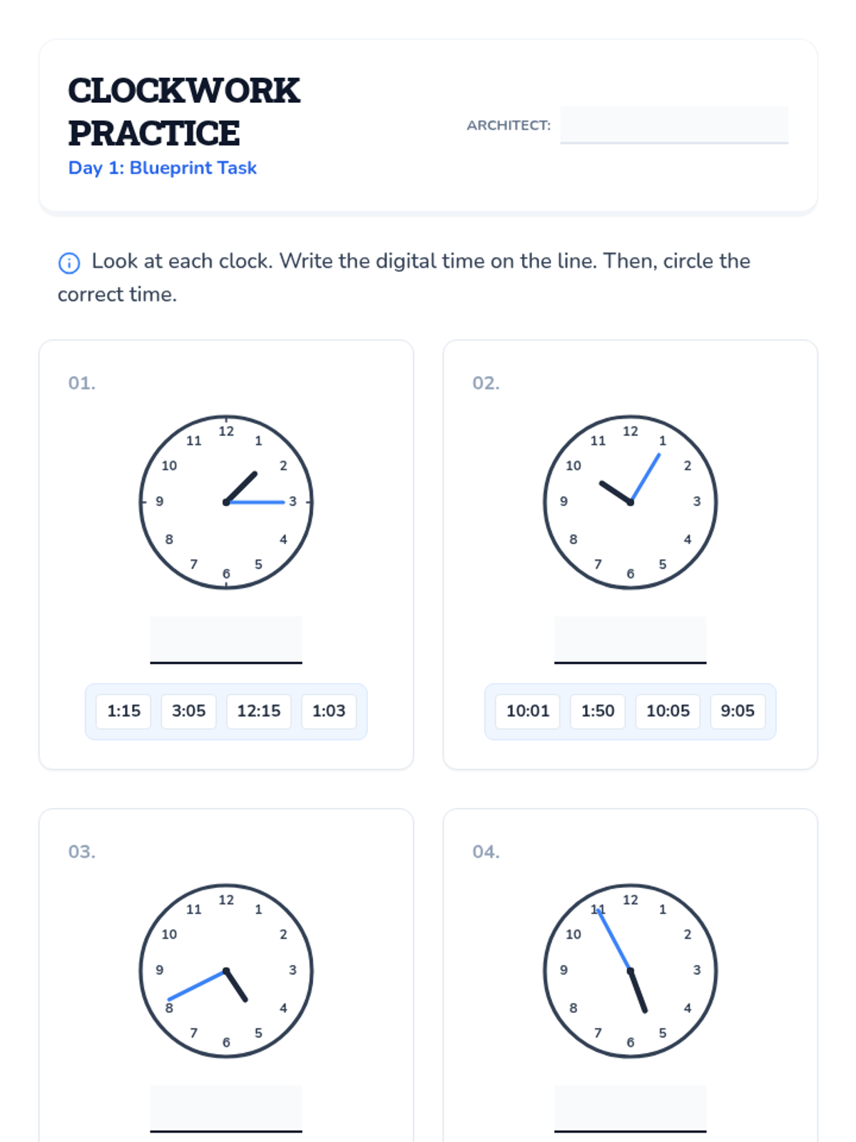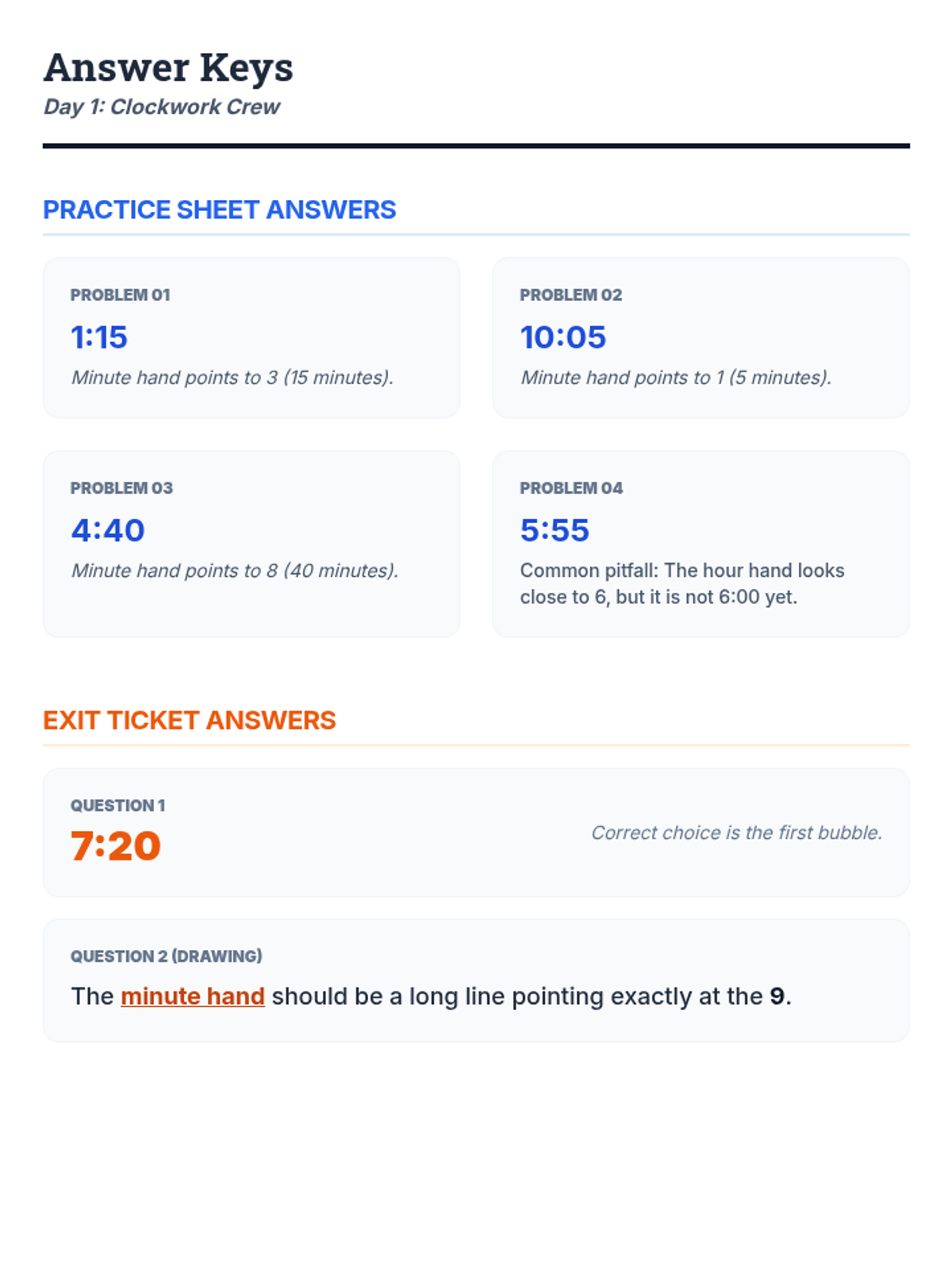 Mastering telling time to the nearest 5 minutes on an analog clock through guided practice and independent application.
