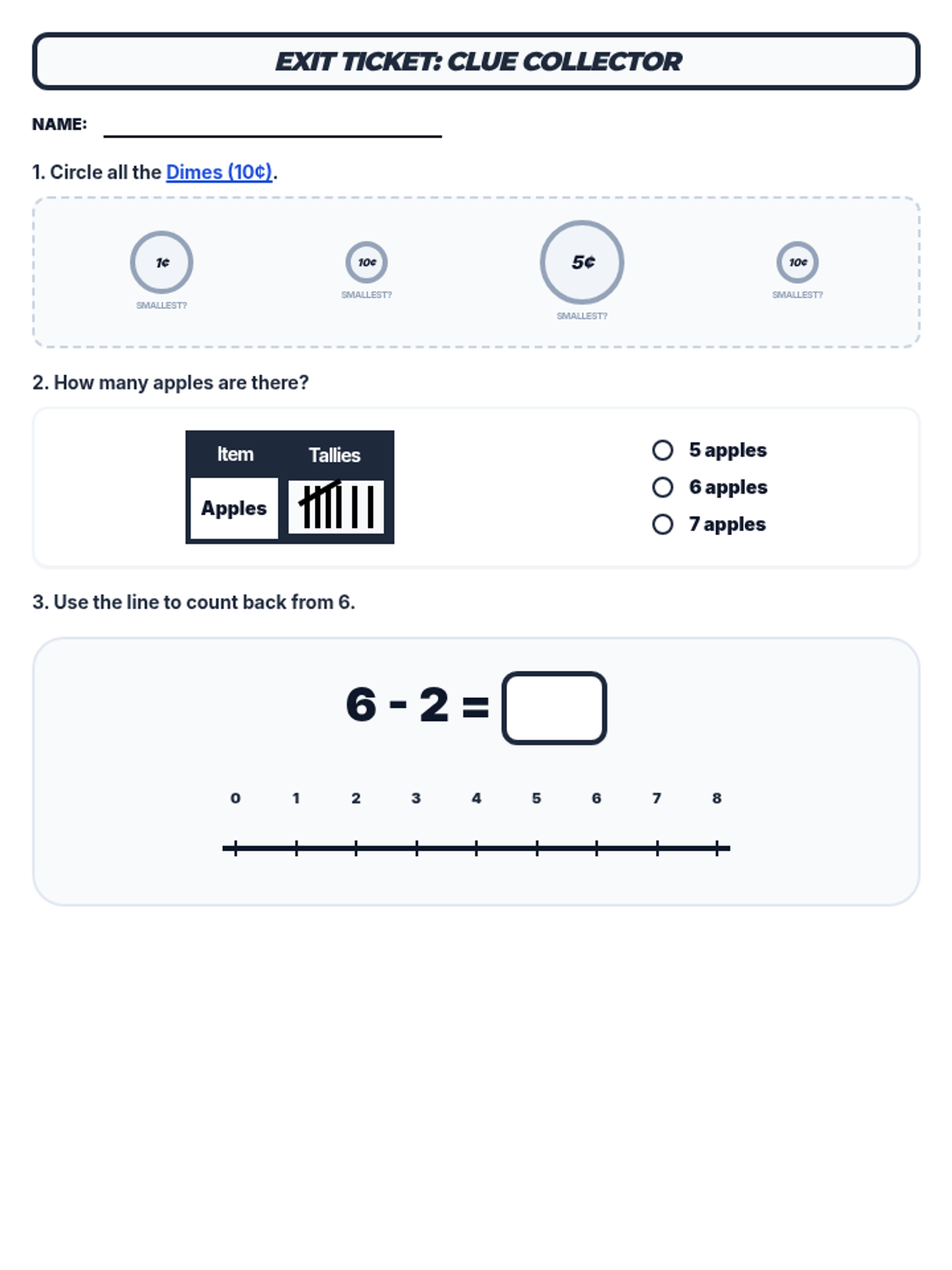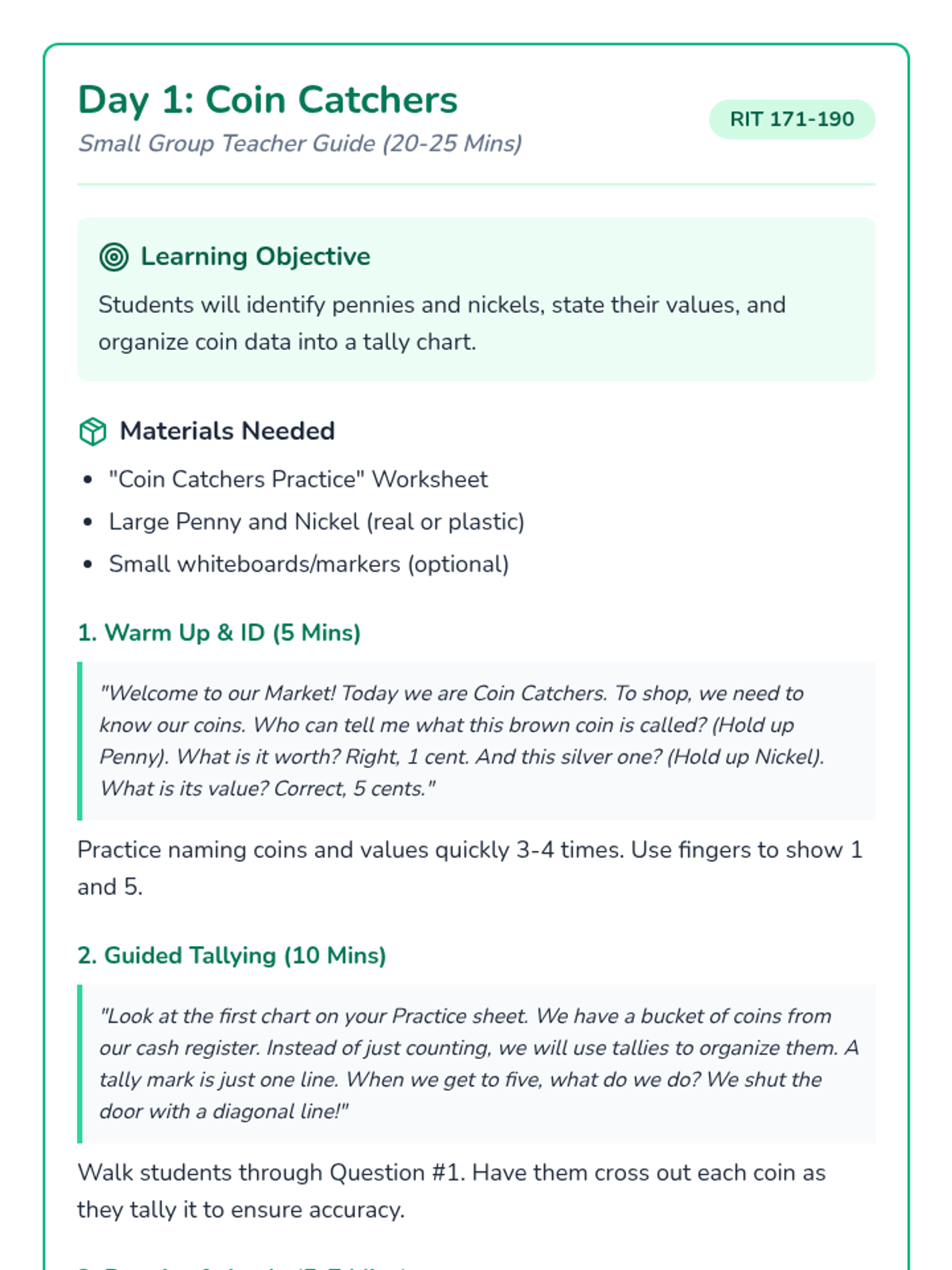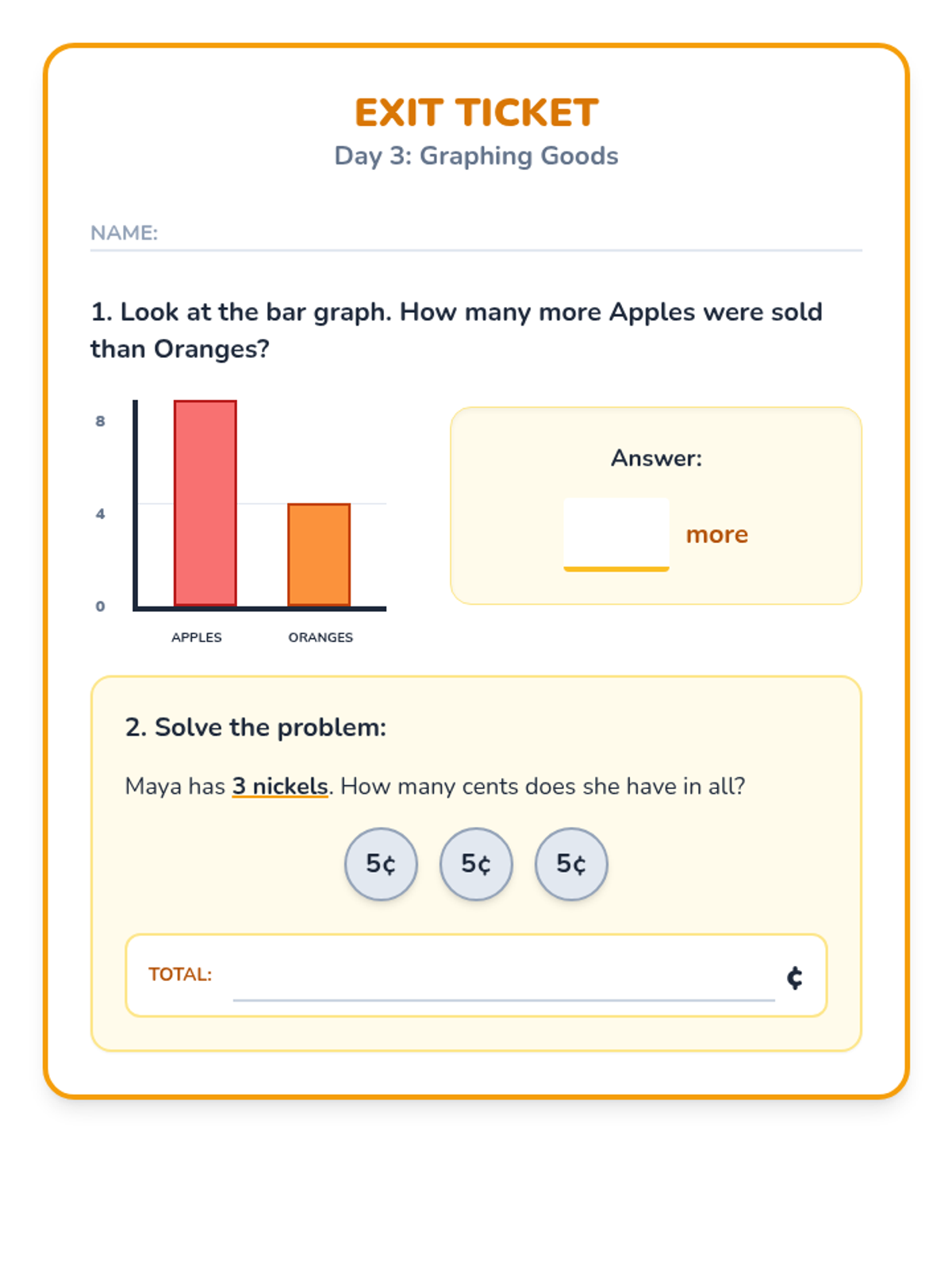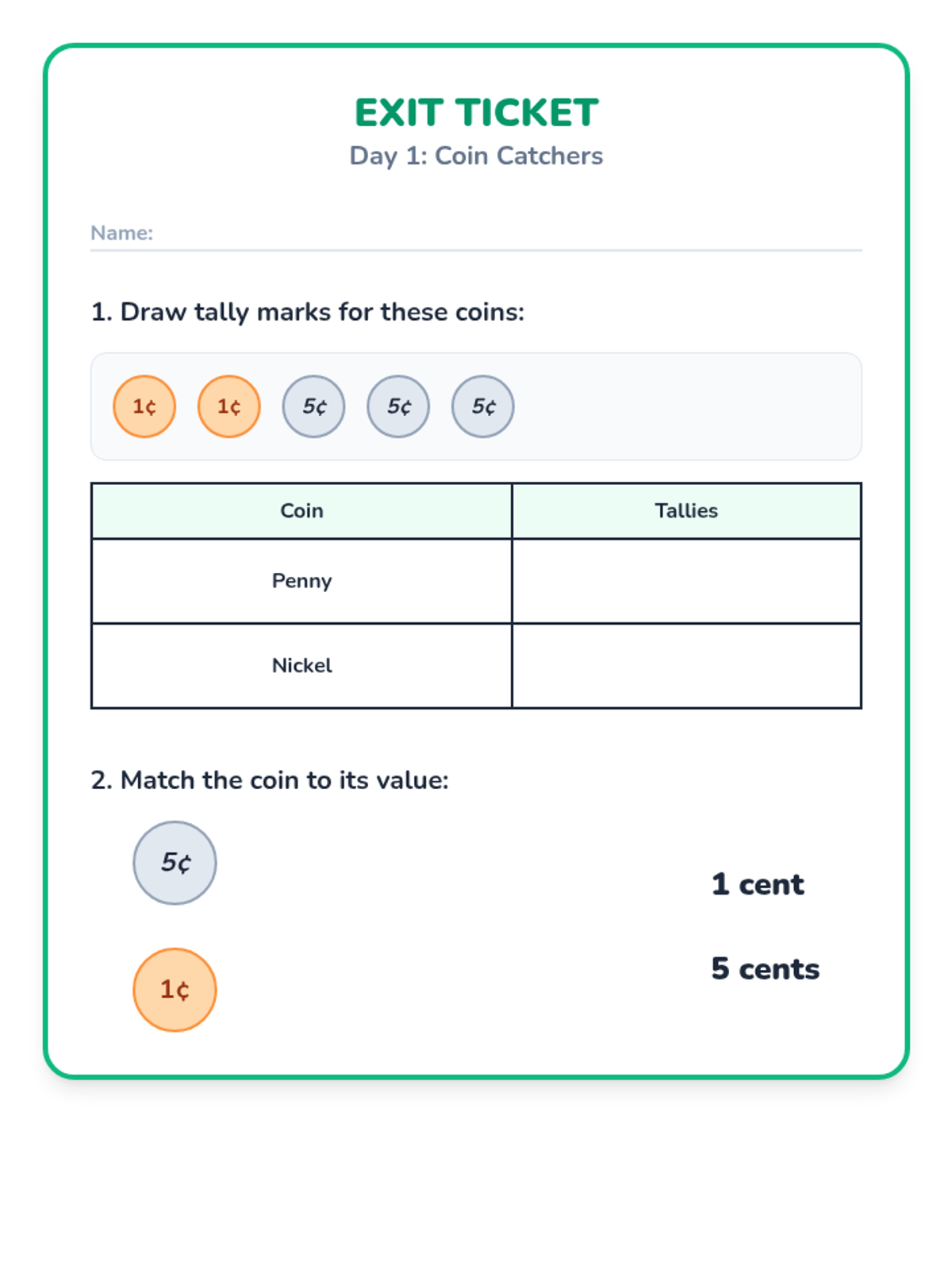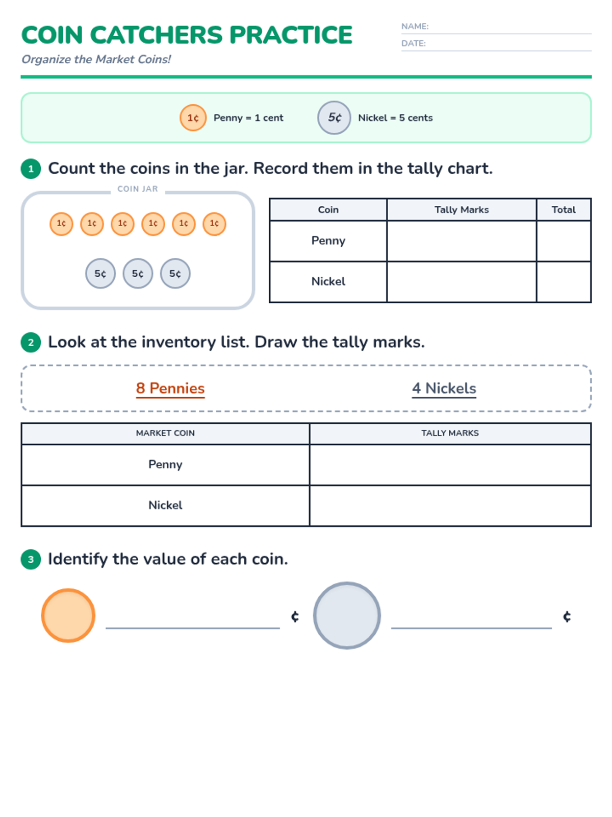 Focuses on tally charts and pennies/nickels. Students learn to read tallies and identify coins to 'buy' items from the market.