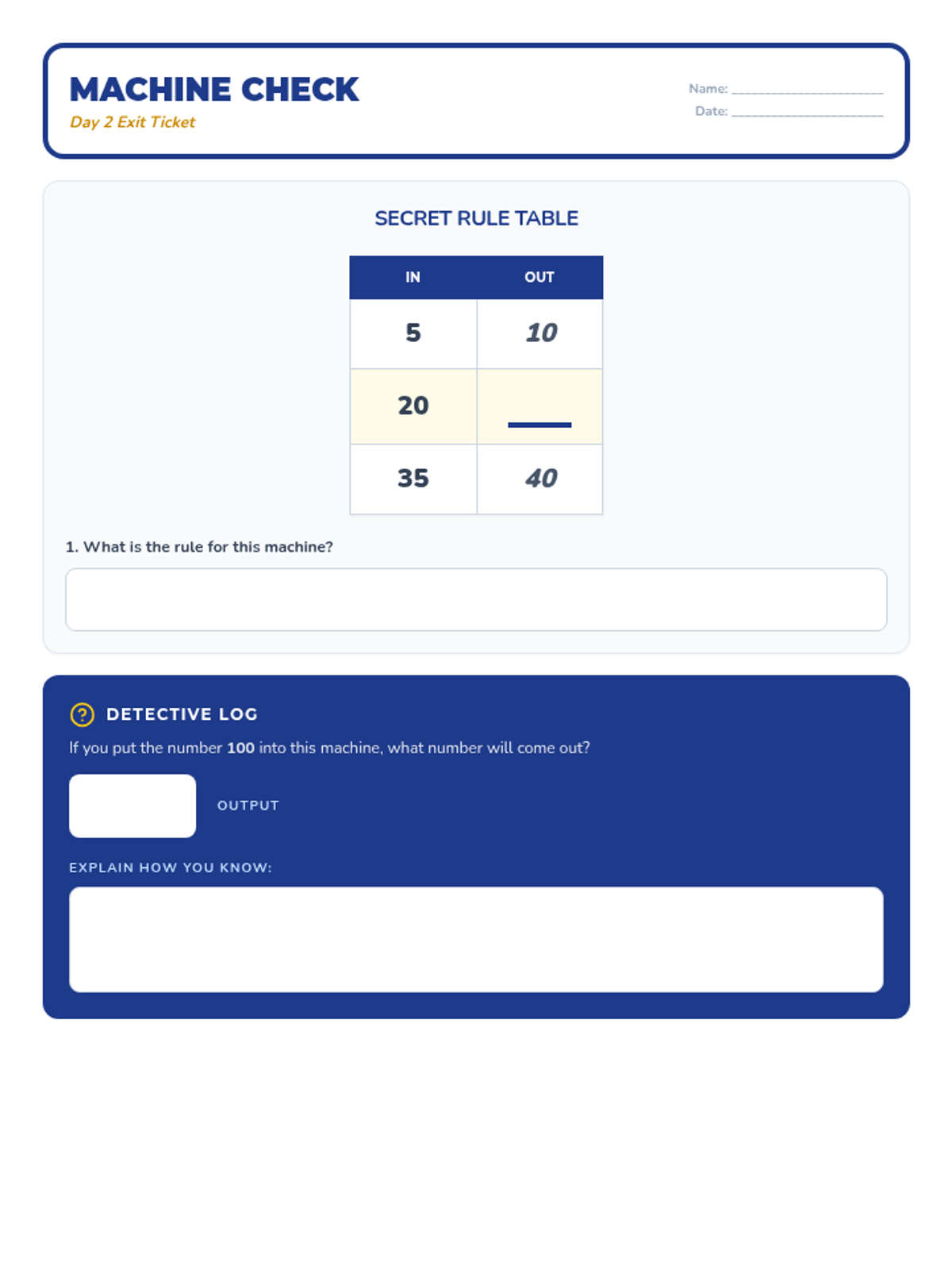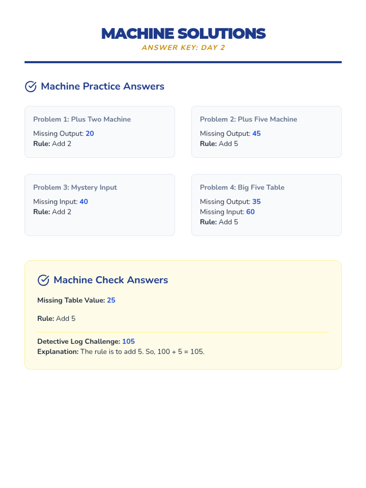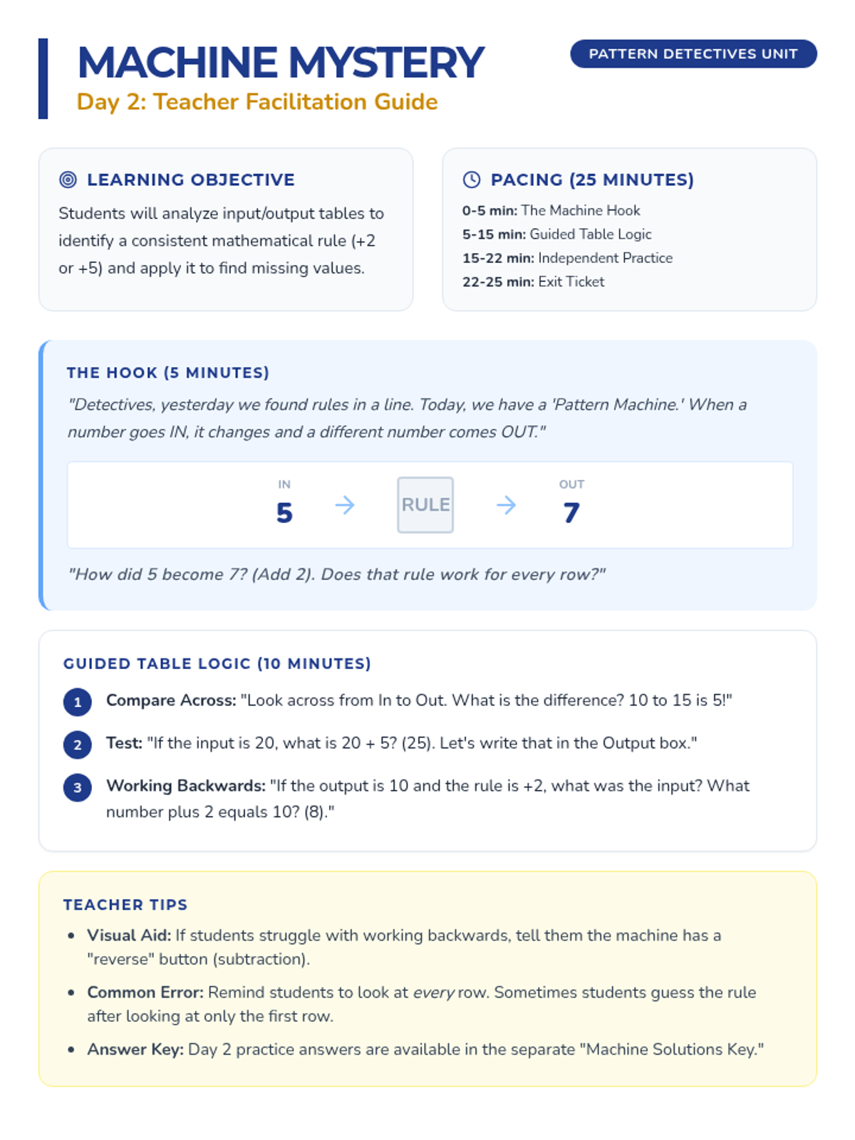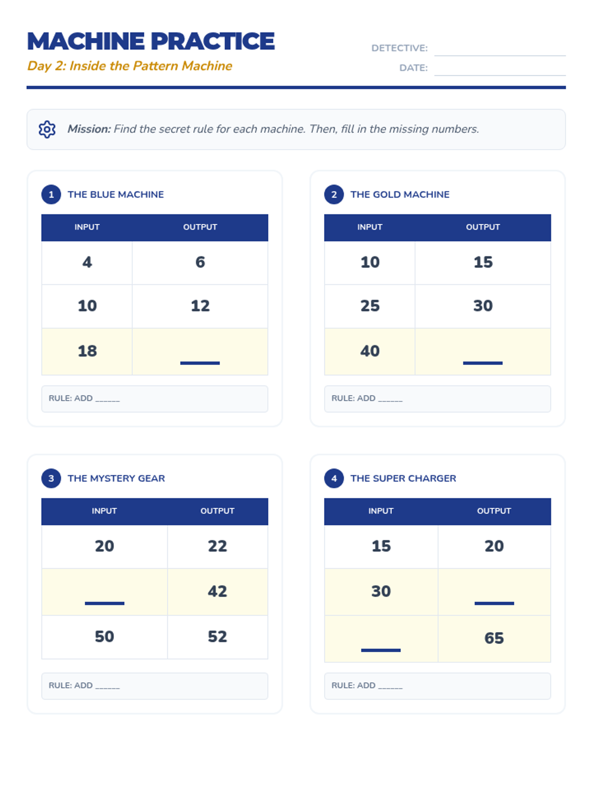 Introduces input/output tables as 'pattern machines,' teaching students to identify the operational rule and apply it to find missing values.