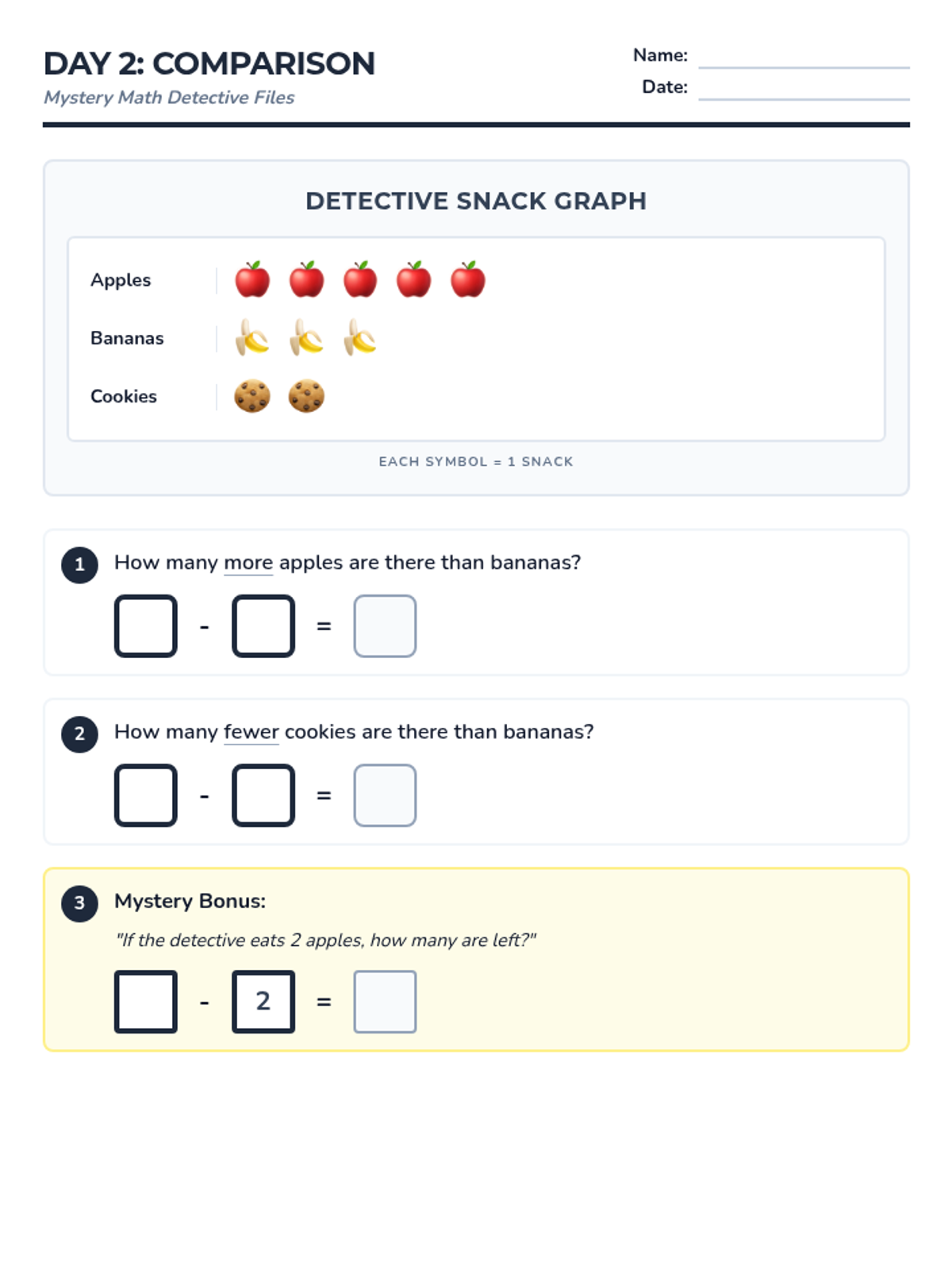 Focuses on comparison word problems (more than/fewer than) and mixed operations using picture graphs.
