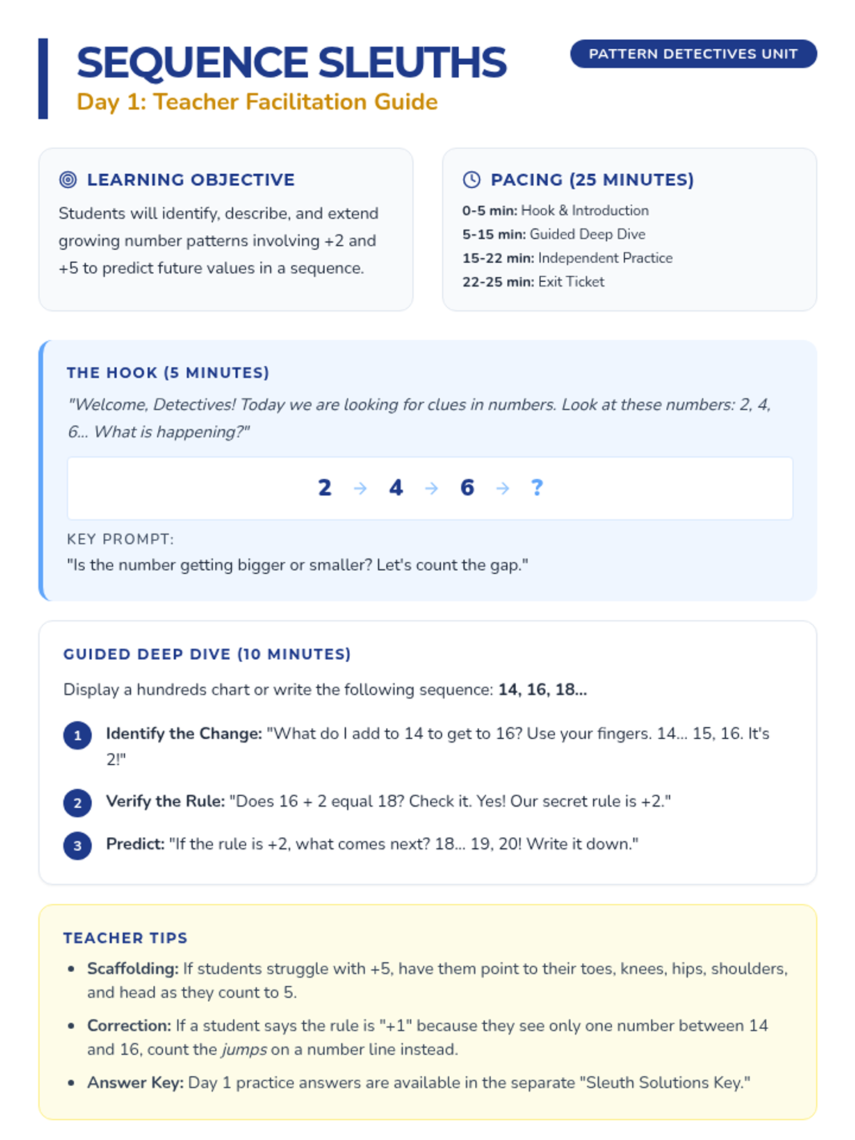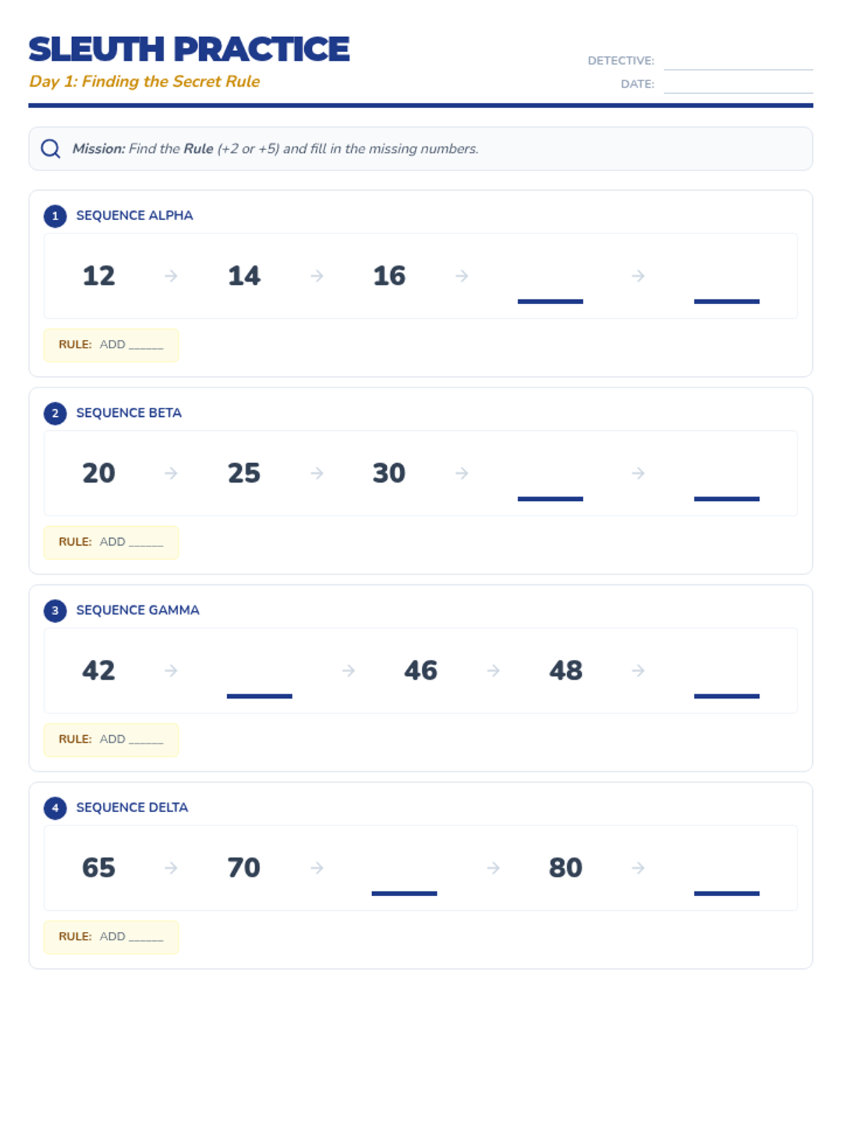 Focuses on identifying and extending growing number patterns, specifically rules involving adding 2 and 5, to build foundational algebraic thinking.
