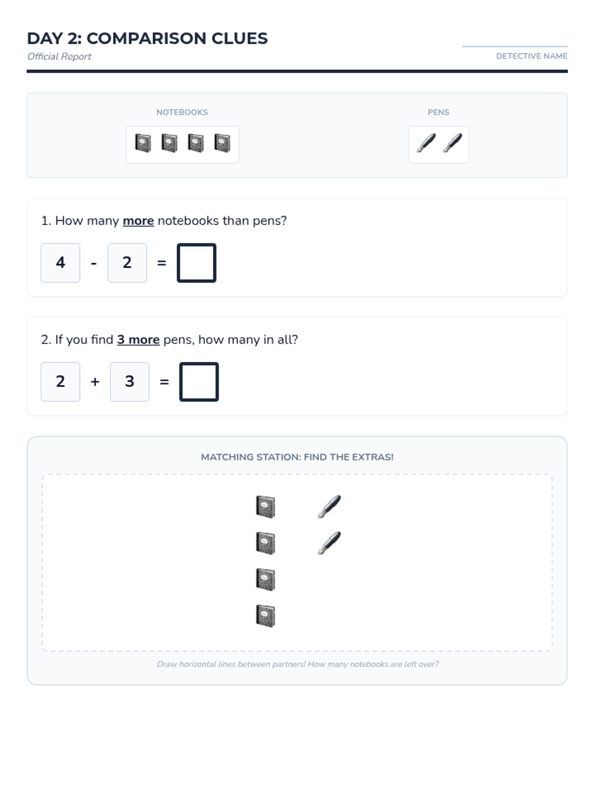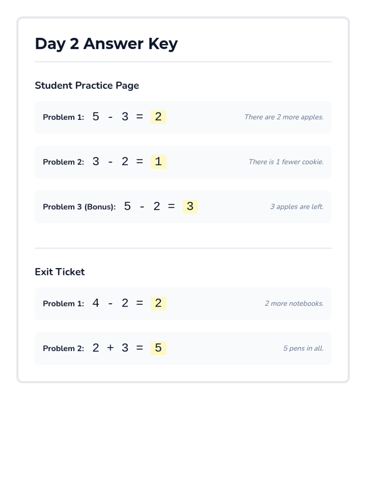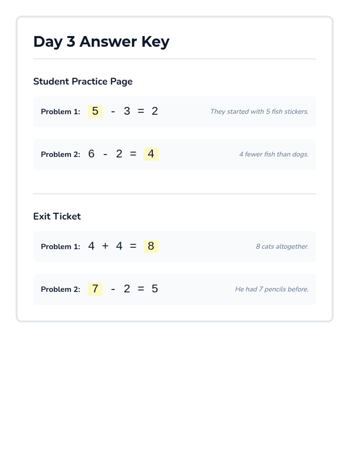 Focuses on subtraction word problems (separating) by marking 'X's on pre-drawn images. Students transition from visual crossing-out to writing subtraction number sentences.