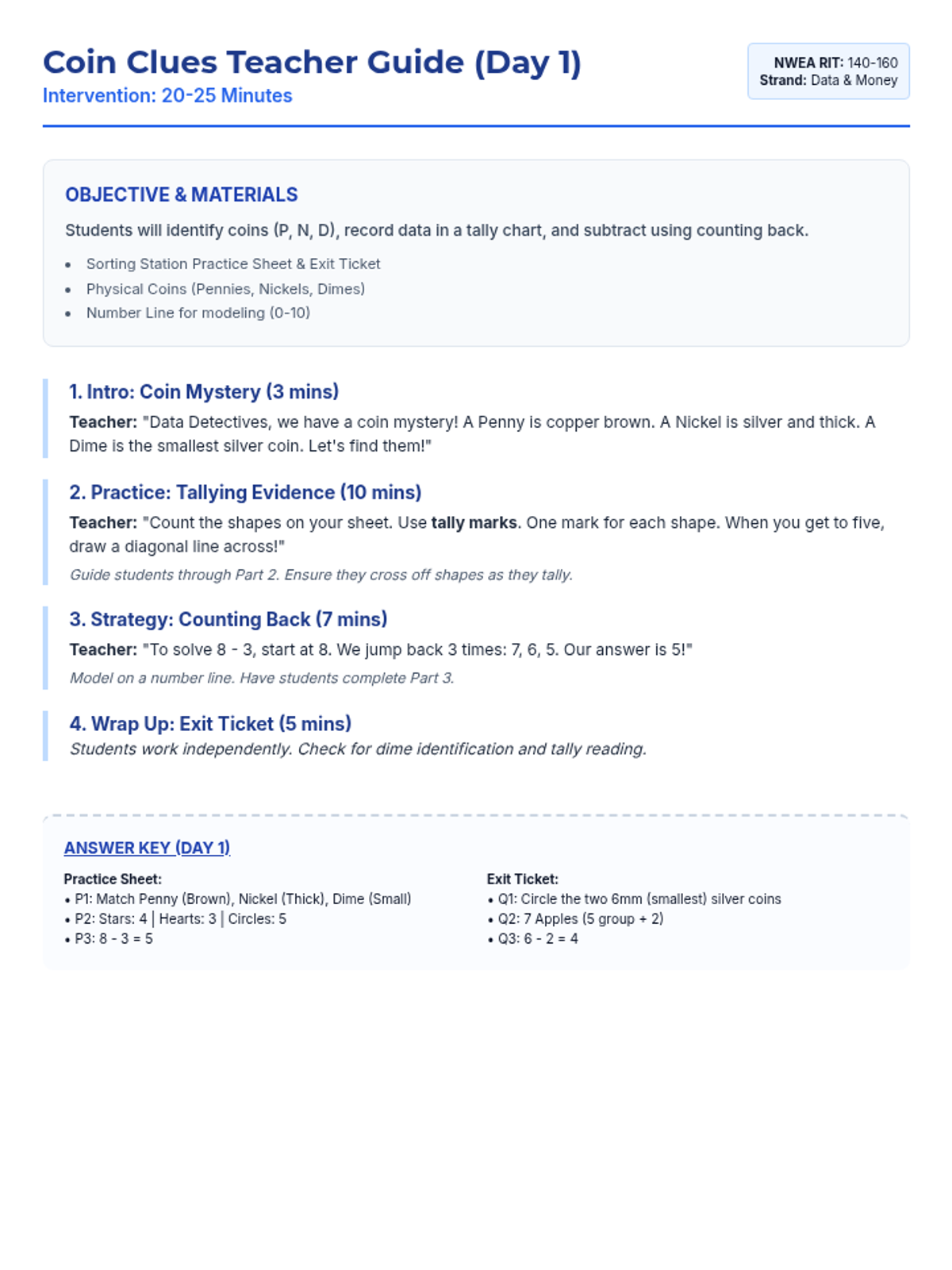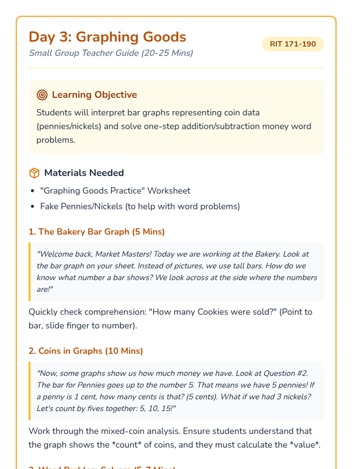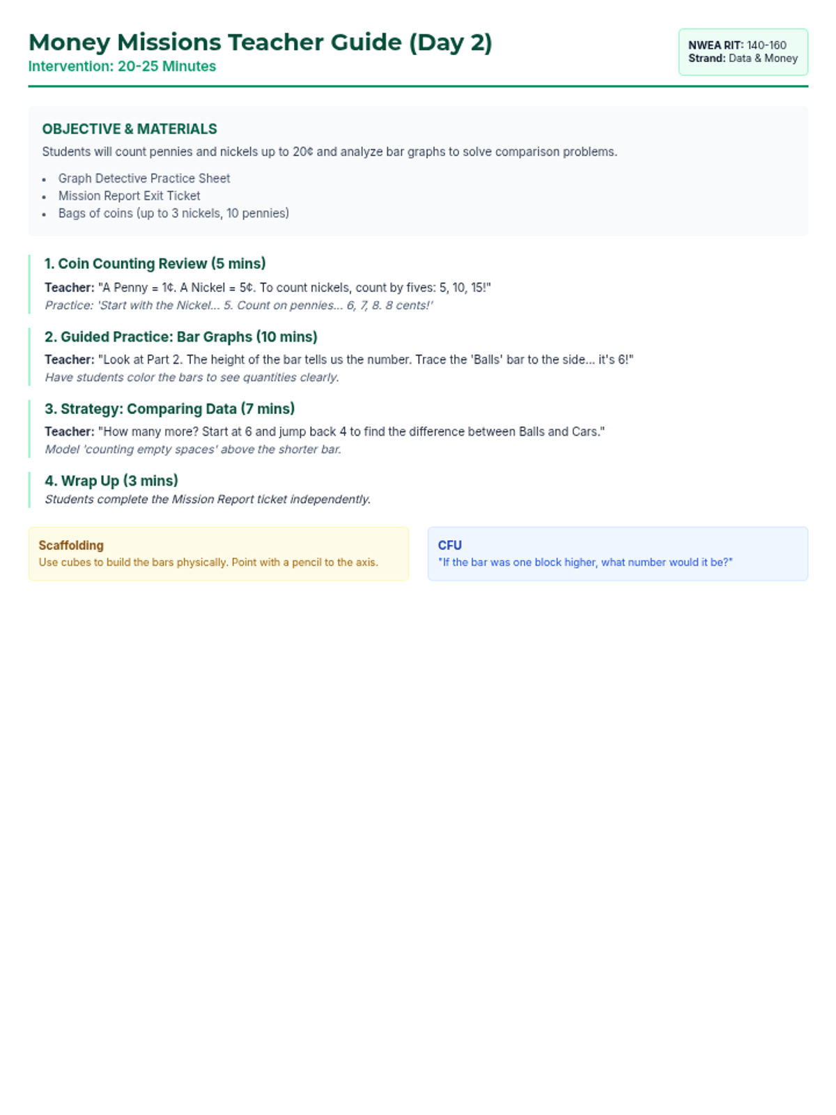 Students analyze bar graphs representing money values (pennies and nickels) and solve one-step word problems. This lesson integrates money counting with data interpretation to reach higher RIT band objectives.