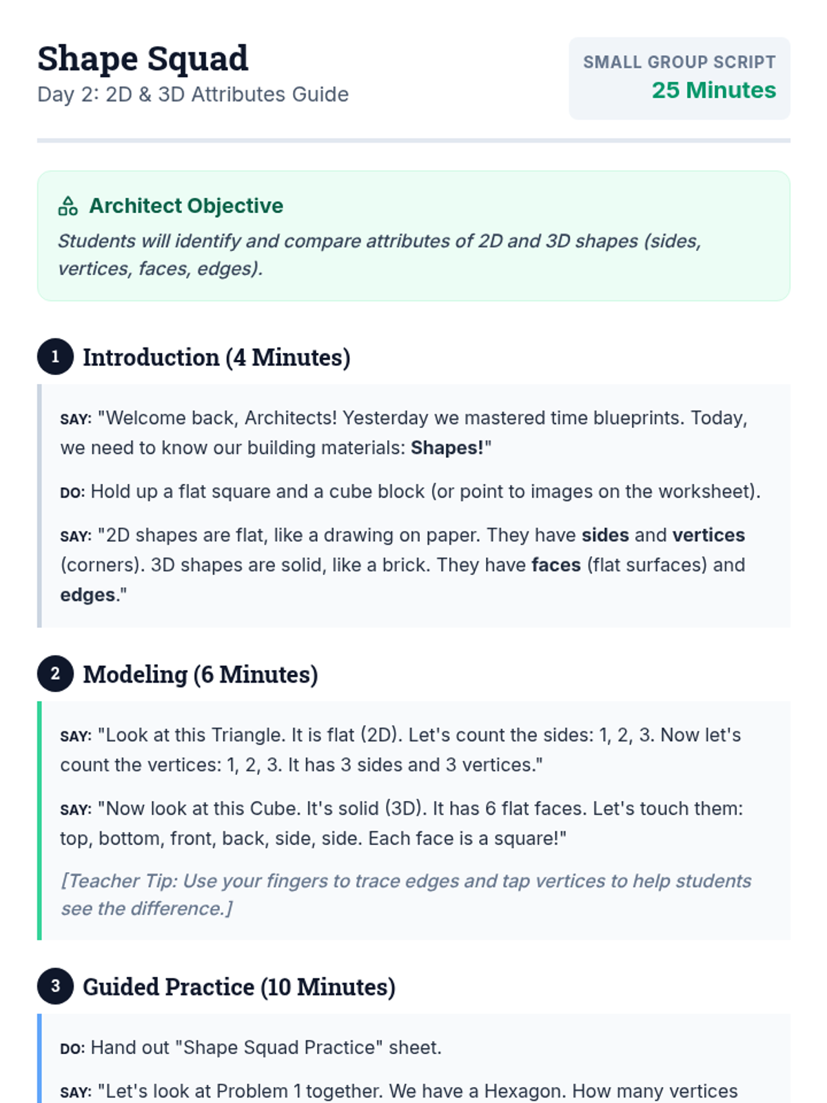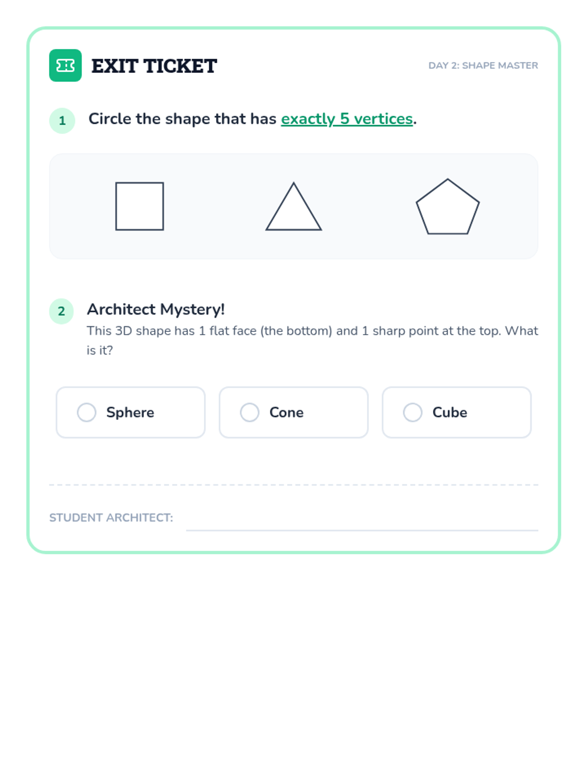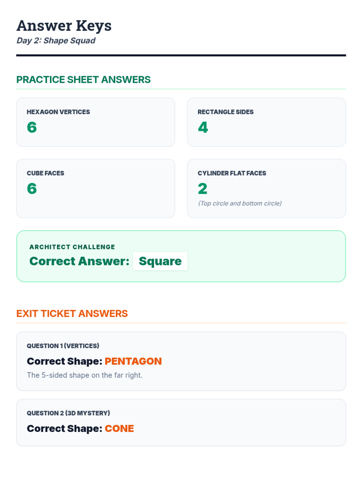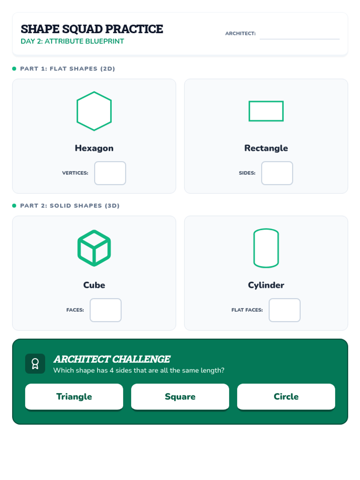 Identifying and describing defining attributes of 2D and 3D shapes, including sides, vertices, faces, and edges.