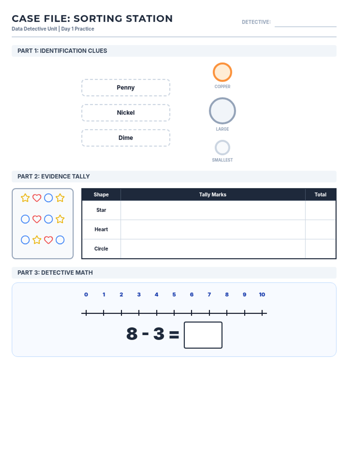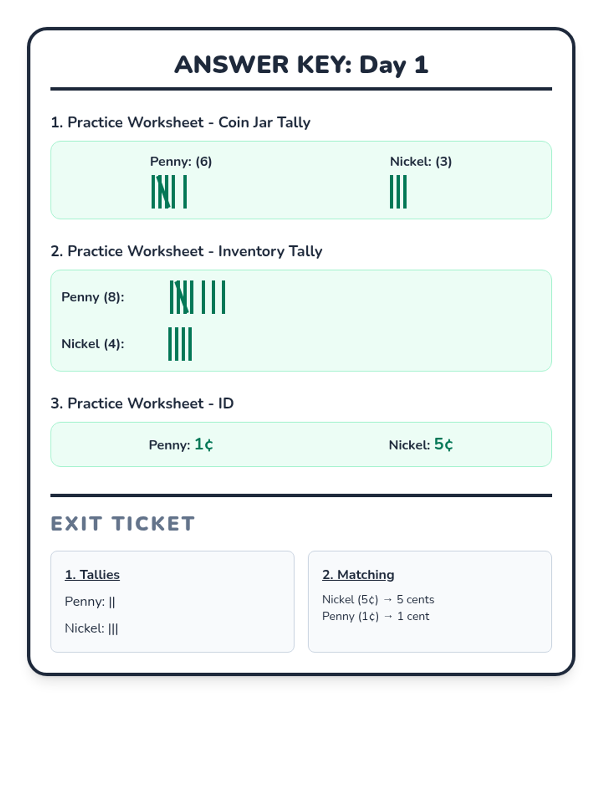 Students identify pennies and nickels, determine their values, and use tally charts to record inventory in a mock market setting. This lesson focuses on the transition from simple identification to organizing data.