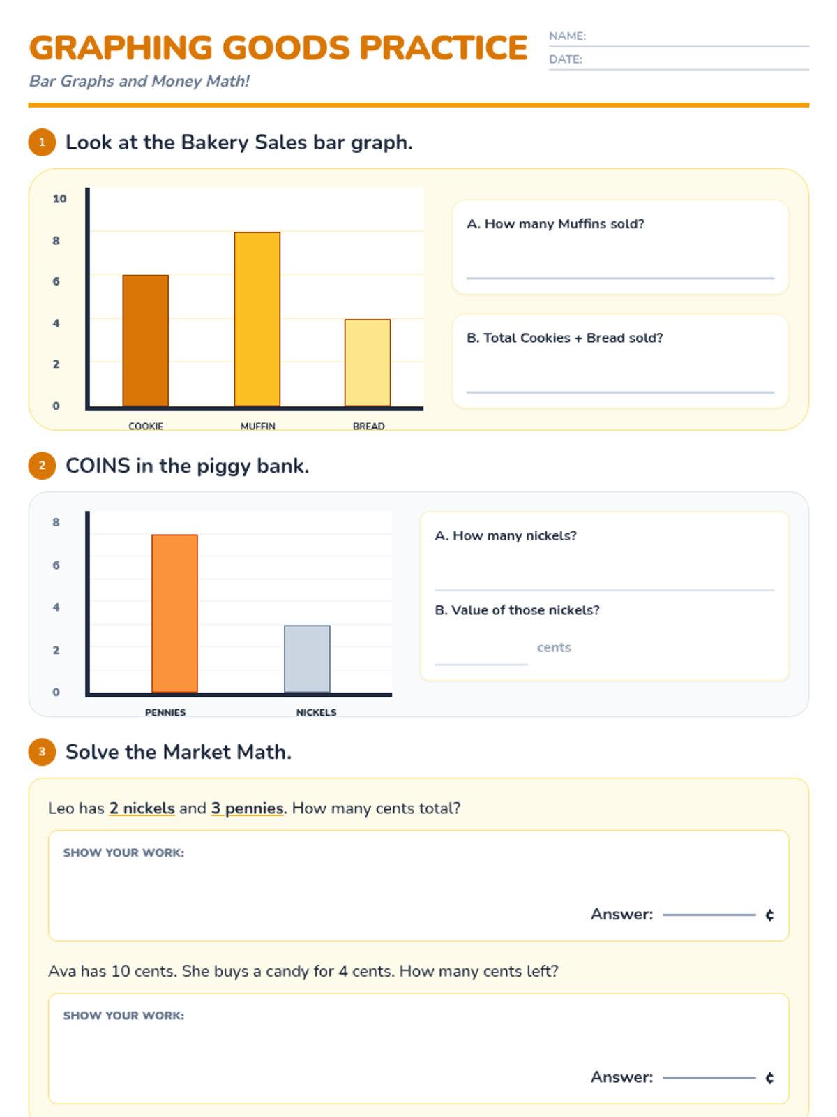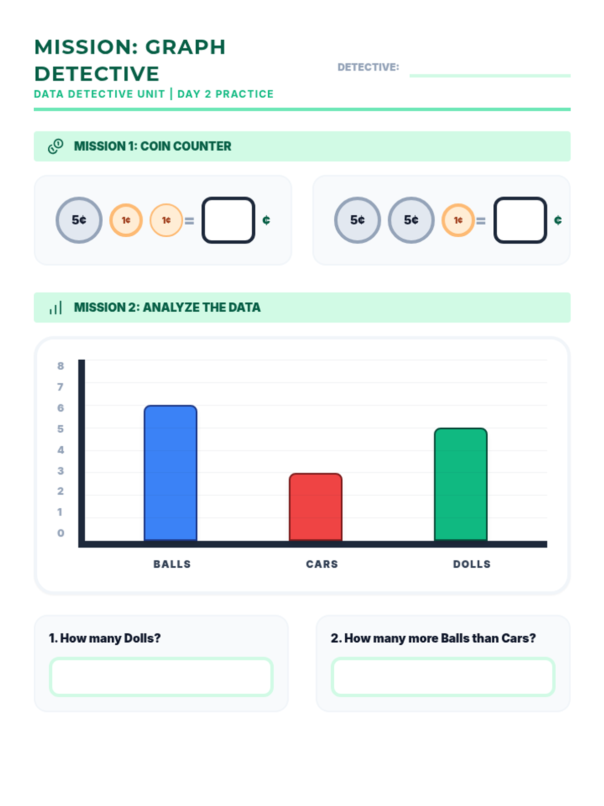 Focuses on bar graphs and comparing data. Students analyze categories and count collections of mixed coins.